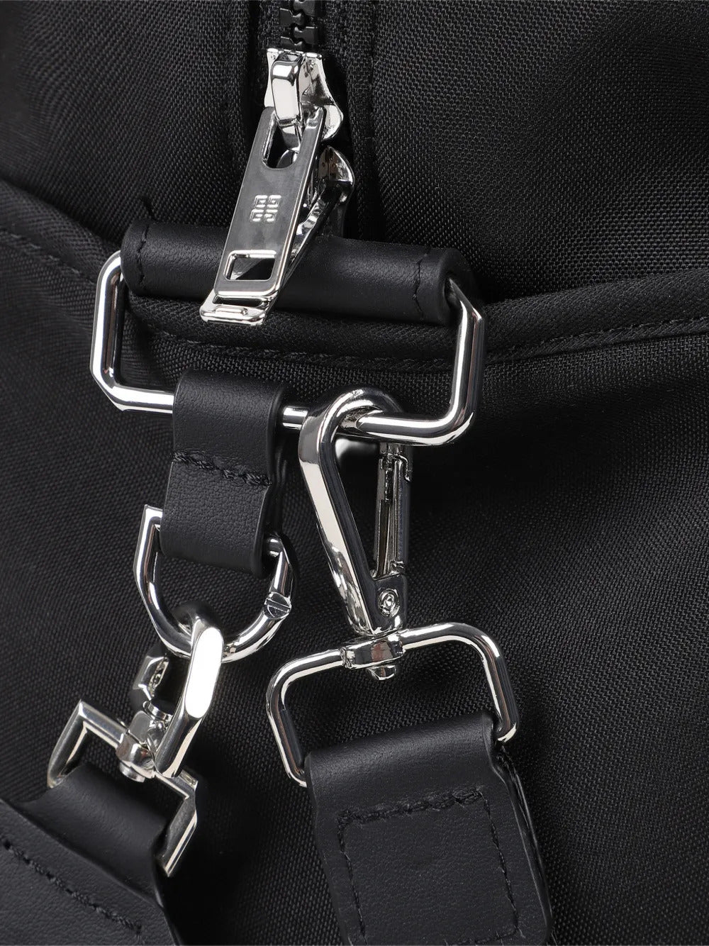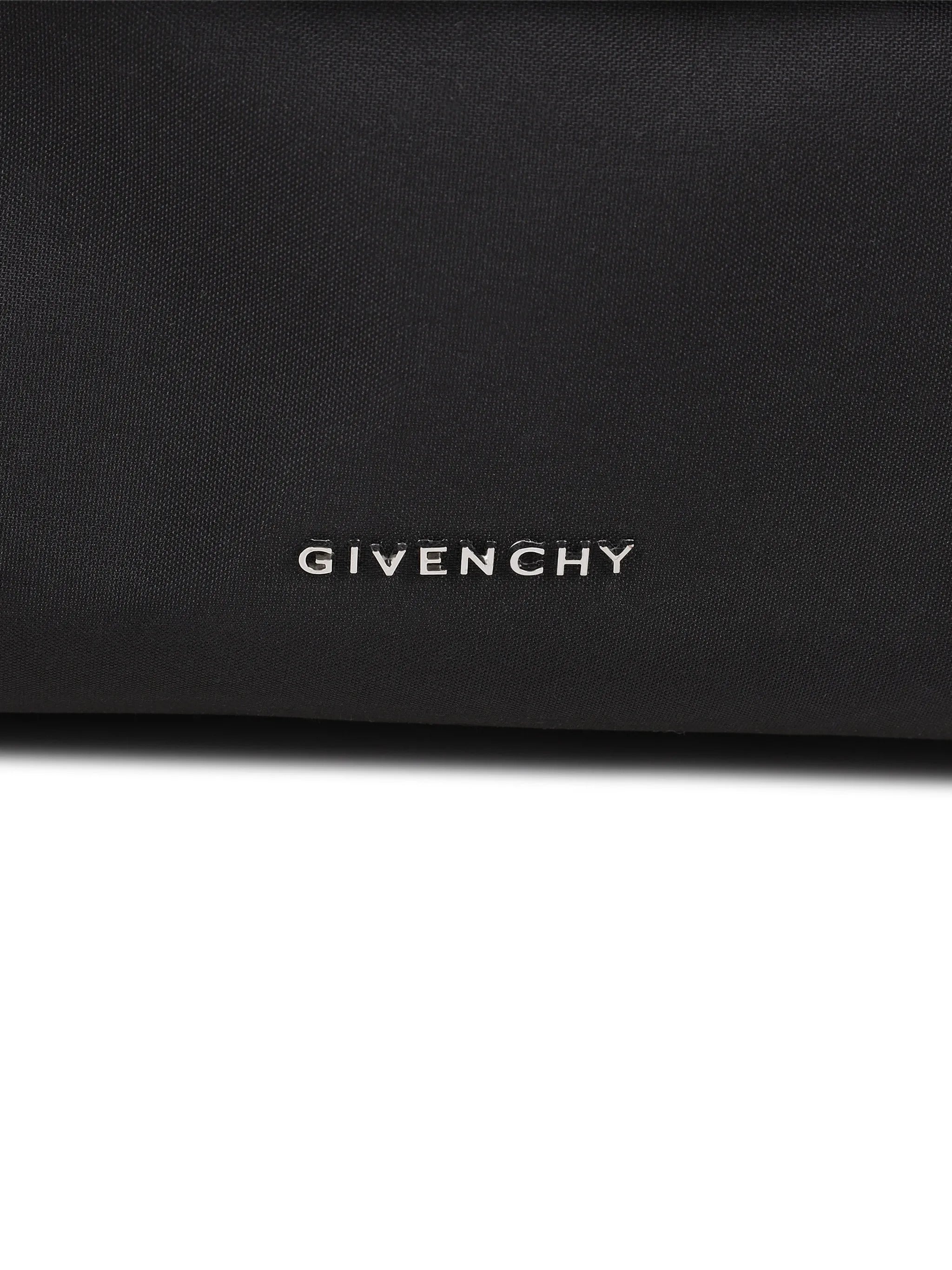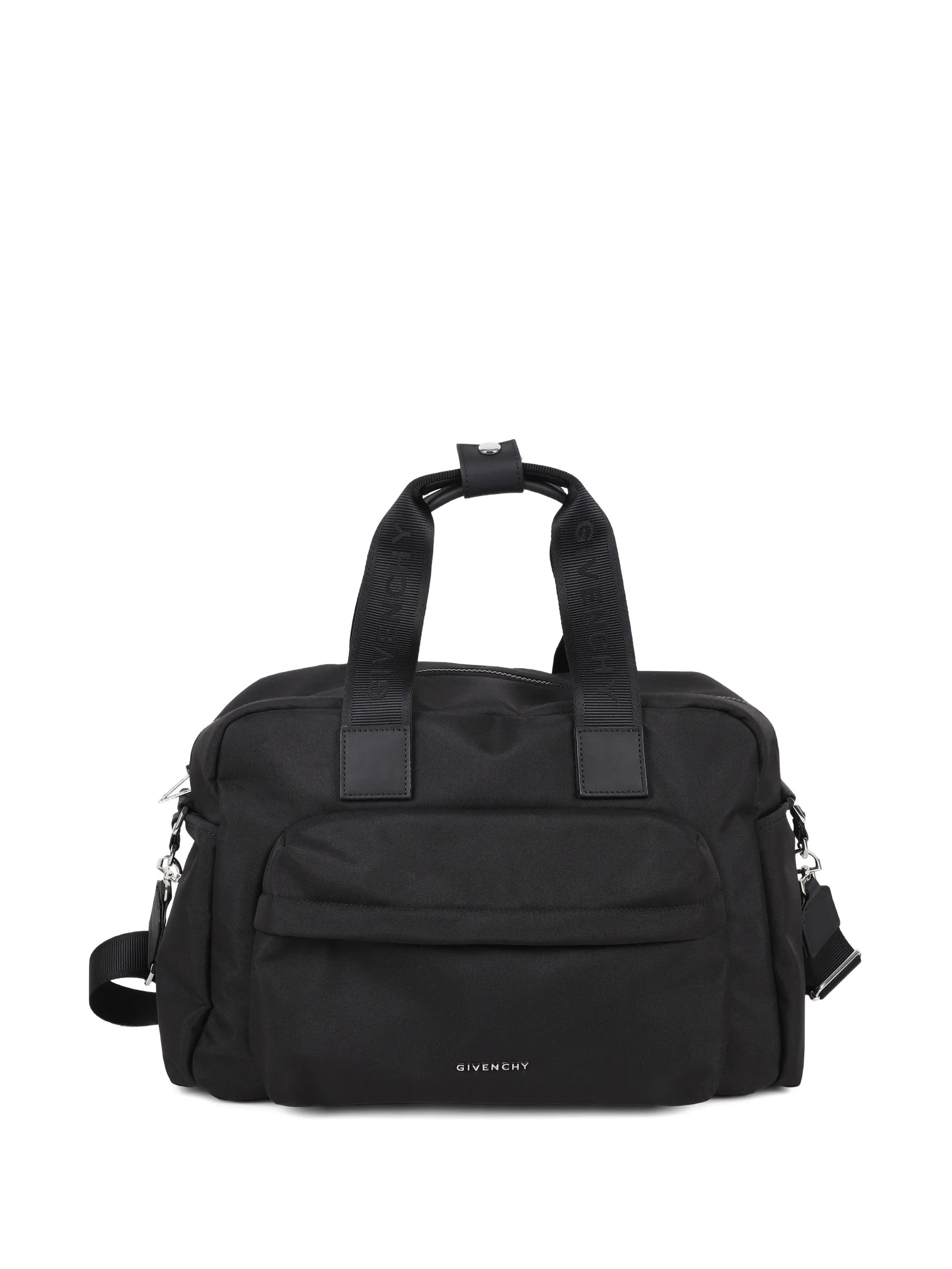 This sophisticated canvas changing bag from GIVENCHY KIDS combines luxury design with practical functionality for modern parents. Crafted from durable polyester with the signature metal lettering logo, this sleek black bag features dual top handles and an adjustable shoulder strap for versatile carrying options.