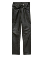 Crafted from supple black leather, these full-length trousers feature a distinctive studded belt detail at the waist that adds a touch of rock-and-roll glamour to the sleek silhouette. The luxurious leather construction ensures both durability and a flattering fit that moves with you.