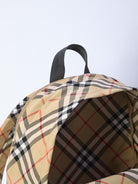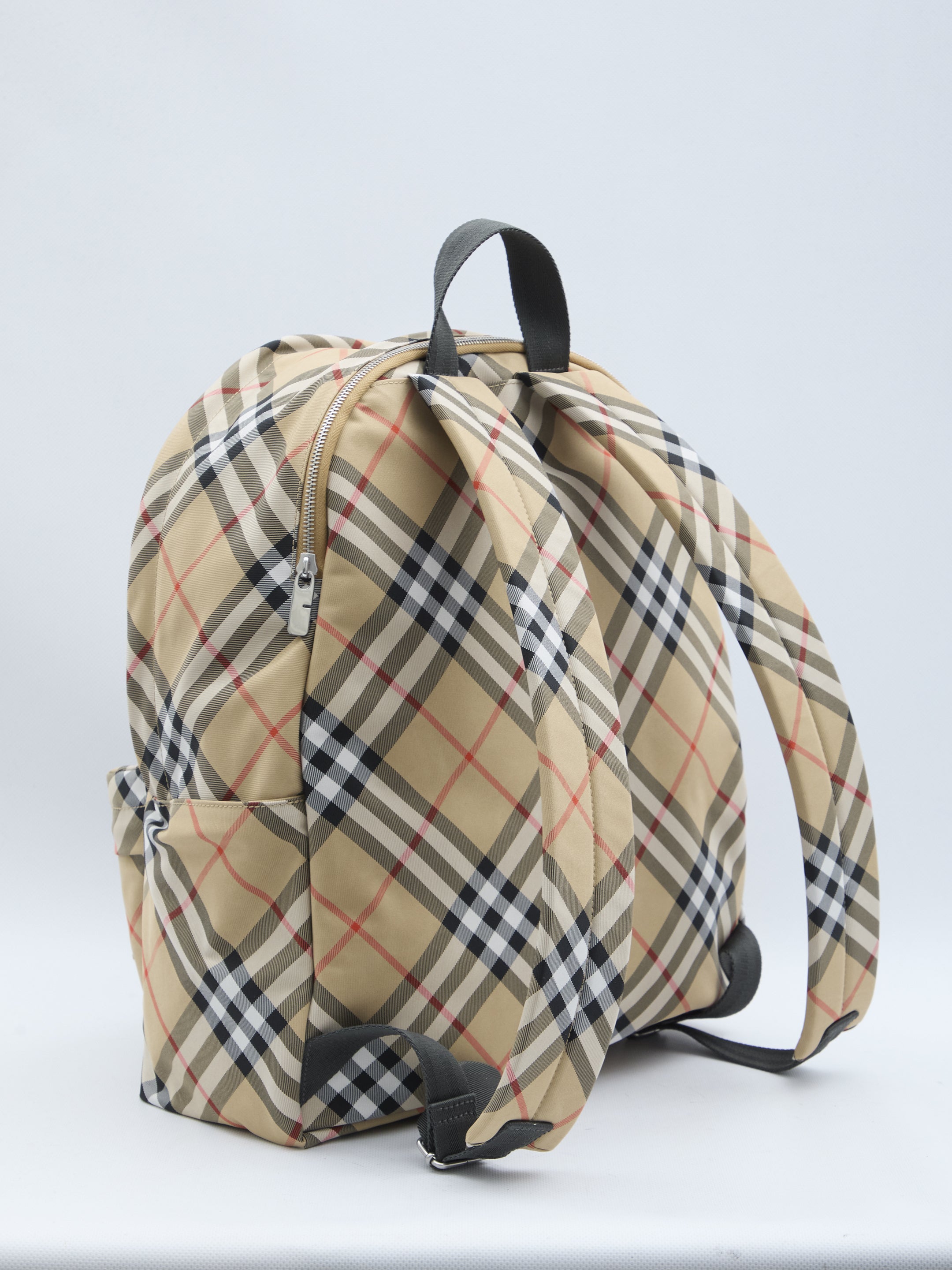 Beige backpack in Burberry Check fabric with Equestrian Knight Design patch. It features fixed top handle, adjustable shoulder straps, one front zip pocket, one top zip pocket, two-way zip closure, one main interior compartment and two exterior side slip pockets.