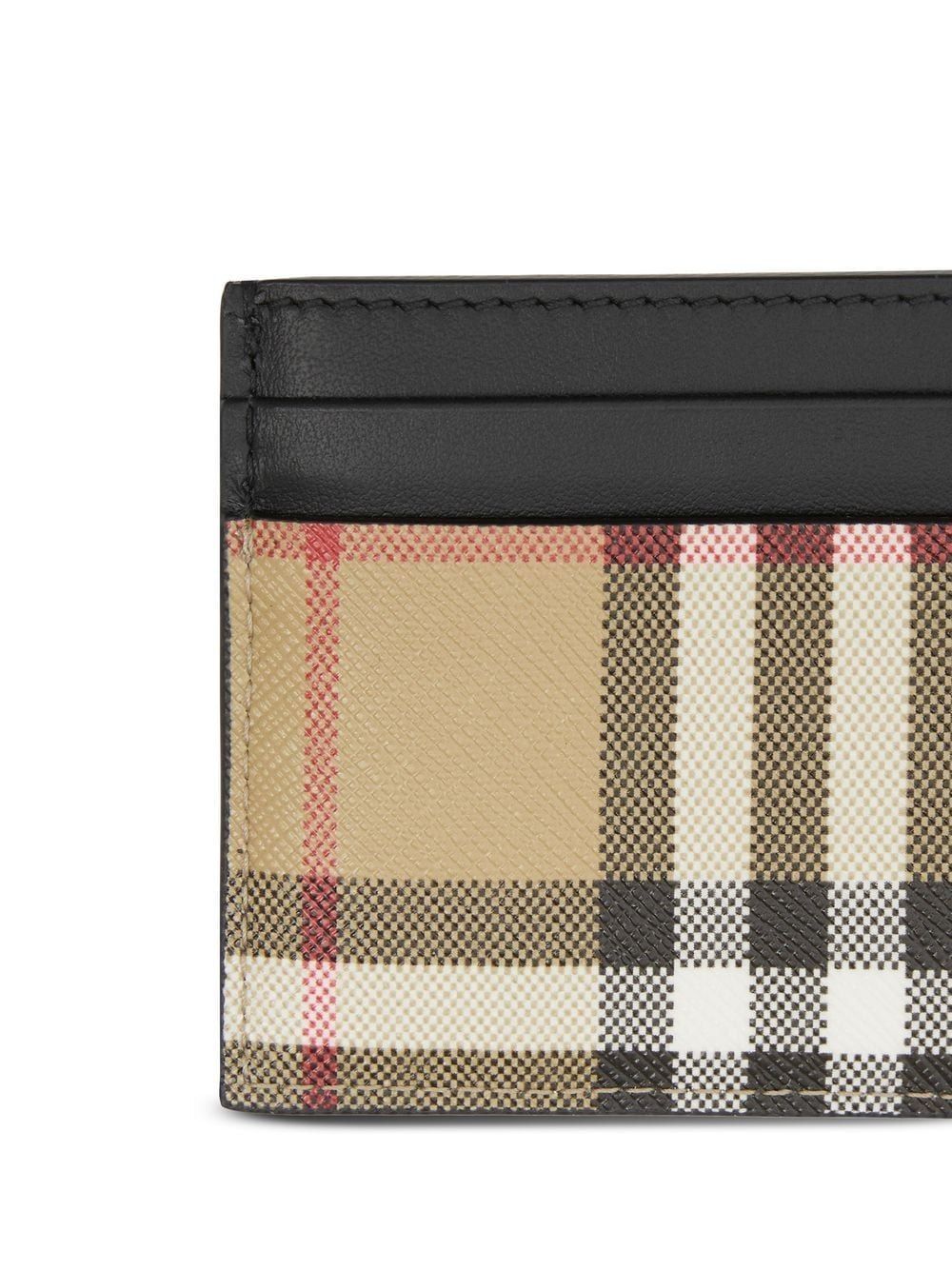Crafted from premium leather and signature check fabric, this compact accessory offers four card slots and one internal pocket for streamlined organization. The timeless beige check pattern paired with sleek black leather trim creates a refined aesthetic that effortlessly transitions from day to evening.