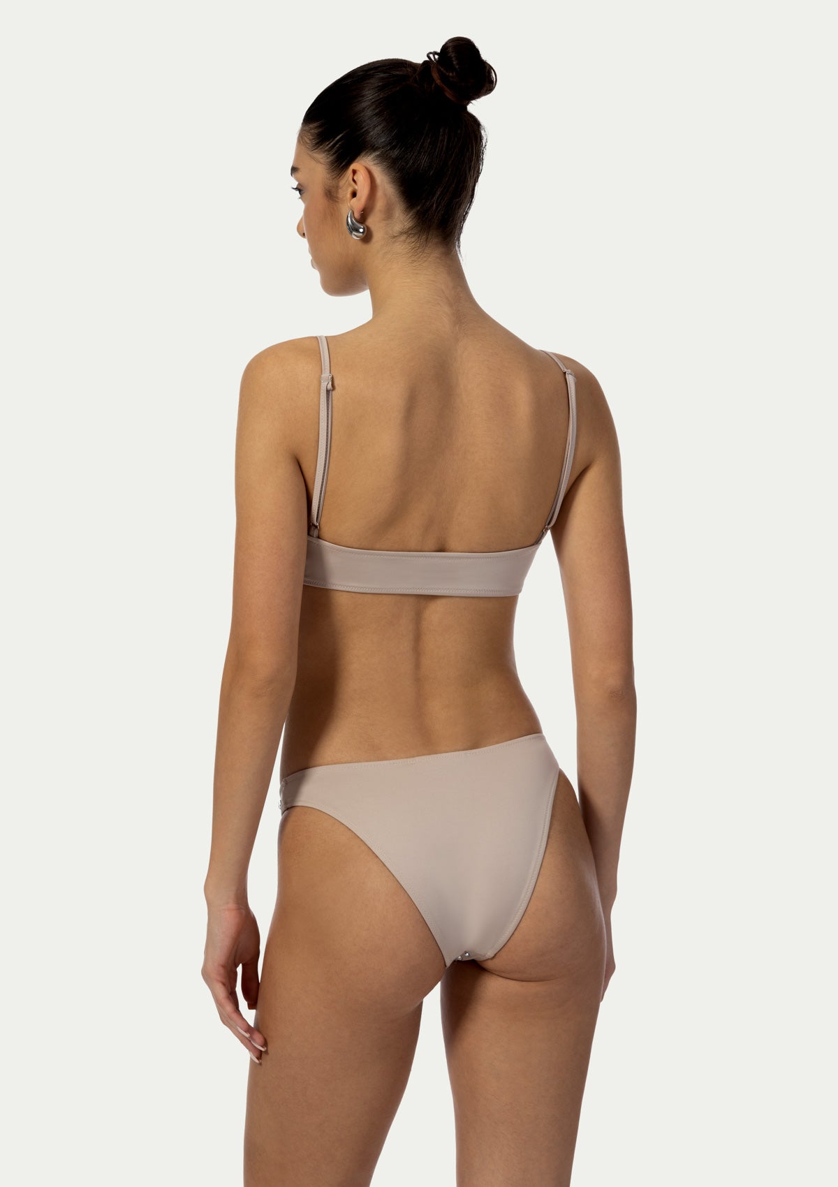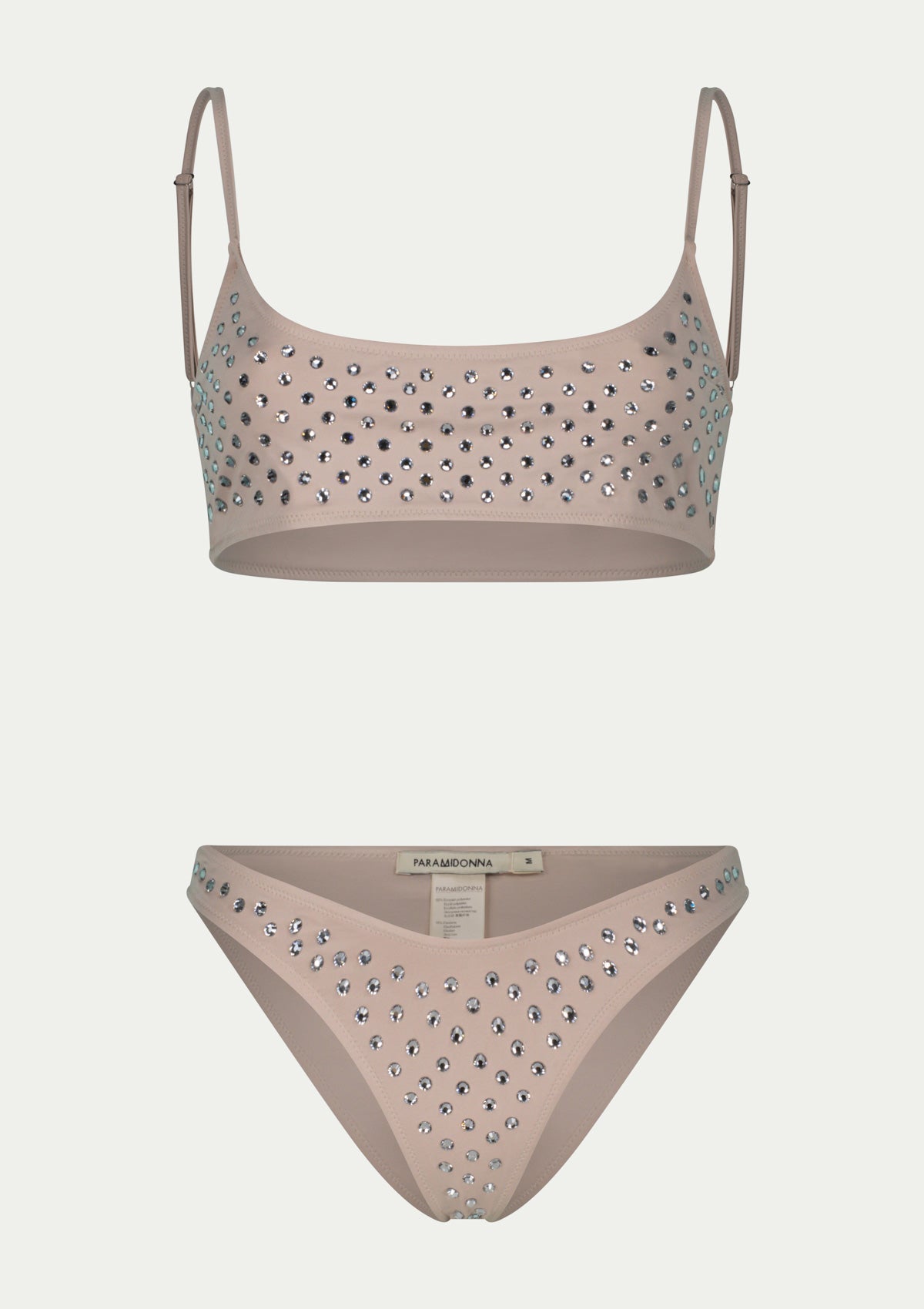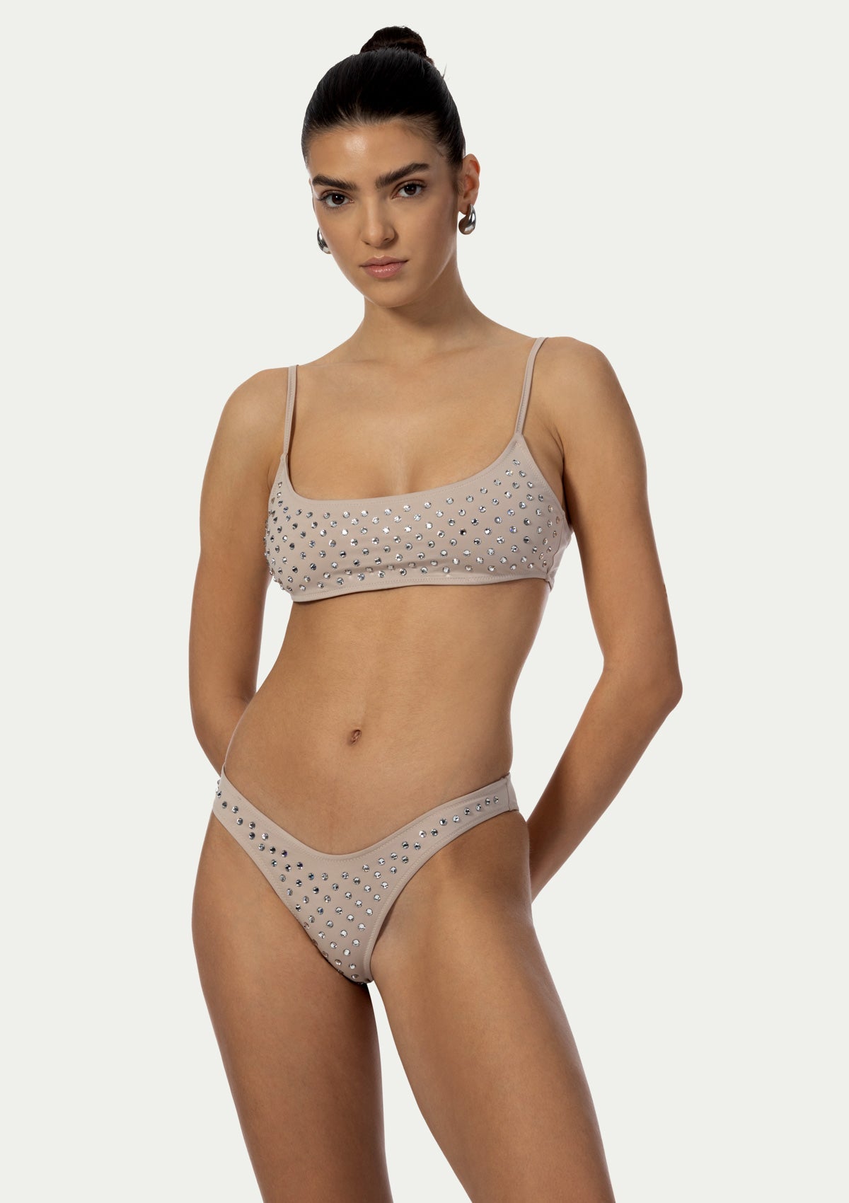 A radiant blend of sustainability and sophistication, the CHIARA swimsuit set is crafted entirely from fully recycled Lycra. Adorned with over 200 meticulously placed SWAROVSKI crystals, this radiant design catches the sunlight with every movement, creating an unforgettable, shimmering silhouette. The top is designed in a sleek, sport-inspired bustier style, featuring adjustable straps, providing tailored support and effortless elegance. Complemented by flattering V-front cut bikini bottoms with moderate coverage, that beautifully defines the waist. Combining elegance, comfort, and luxurious detailing, the CHIARA model is perfect for those who seek timeless glamour with a modern, conscious twist.