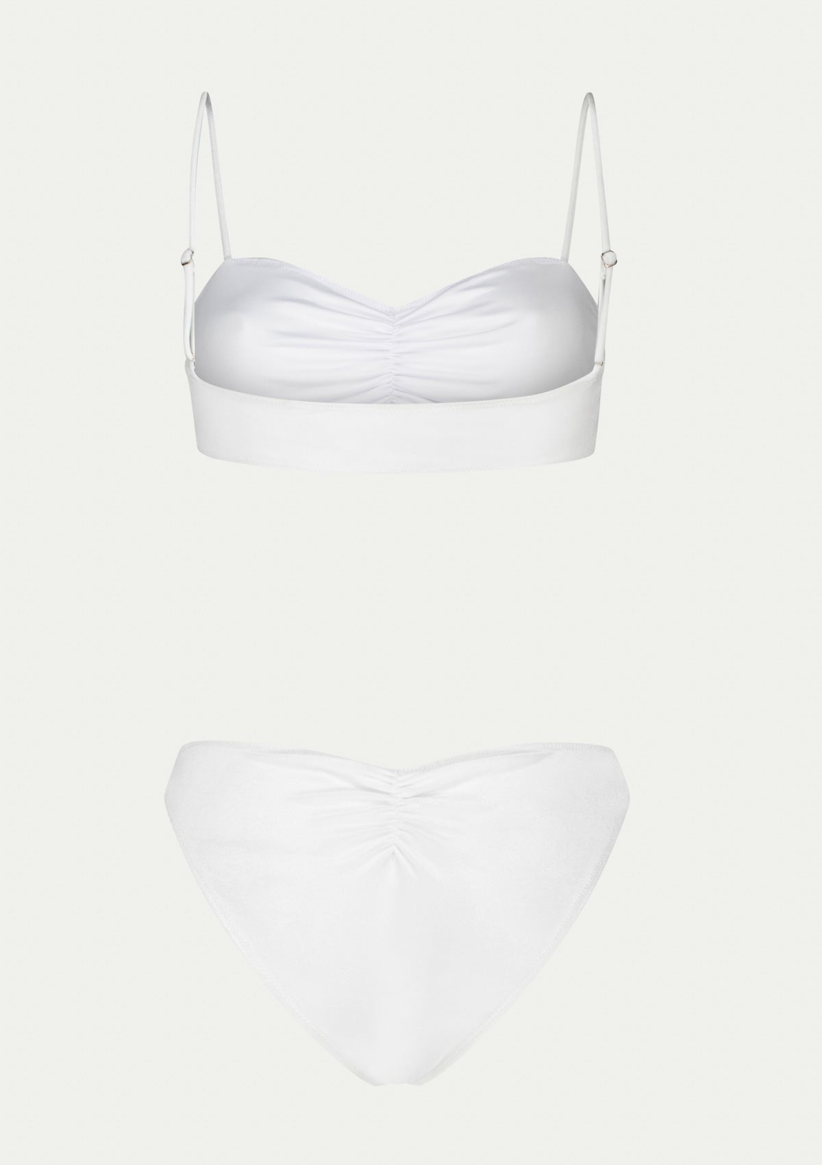 The CHIARA VELVET swimsuit set redefines poolside elegance with a modern twist. The bustier-style top is artfully gathered at the center to enhance the bust, while slender adjustable straps ensure a flattering and secure fit. The bottom features a sleek V-shaped Brazilian cut with a low-rise waist and mid-coverage, offering a harmonious balance of allure and comfort. Crafted from exceptionally soft, fast-drying velvet-touch fabric, this set brings a touch of luxury to every sun-drenched escape.