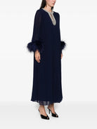 The dress is elevated by dramatic ombré feather cuffs that add texture and movement, creating an unforgettable statement. The midi length offers elegant coverage while maintaining a modern silhouette, perfect for cocktail parties, wedding celebrations, or any special evening occasion.
