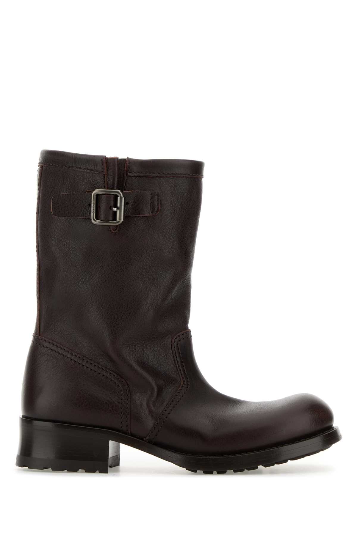 Elevate your everyday style with these luxurious Prada chocolate leather ankle boots. Crafted from supple leather with a distinctive buckle detail, these boots feature a comfortable block heel and a versatile mid-calf silhouette. The rich chocolate brown hue pairs effortlessly with everything from denim to dresses, making them a sophisticated staple for your wardrobe. Perfect for transitioning from day to night, these Italian-crafted boots combine timeless elegance with modern functionality. Prada brings impeccable craftsmanship and refined luxury to this essential cold-weather style.