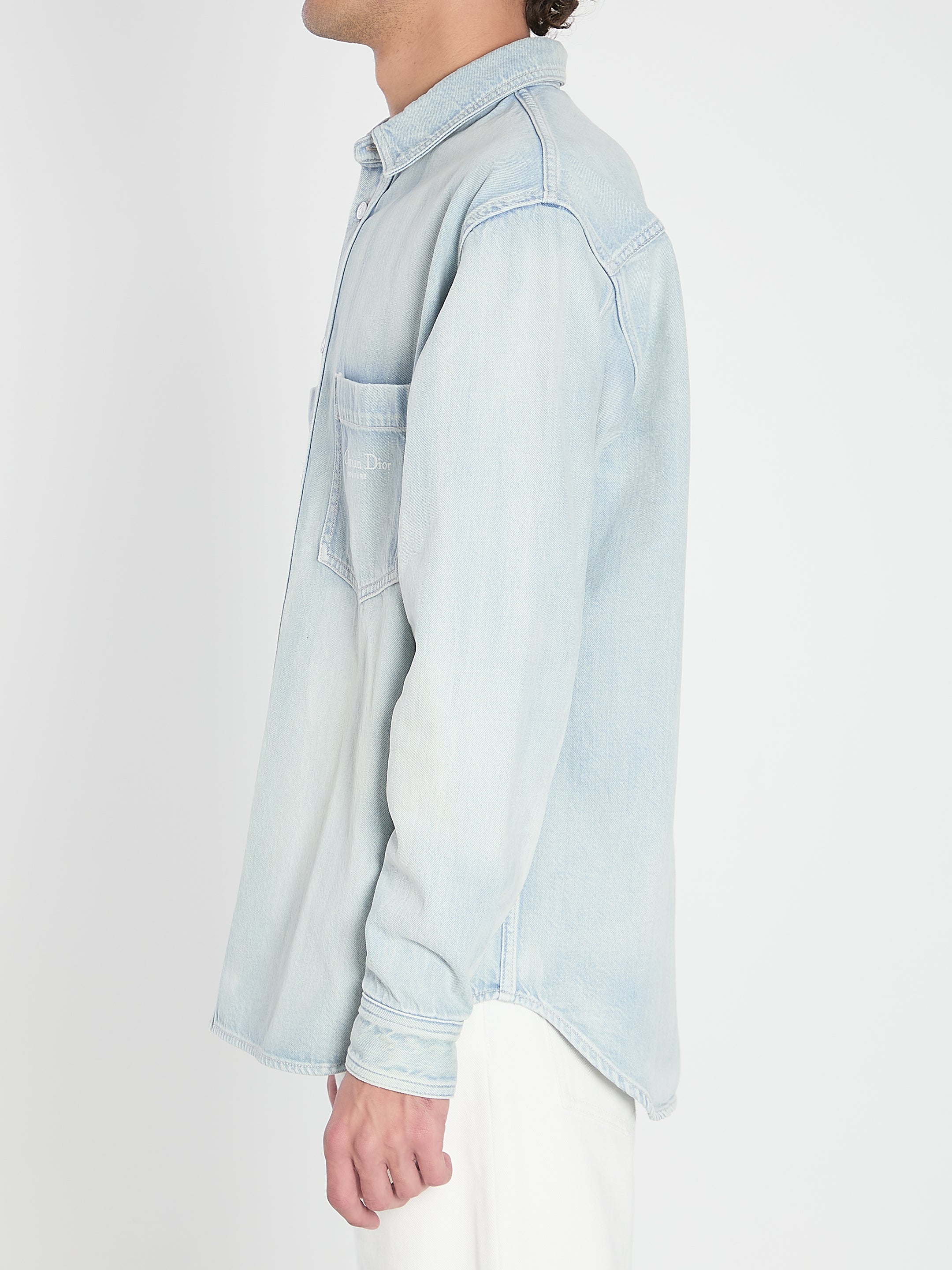 Shirt in blue cotton twill. Features button closure, two chest pockets, and Christian Dior Couture embroidery on the left pocket.