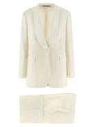 This luxurious set features a single-breasted blazer crafted in stretch wool blend with tone-on-tone satin details, showcasing a flattering shawl collar, structured shoulders, and long sleeves. The coordinating wide-leg pants complete the look with their straight silhouette and refined pleating.