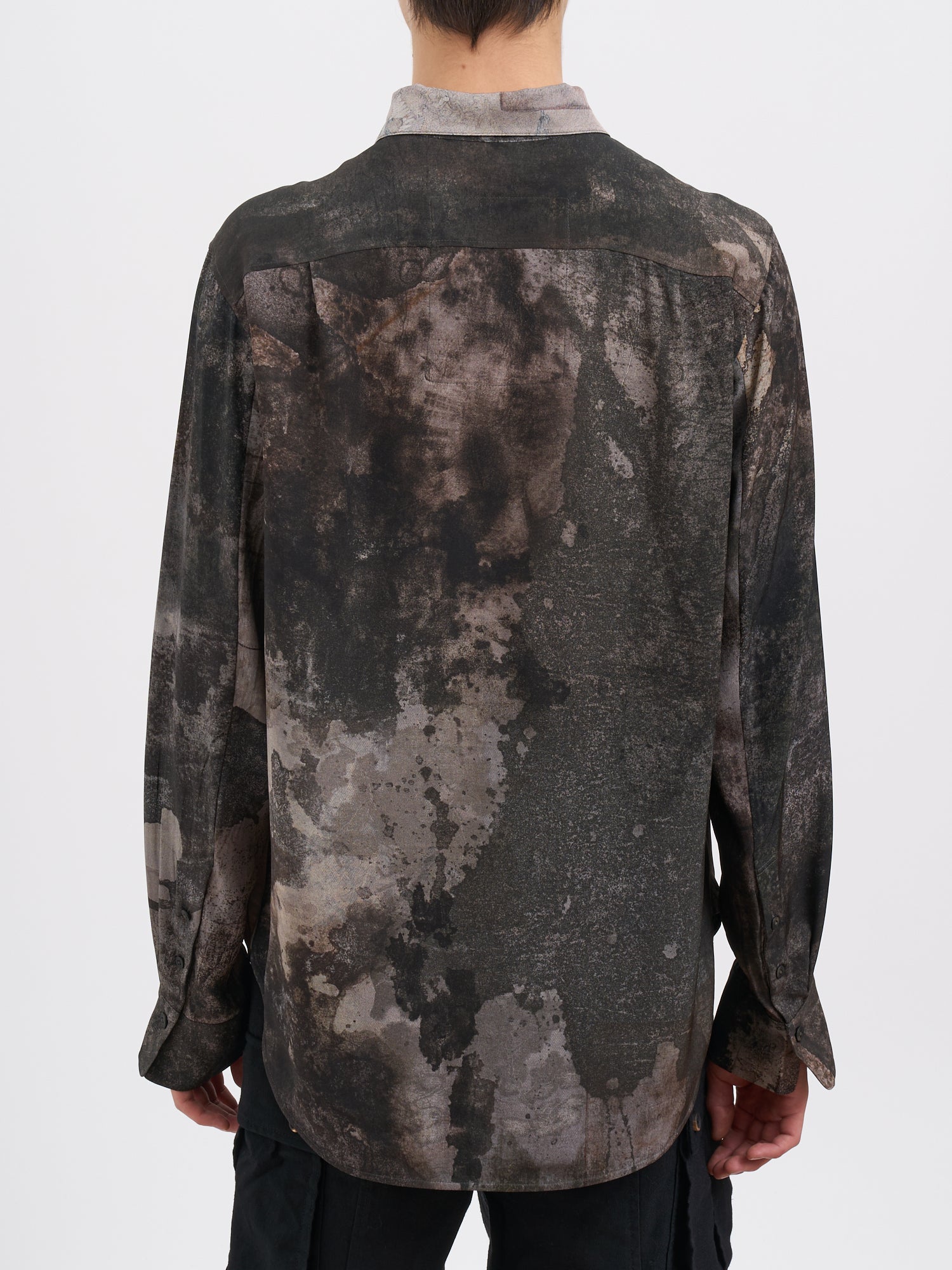 The relaxed, oversized silhouette offers effortless comfort while maintaining a sophisticated edge. Perfect for the modern man who appreciates avant-garde design, this shirt transitions seamlessly from casual daytime wear to elevated evening occasions.