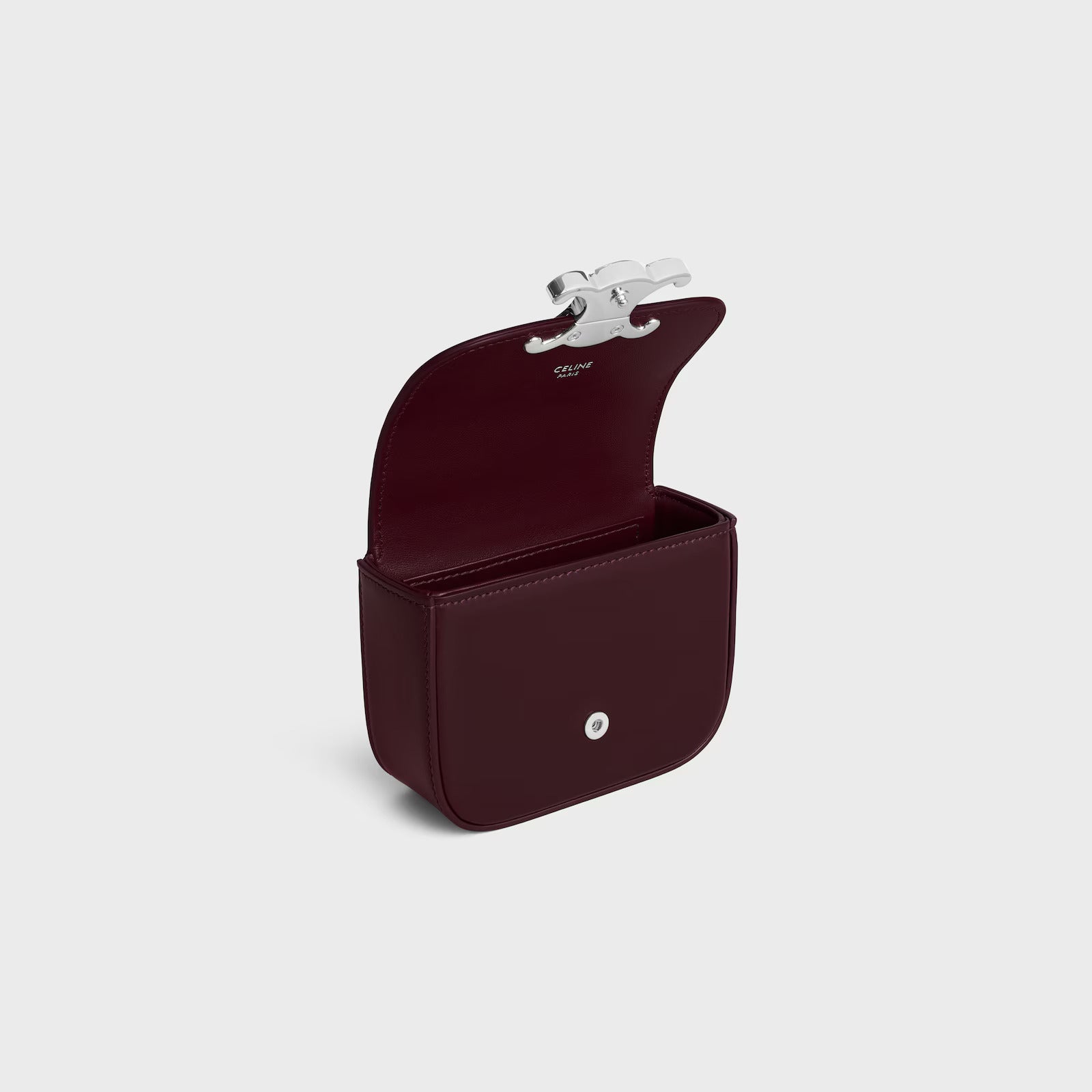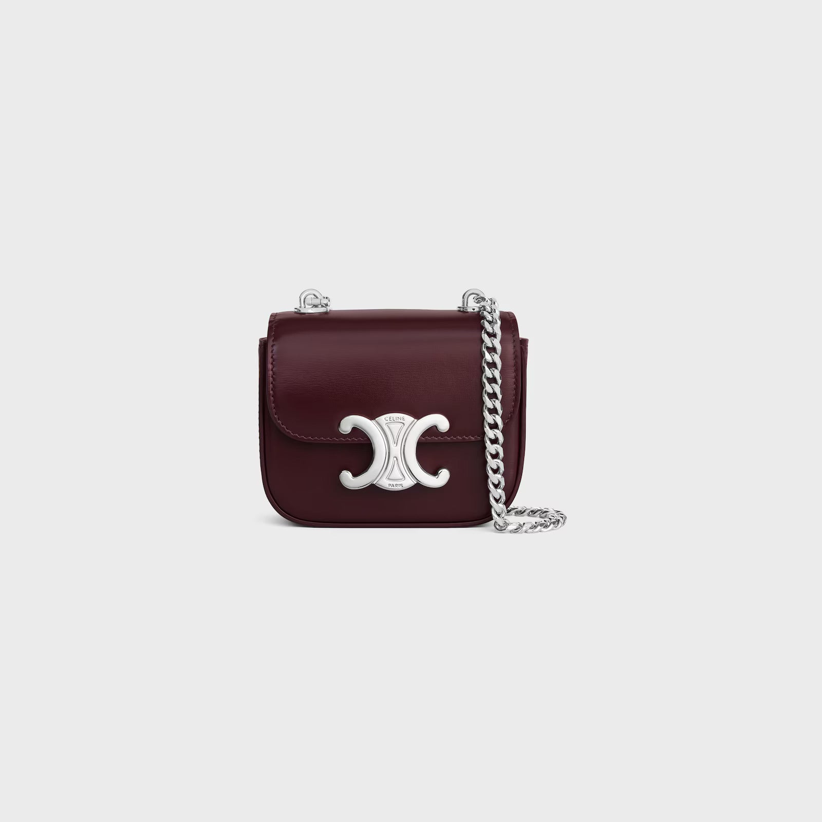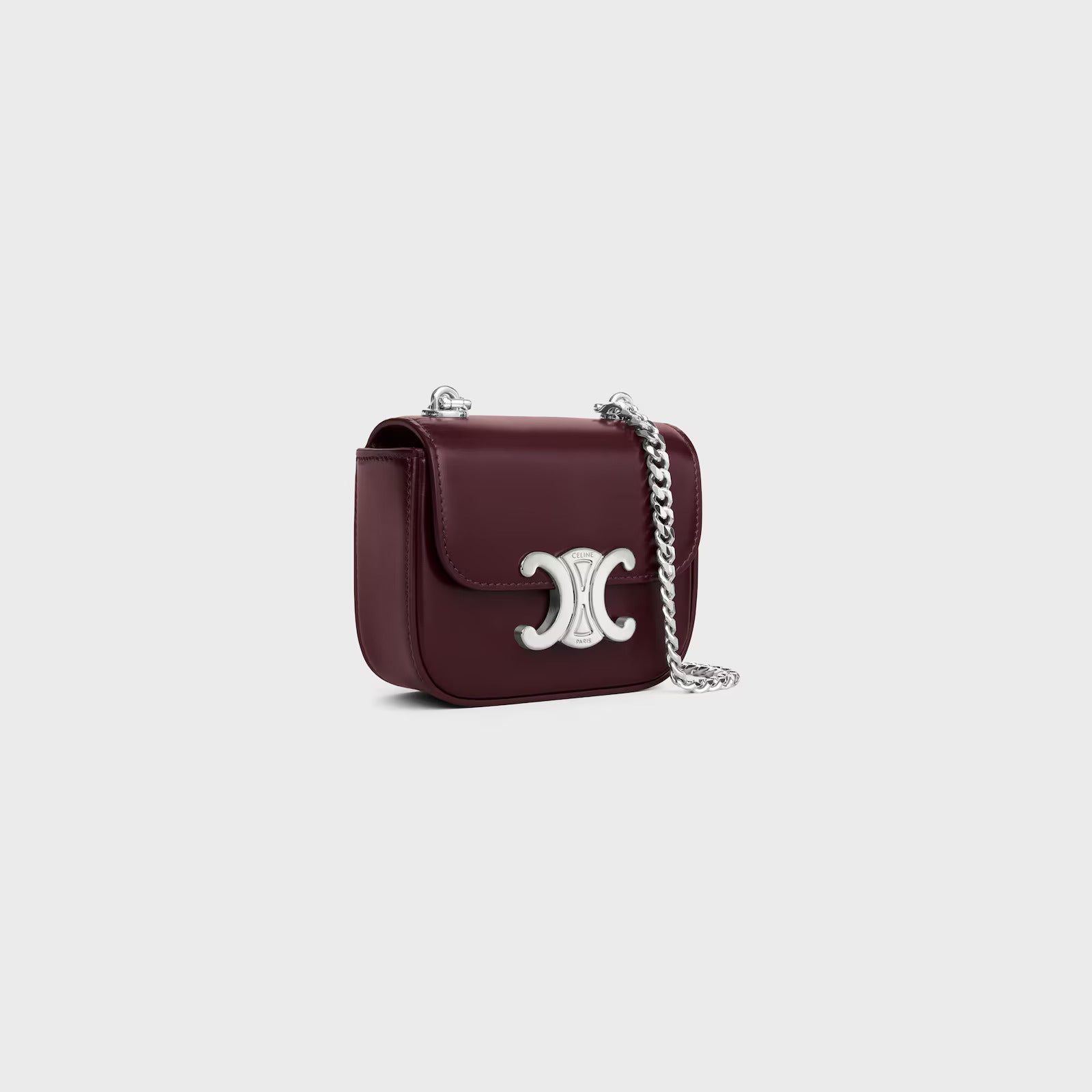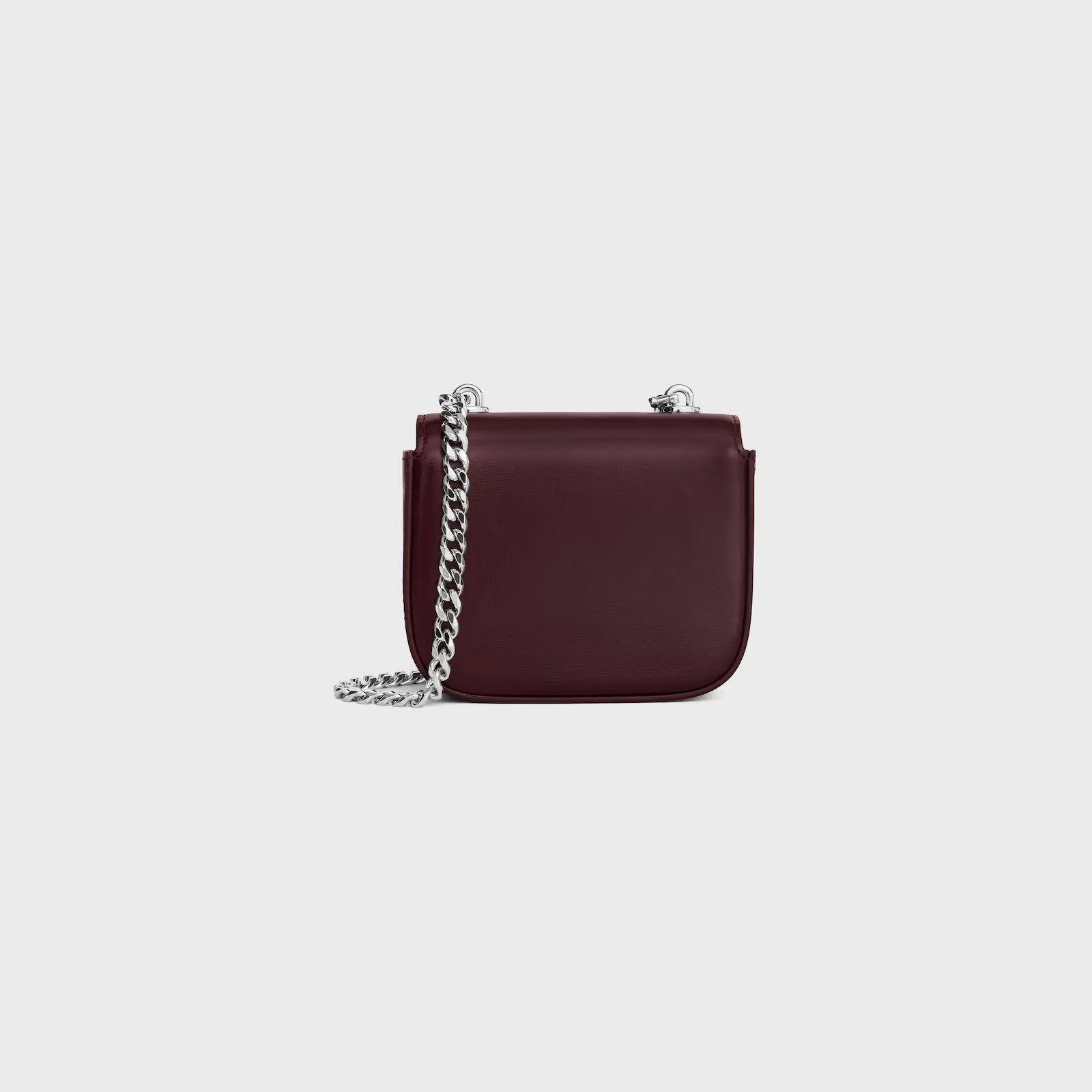 This exquisite mini bag features a rich burgundy leather exterior with distinctive silver-toned Celine hardware that serves as both a striking focal point and secure closure. The sleek chain strap allows for versatile wear as a crossbody or shoulder bag, making it perfect for transitioning from day to evening.