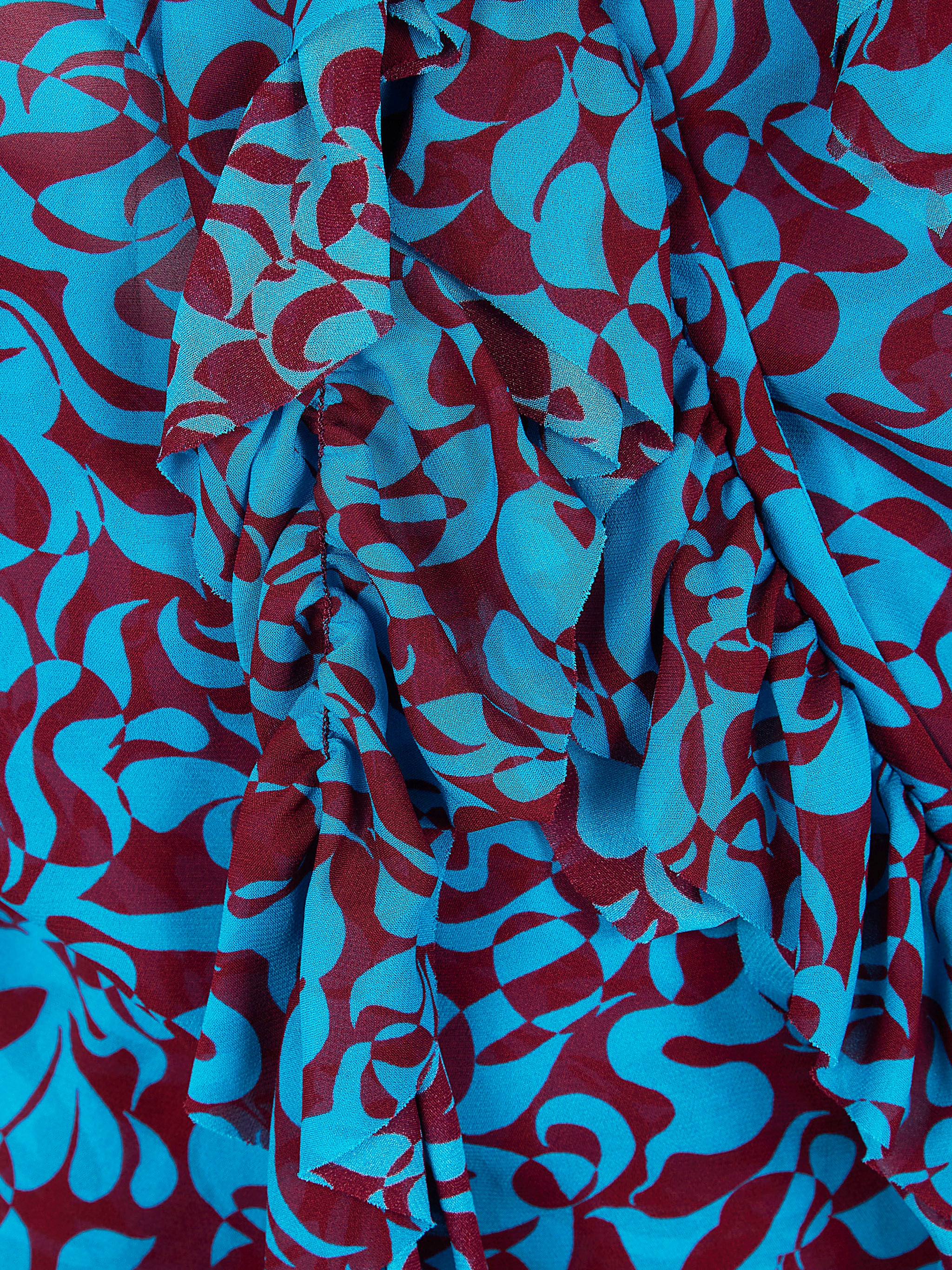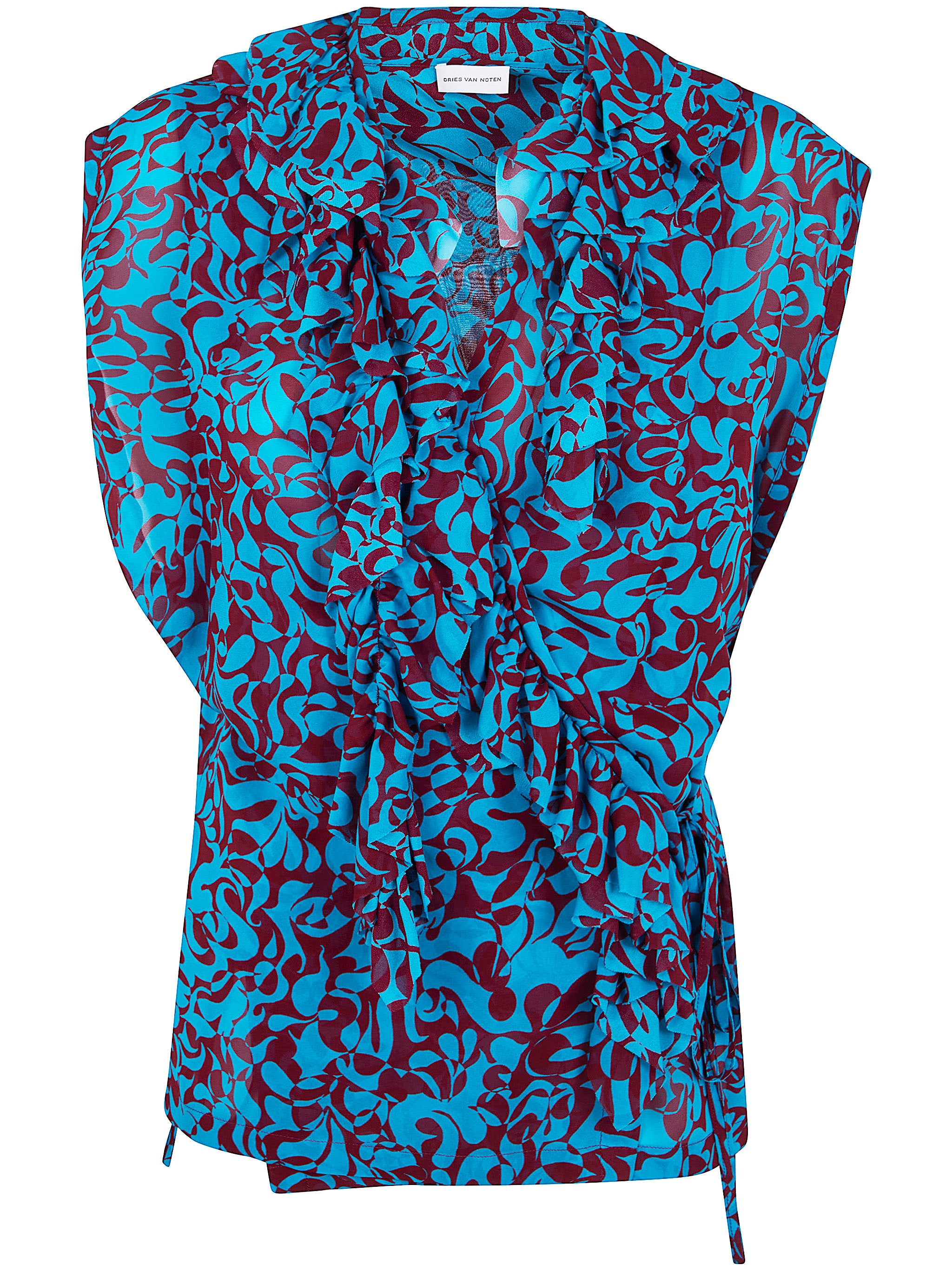 Make a bold statement with the "Clematis" Blouse by Dries Van Noten. This striking sleeveless top features a vibrant turquoise and burgundy abstract print that brings artistic flair to your wardrobe. Crafted from 100% canvas for a structured yet comfortable feel, the blouse showcases gathered detailing at the neckline and adjustable side ties for a customizable fit.