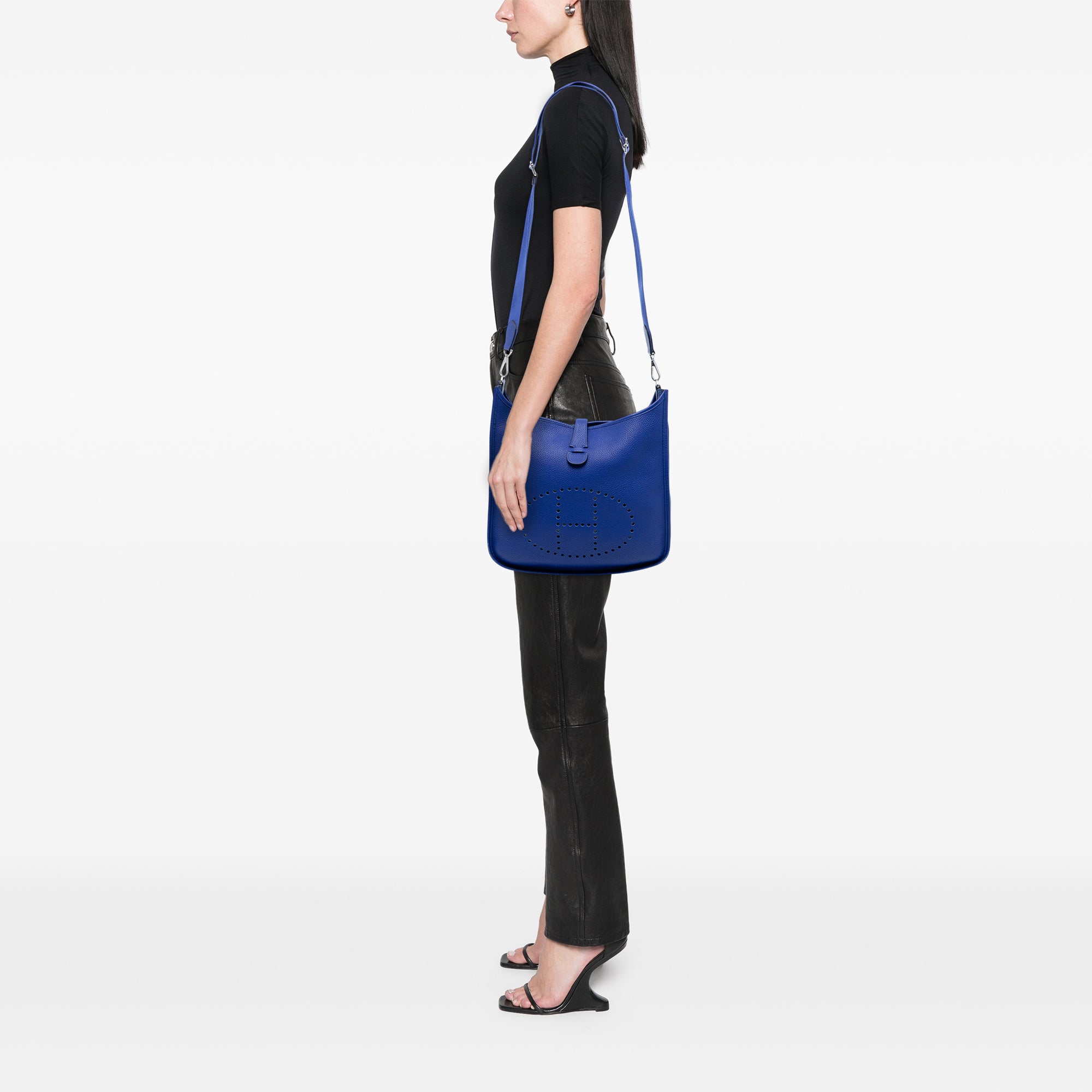 The iconic Hermès Evelyne III GM is a timeless crossbody bag that effortlessly combines functionality with luxury craftsmanship. Crafted in supple Clemence leather in the stunning Bleu Royal colorway, this bag features the signature perforated H logo, a detachable and adjustable canvas strap, and a convenient exterior slip pocket for easy access to essentials.
