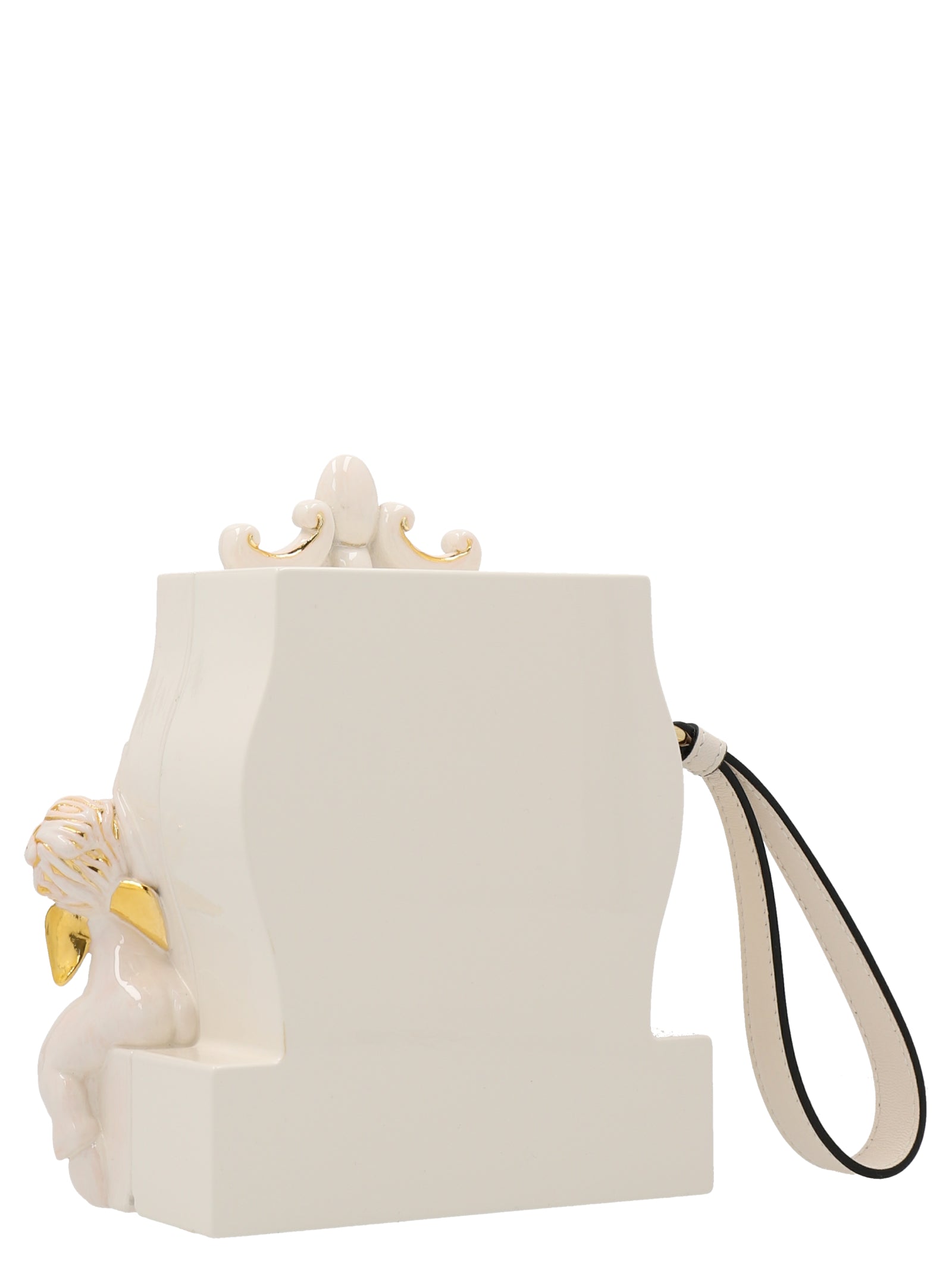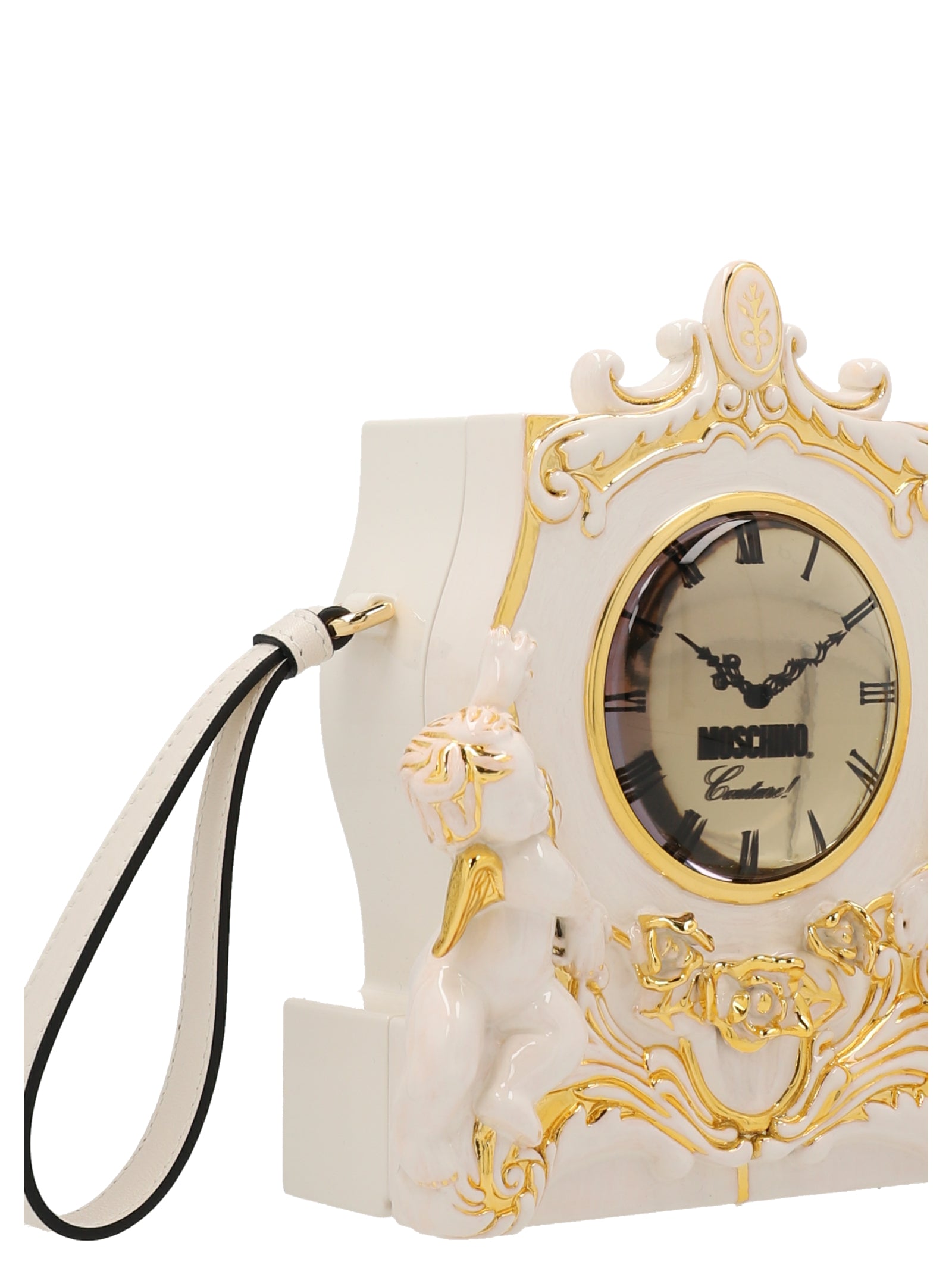 Make a statement with this whimsical 'Clock' clutch from Moschino. Crafted in hard material with ornate gold baroque detailing, this conversation-starting piece features a functional clock face design that's pure Moschino playfulness.