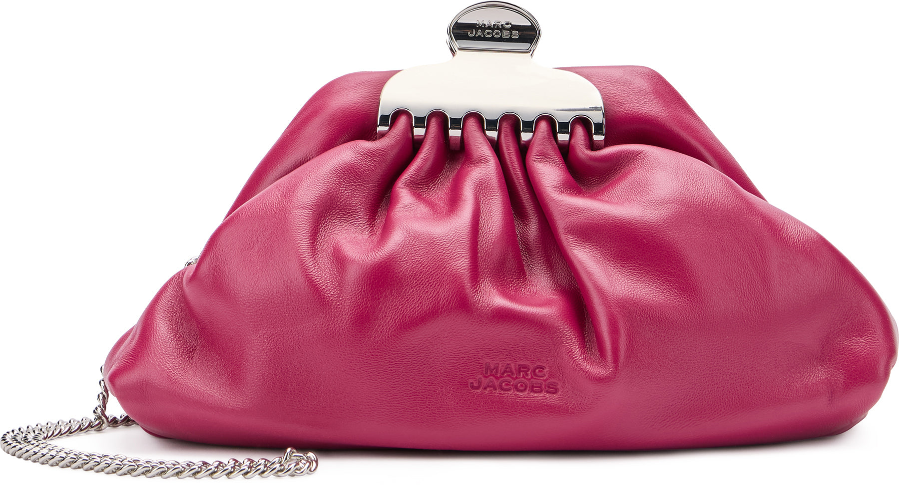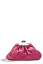 CLUTCH BAG IN SOFT LEATHER FUCHSIA COLOR. THE TOP CLOSURE IS ADORNED WITH A GOLDEN DECORATIVE ELEMENT, ADDING A TOUCH OF ELEGANCE. THE ROUNDED SHAPE AND MINIMALIST DESIGN MAKE IT IDEAL FOR SPECIAL EVENINGS OR FORMAL EVENTS. INCLUDES A REMOVABLE SHOULDER STRAP FOR VERSATILE USE. PERFECT FOR STORING ESSENTIALS IN STYLE. LENGTH: 28 CM HEIGHT: 21 CM DEPTH: 10 CM SHOULDER STRAP LENGTH: 118 CM