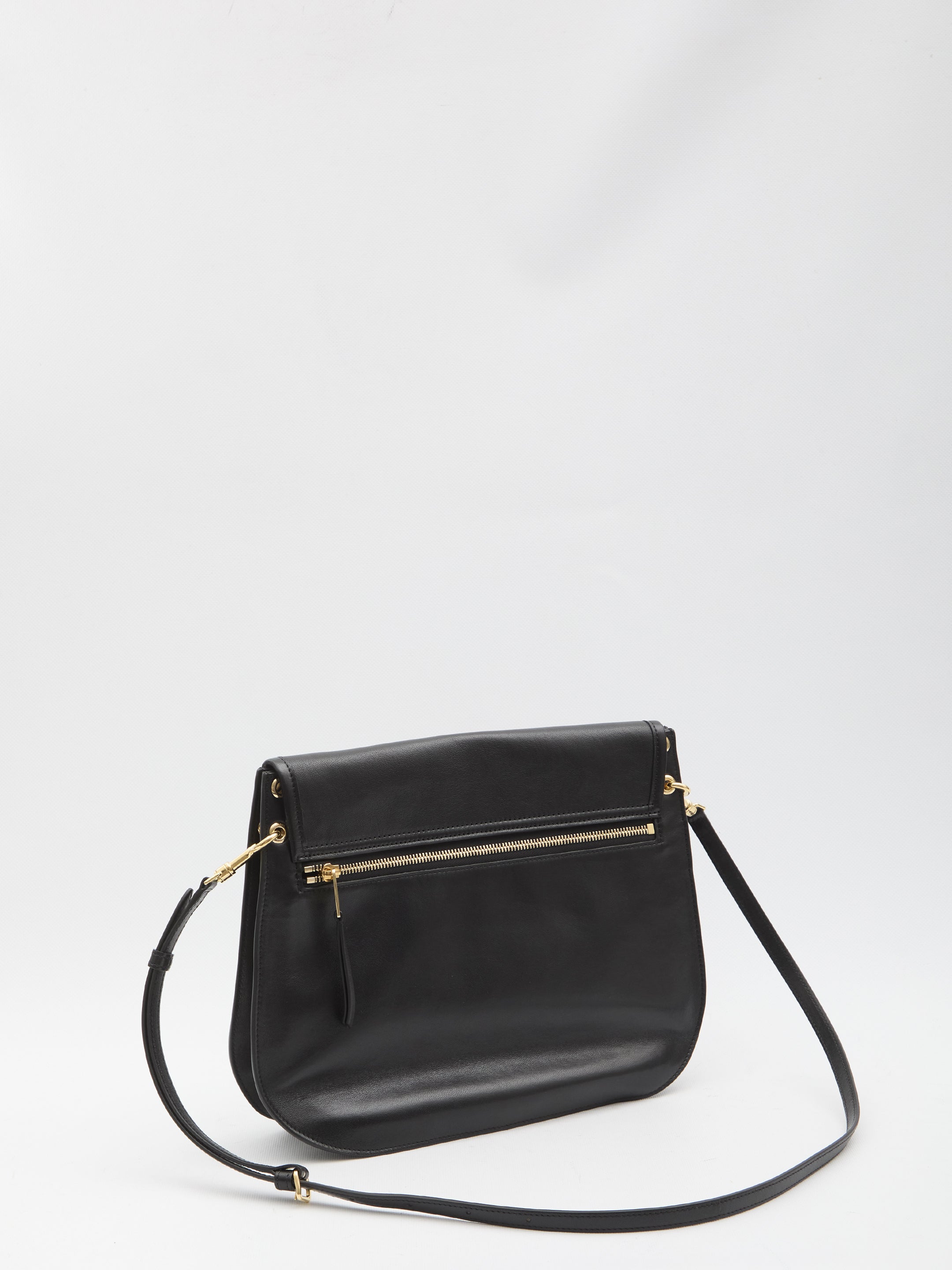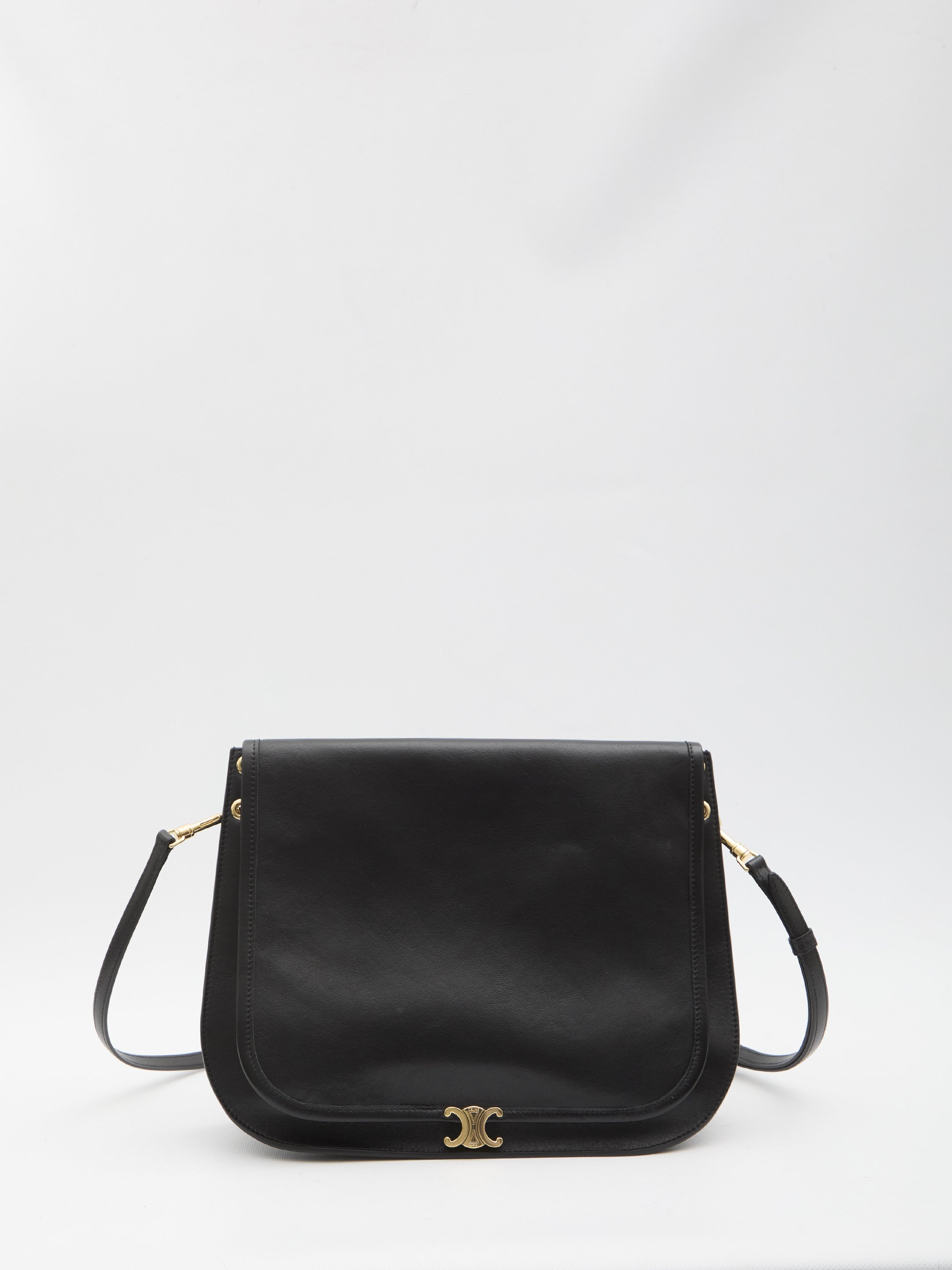 GLOSSY BLACK LAMBSKIN SADDLE BAG. IT FEATURES AN ADJUSTABLE AND REMOVABLE SHOULDER STRAP, A ZIP POCKET ON THE BACK, FLAP CLOSURE WITH A TRIOMPHE BUTTON, ONE MAIN COMPARTMENT, AND A CALF SUEDE LINING. DUSTBAG INCLUDED. ANY IMPERFECTIONS IN THE LEATHER SHOULD NOT BE CONSIDERED MANUFACTURING DEFECTS, BUT A CHARACTERISTIC OF THE MATERIAL.