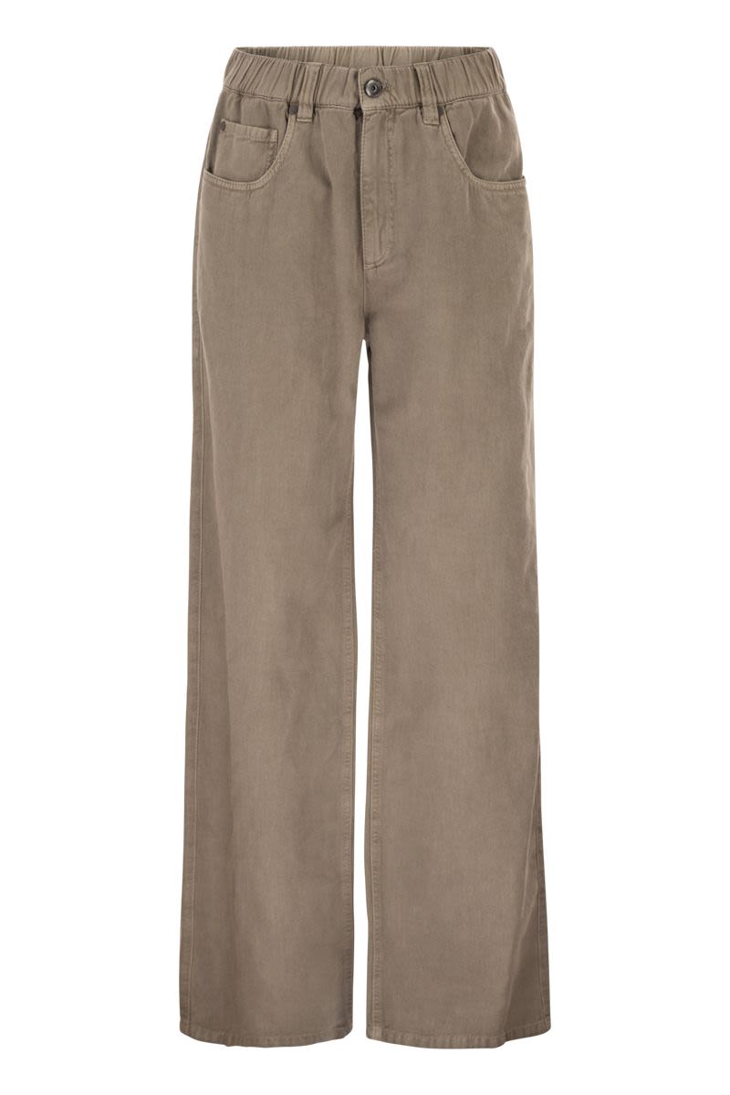 THE FINE COTTON AND LINEN COVER DEFINES THE SUMMERY FEEL OF THE CONTEMPORARY TROUSERS. THE MODEL STANDS OUT FOR ITS RELAXED, SOFT SILHOUETTE, CHARACTERISED BY STRAIGHT, WIDE VOLUMES ALONG THE ENTIRE LEG. THE PULL-UP FIT COMPLETES THE COMFORT, WHILE THE APPLICATION OF THE PRECIOUS JEWEL ON THE BACK LOOP ADDS A FEMININE TOUCH, IN PURE BRUNELLO CUCINELLI STYLE. THE COVER IS A FABRIC CHARACTERISED BY A SLIGHTLY THREE-DIMENSIONAL DIAGONAL TEXTURE. THE COMBINATION OF COTTON AND LINEN SLIGHTLY SOFTENS THE DIAGONAL PATTERN AND GIVES THE GARMENT A SOFT AND CASUAL LOOK. - ZIP CLOSURE WITH BUTTON - FRONT POCKETS WITH FLAP POCKET - BACK PATCH POCKETS - PLAIN HEM - NICKEL-FREE JEWELLERY DECORATION DESIGNER ID: ML996P4053 C9325