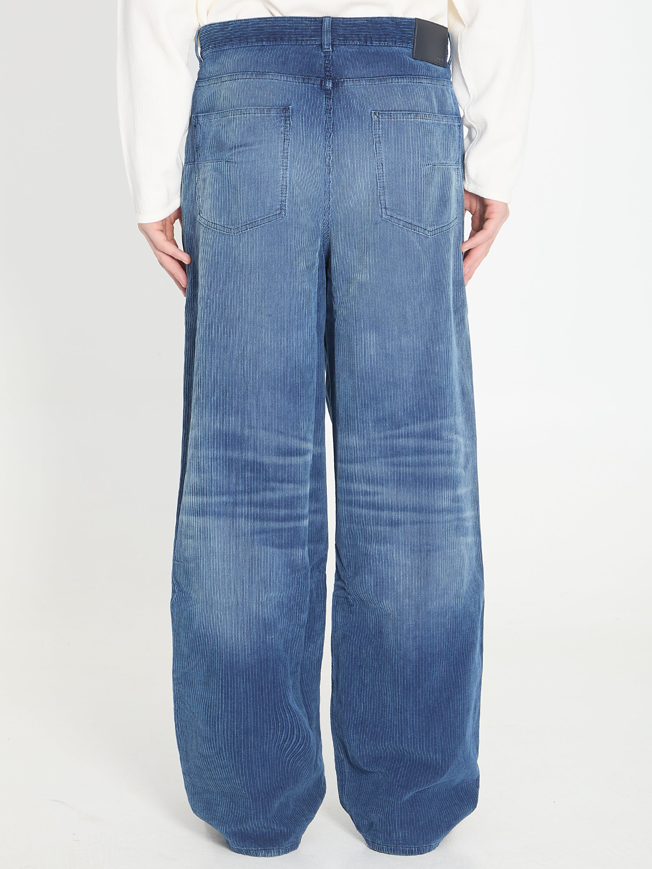 Cotton corduroy pants in deep blue with a slightly vintage effect. Features belt loops, front button closure, two slanted pockets at the front, two back pockets, leather jacron with Dior signature at the back, mid-rise, wide leg. Regular fit.