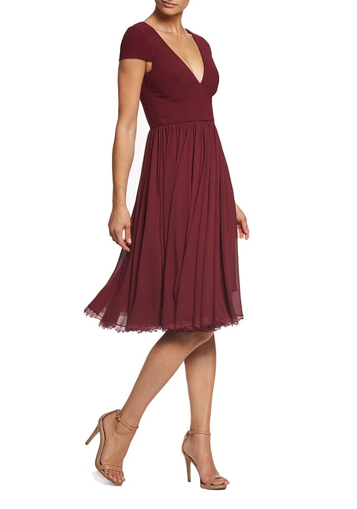 The charming but sophisticated Corey dress pairs a fitted crepe bodice with a softly gathered chiffon skirt. Cap sleeves add coverage to balance the sultry plunging v-neckline and curved v-back of this design. A scalloped lace hem dresses up the midi-length skirt for special events.