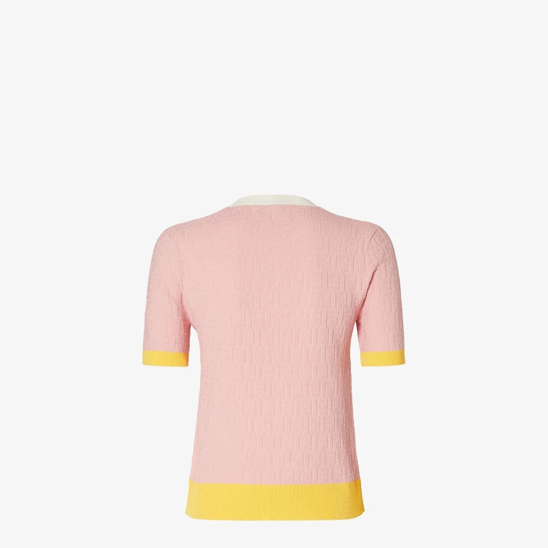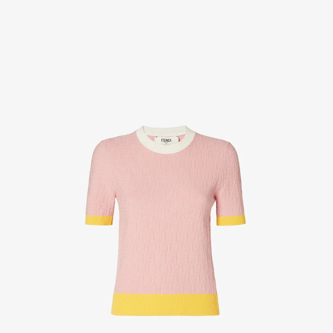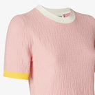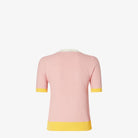 Elevate your everyday wardrobe with this exquisite Fendi cotton and silk short sleeve shirt. Crafted from a luxurious blend of cotton and silk, this ribbed knit top features a sophisticated pink hue beautifully accented with contrasting white crew neckline and vibrant yellow trim at the sleeves and hem.