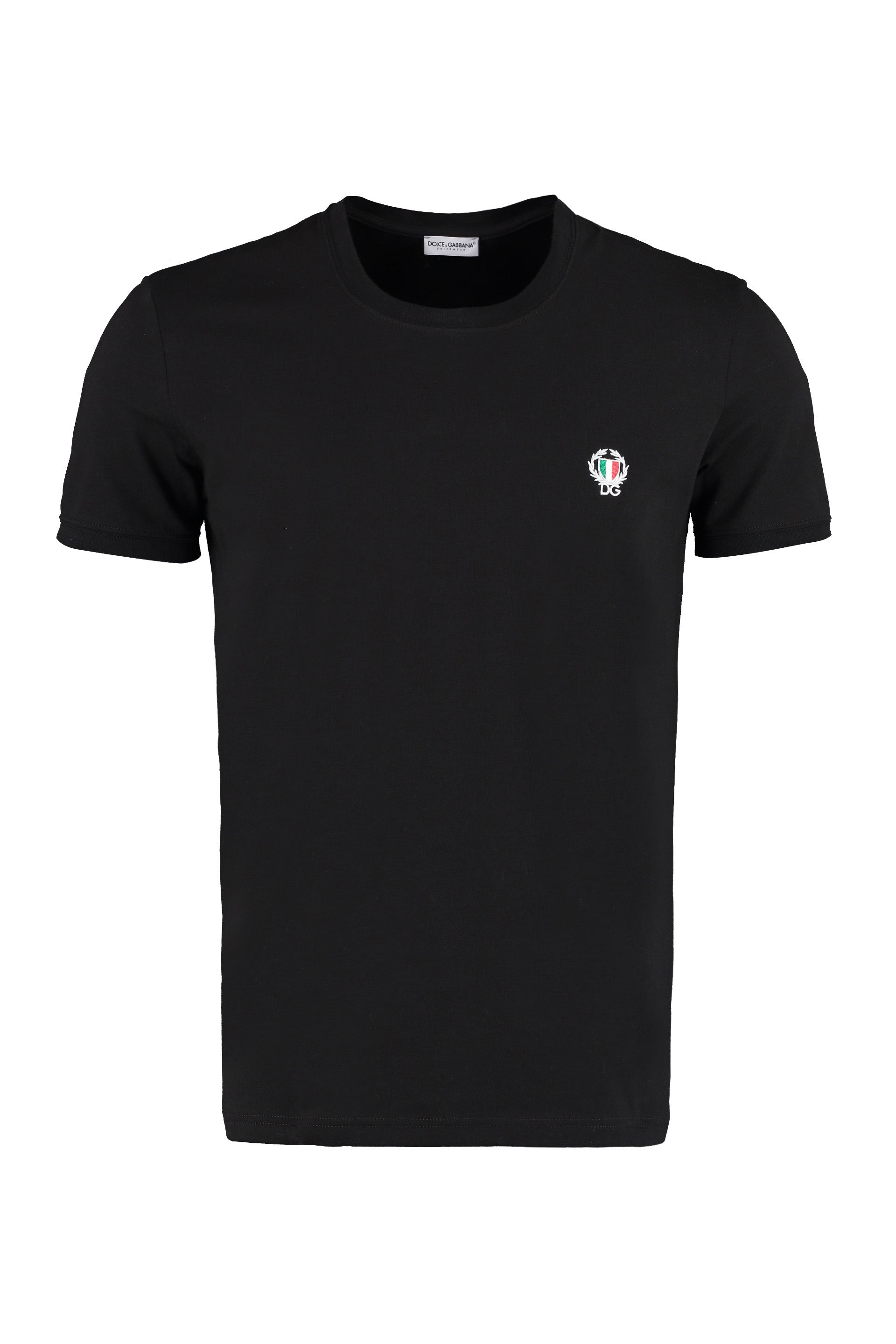 Elevate your everyday wardrobe with this sophisticated cotton crew-neck t-shirt from Dolce & Gabbana. Crafted from a premium cotton blend with a touch of elastane for comfort and flexibility, this classic black tee features a distinctive front patch detail that adds a subtle designer touch.