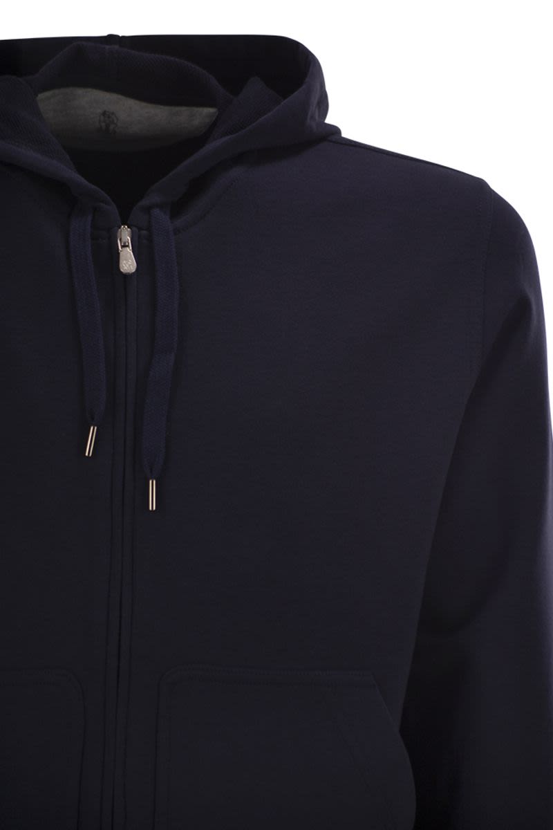 PRECIOUS MATERIALS ENRICH THE SPORTY STYLE OF THE TRAVELWEAR LINE, DEDICATED TO MOMENTS OF RELAXATION AND LEISURE. THE CLASSIC HOODED TOPWEAR MODEL COMBINES THE HIGH-QUALITY QUALITIES OF THE LIGHTWEIGHT COTTON TECHNO FLEECE DEFINED BY THE ZIP FASTENING AND LARGE FRONT POCKETS. THE ELASTIC PROPERTIES OF THE MATERIAL GUARANTEE A COMFORTABLE FIT. THE LIGHTWEIGHT TECHNO COTTON SWEATSHIRT IS A SOFT AND LIGHT FABRIC: ON THE OUTSIDE THE TEXTURE IS SMOOTH AND COMPACT, WHILE ON THE INSIDE IT OFFERS A HONEYCOMB STRUCTURE THAT CONTRIBUTES TO A LIGHTWEIGHT WEARABILITY. A SMALL PERCENTAGE OF SYNTHETIC FIBRE PROMOTES WEARING COMFORT. - DOUBLE-SLIDER ZIP FASTENING - ADJUSTABLE HOOD WITH DRAWSTRING - LOW PATCH POCKETS - RIB KNIT CUFFS AND HEM DESIGNER ID: MW8639069G C6134