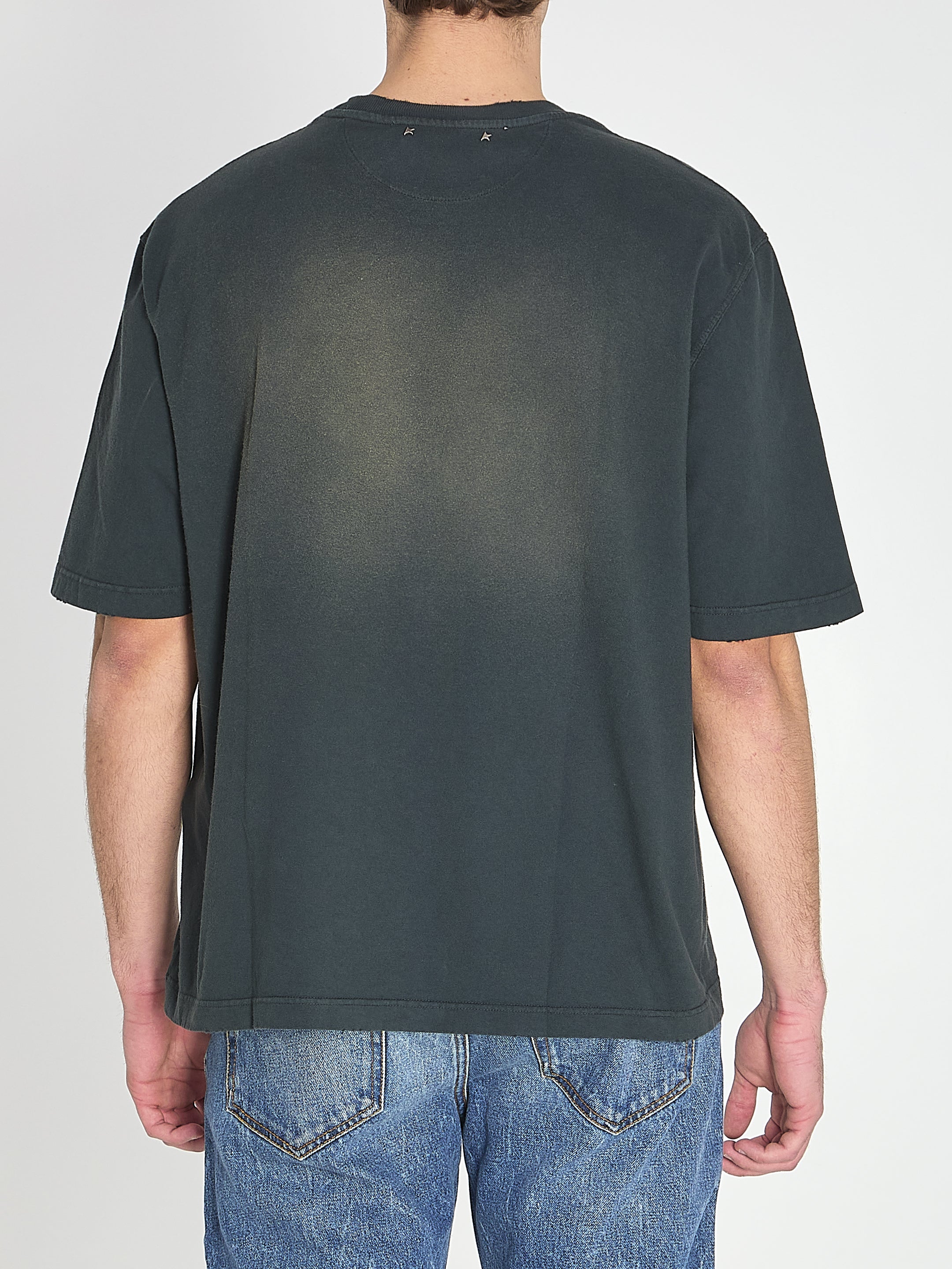 T-shirt in faded black cotton jersey. It features a crew neck, short sleeves, tonal Golden Goose signature embroidered on the chest, double star appliqué on the back, and ribbed finishes. Worn-in effect. Comfortable fit.