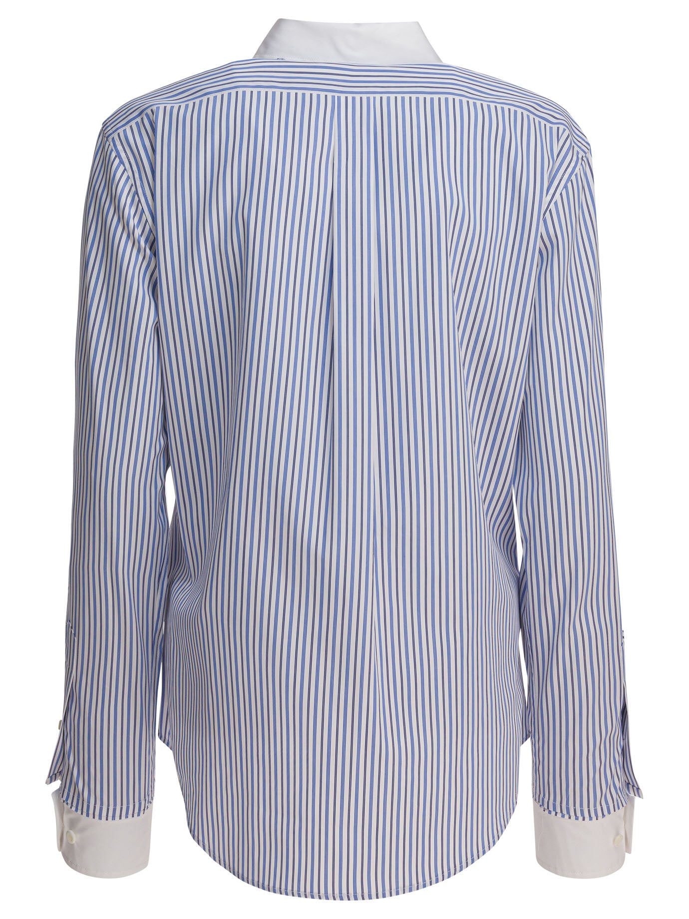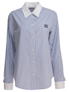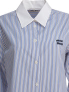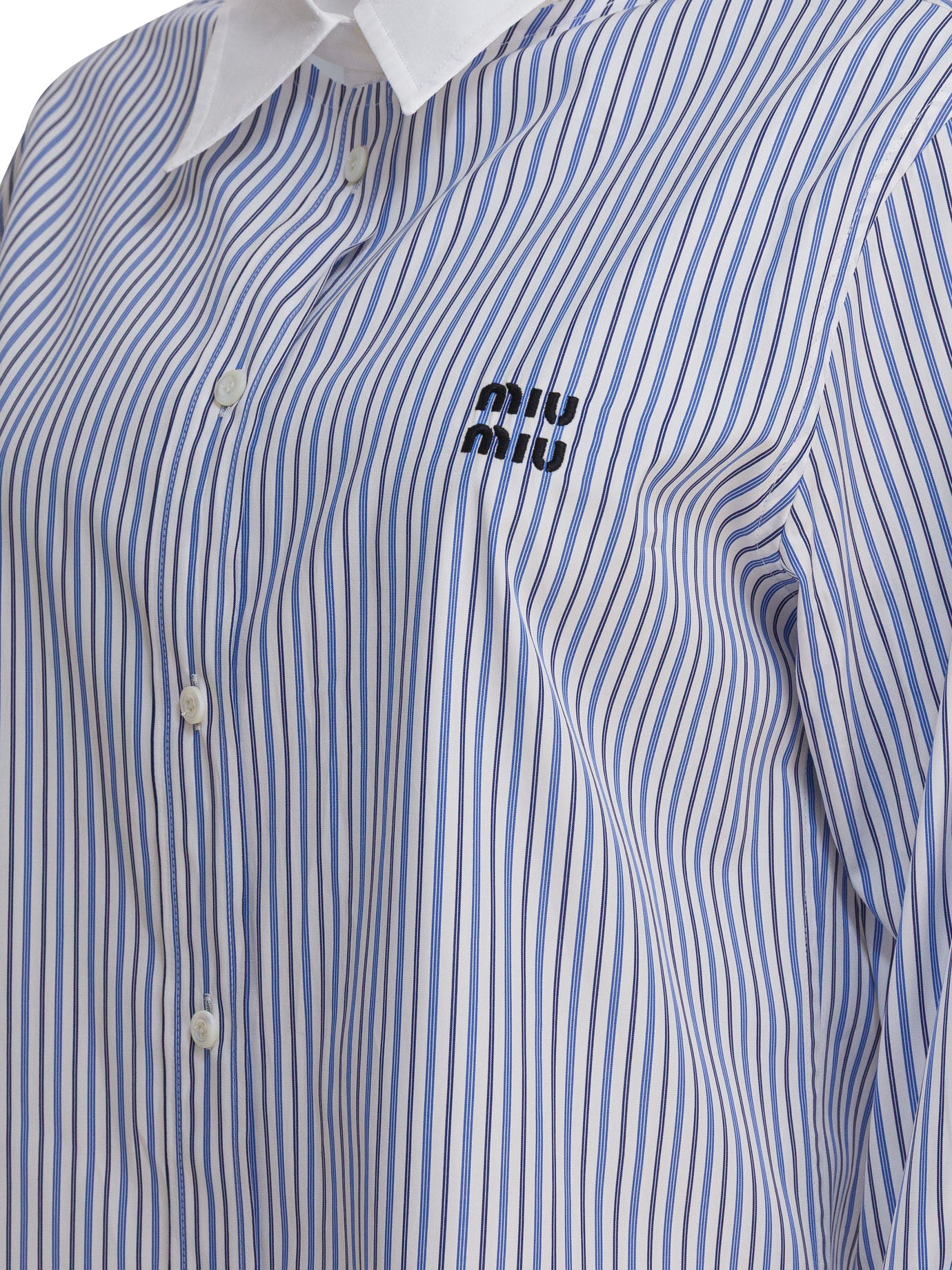 Exploring the boundaries between masculine elegance and refined femininity, this Miu Miu poplin shirt is the epitome of a design that combines distinctive details and creativity. The design lends itself to multiple style interpretations, making this garment a versatile element in every woman's wardrobe. The striped pattern, a recognizable symbol of the brand, further embellishes this comfortable-fitting garment.