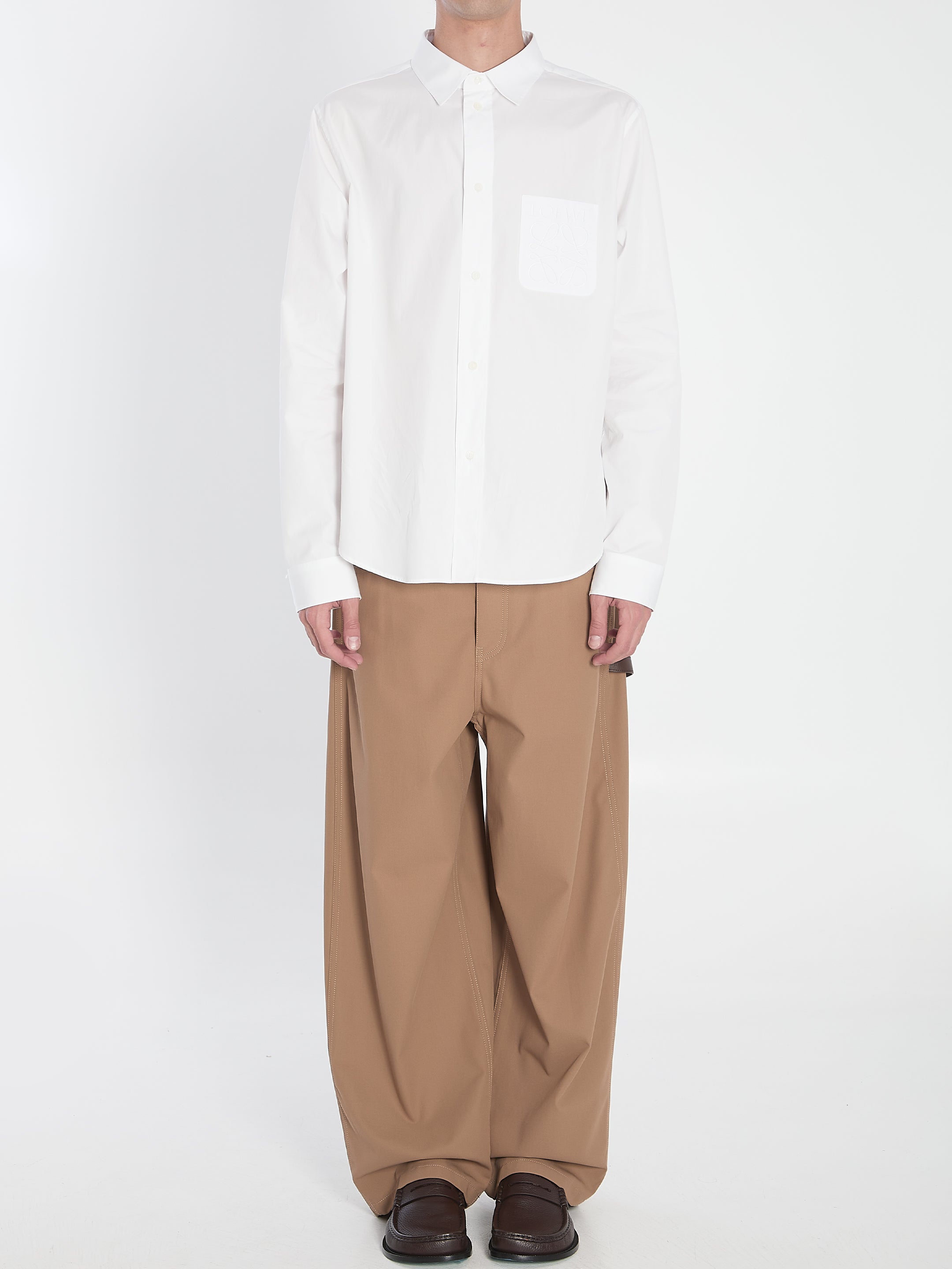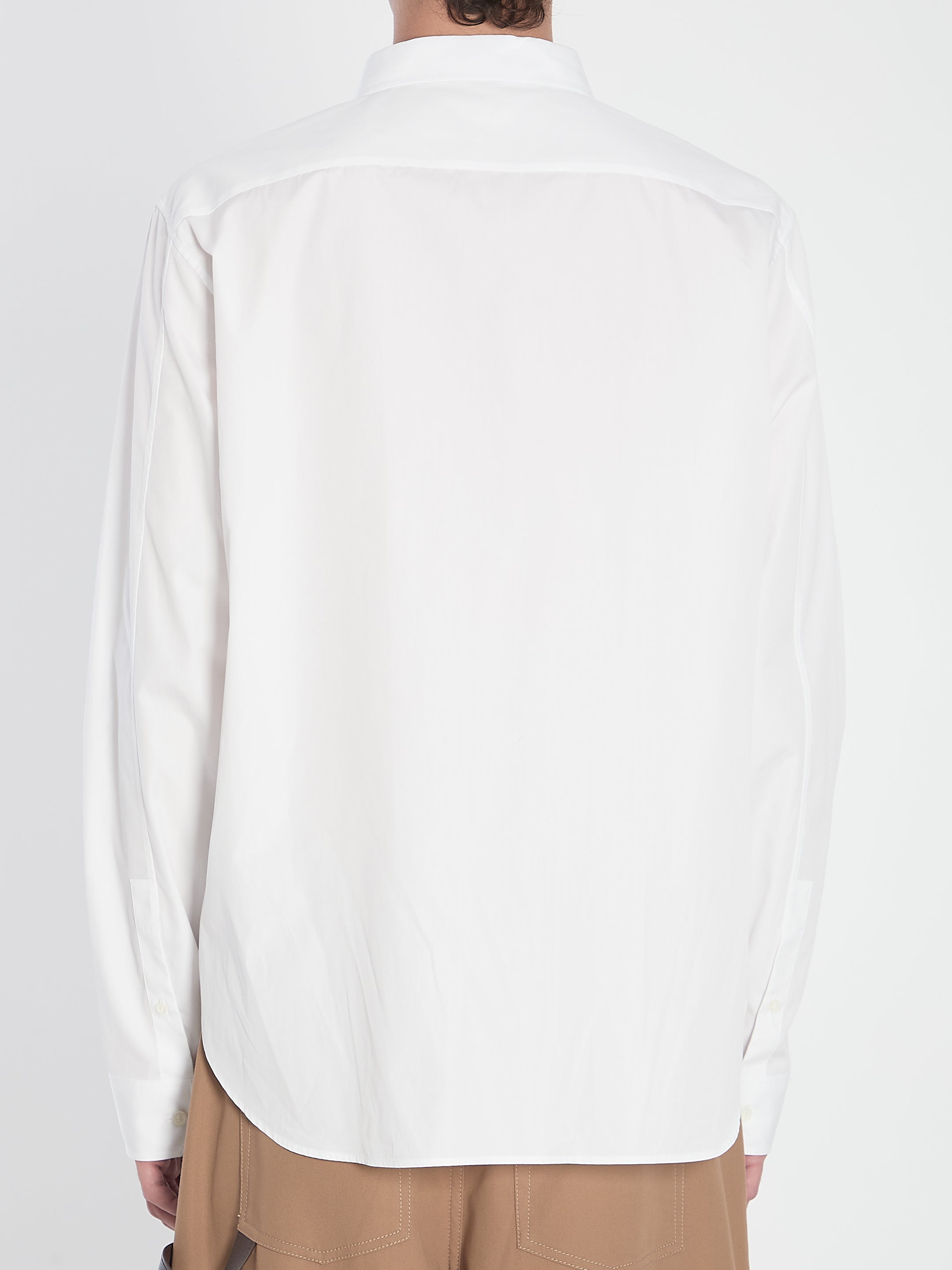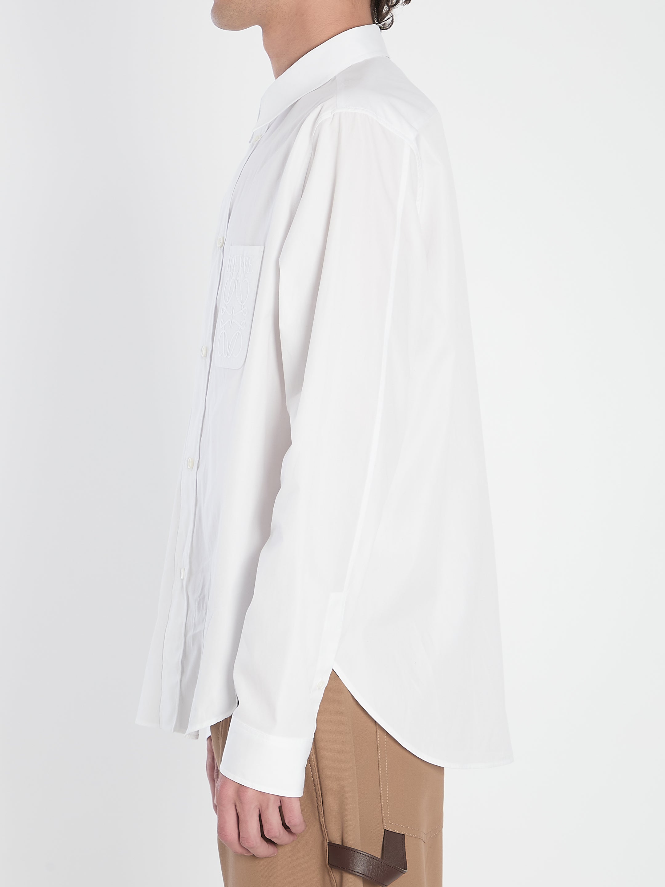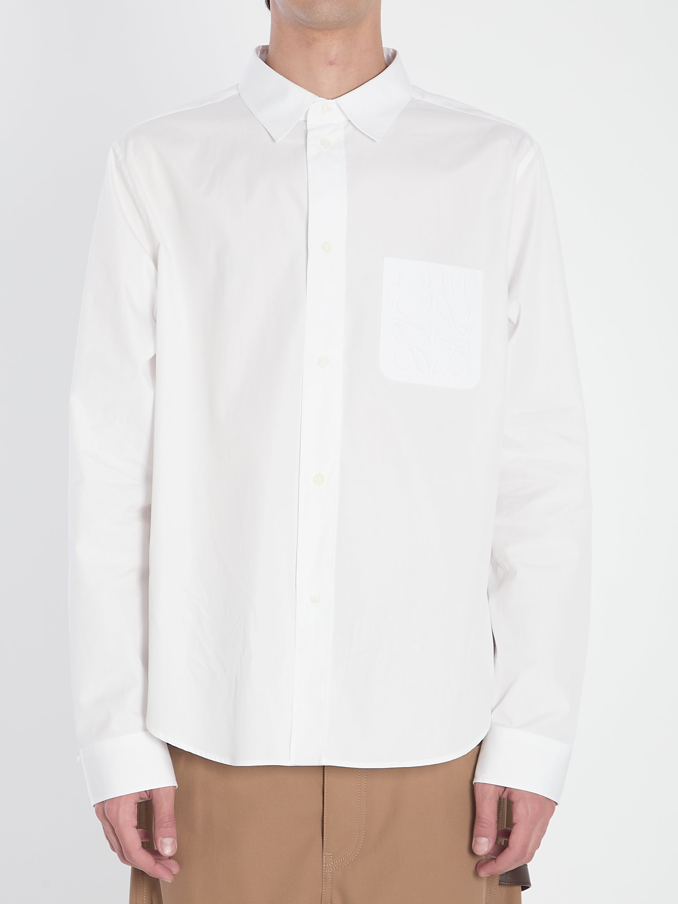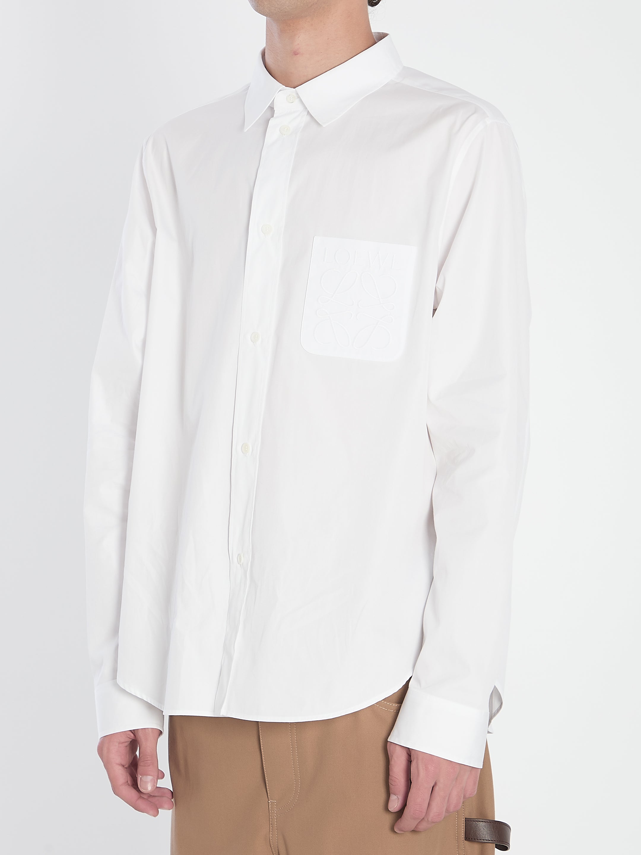 WHITE LIGHTWEIGHT COTTON POPLIN SHIRT. FEATURES A CLASSIC COLLAR, FRONT BUTTON CLOSURE, BUTTONED CUFFS, AND A PATCH POCKET ON THE CHEST EMBROIDERED WITH THE LOEWE ANAGRAM MOTIF.