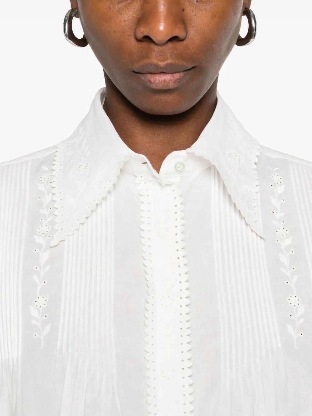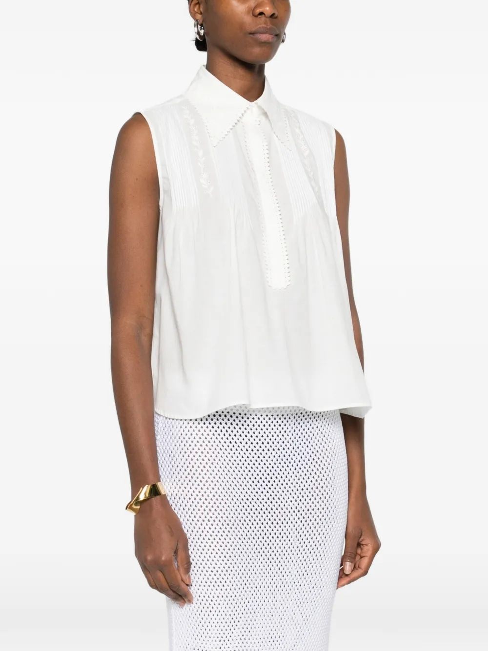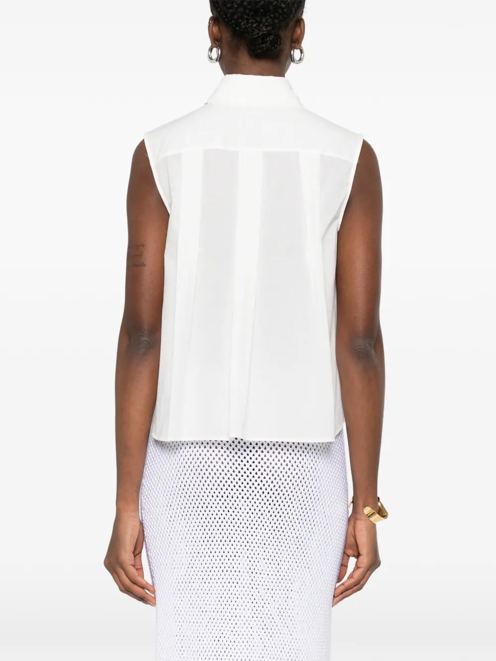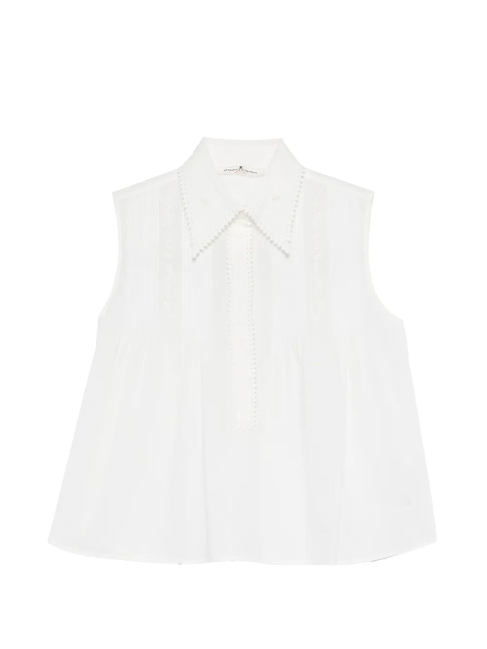 Elevate your warm-weather wardrobe with this exquisite cotton shirt from Ermanno Scervino. Crafted from premium cotton, this sleeveless blouse features a classic collar adorned with elegant studded embellishments that add a touch of sophistication to the clean, crisp silhouette.