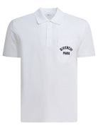 Givenchy cotton short-sleeved polo shirt made from cotton pique with a compact texture. The construction features a grosgrain applique on the chest, with Givenchy signature and zig-zag stitching defining the area. There is a breast pocket on the chest, integrated into the linear silhouette. Ribbed collar and short sleeves complete the construction, focusing on essential functionality and material details.