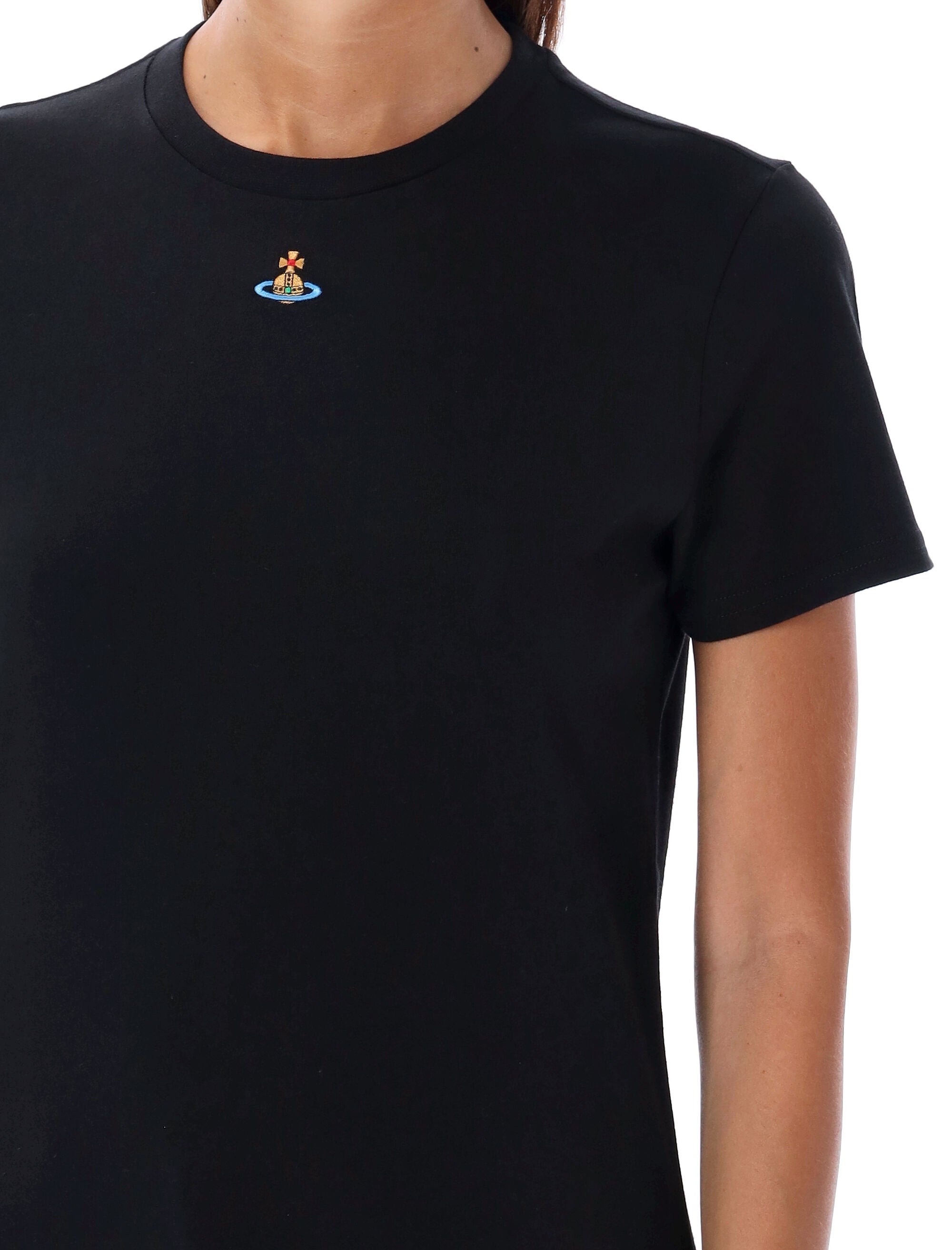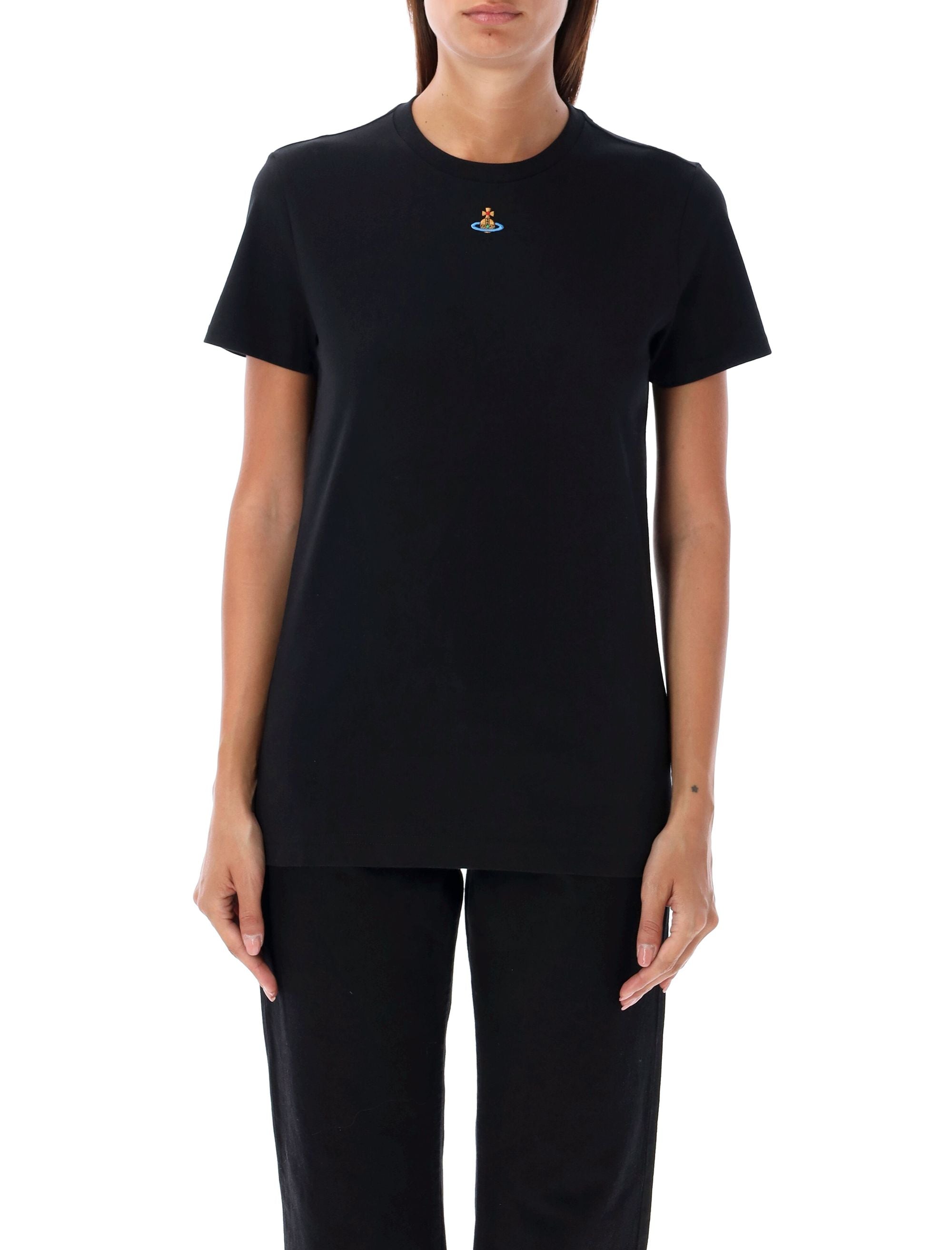 The crew neck silhouette and short sleeves create a versatile foundation for any casual ensemble, while the signature orb embroidery adds an unmistakable touch of Westwood's rebellious elegance. The straight hem ensures a flattering, easy fit that pairs effortlessly with everything from denim to tailored trousers.