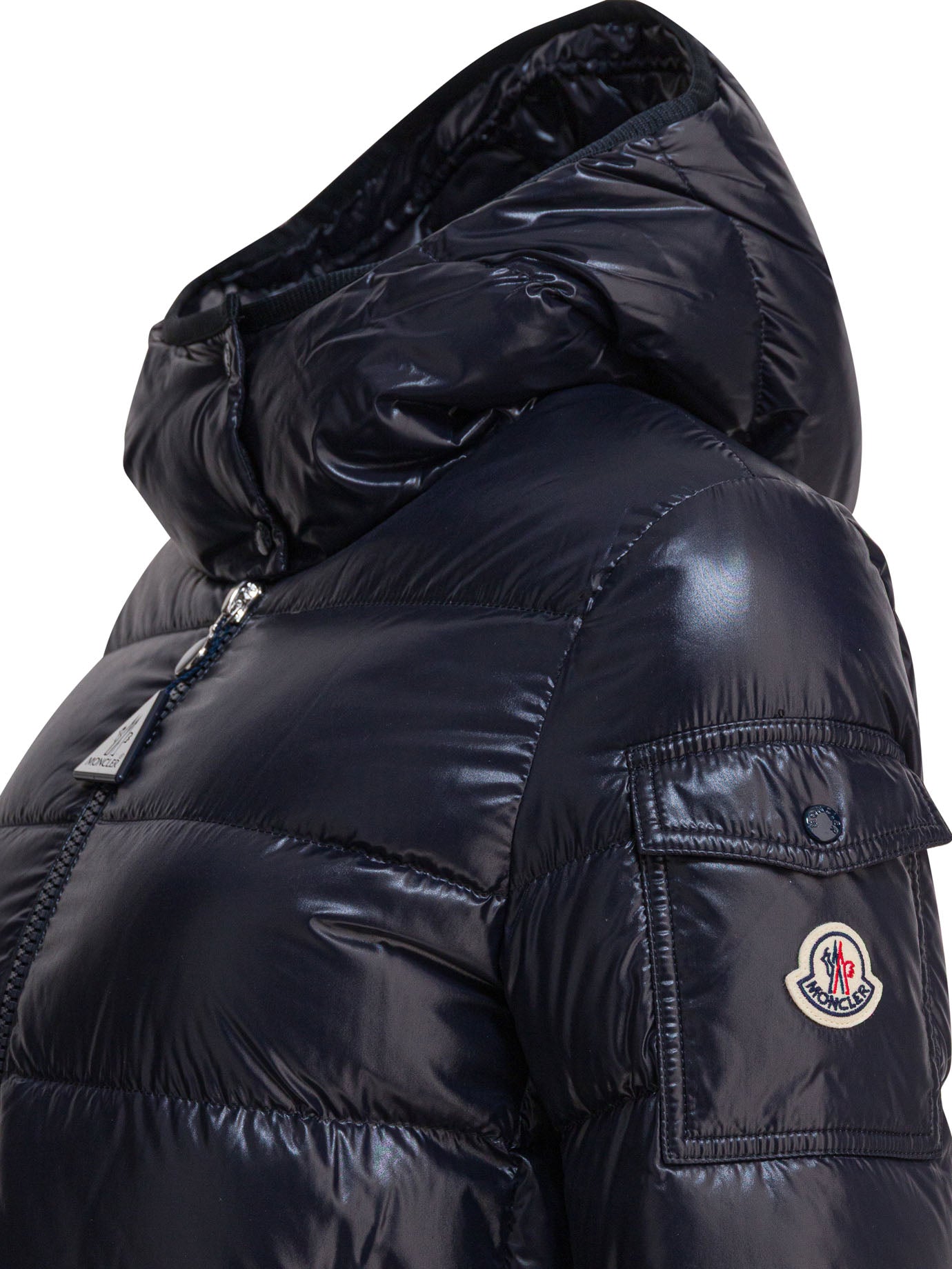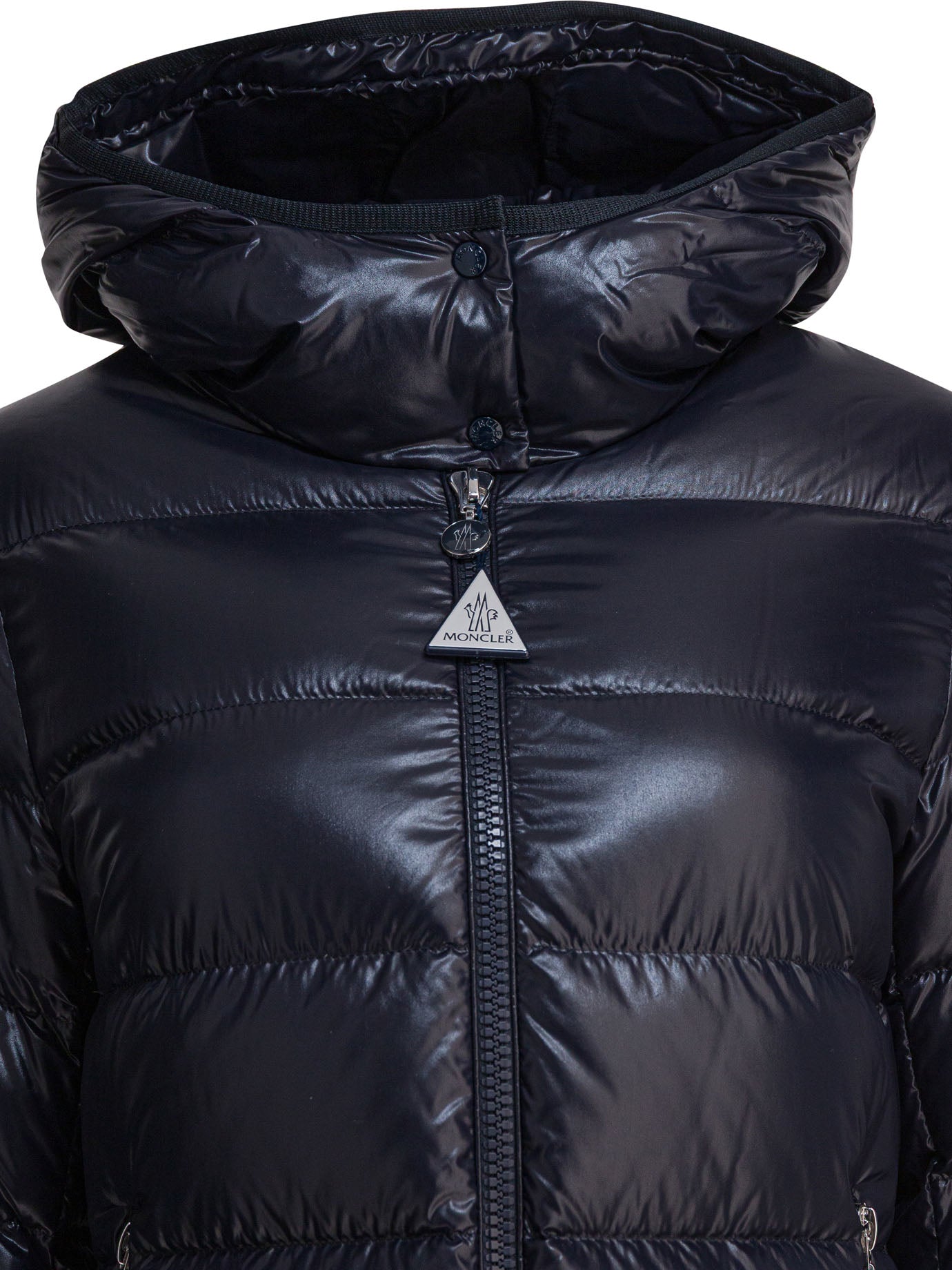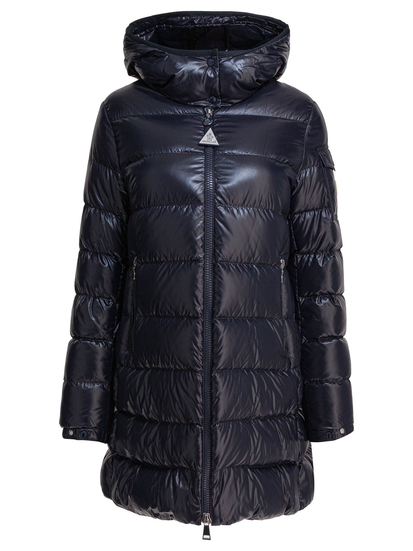 Moncler "Courcelles" hooded long down jacket made of shiny laqué nylon, with interior padding and lining. The structure features a central zipper closure, integrated hood and front zipper pockets. Waist defined with adjustable drawstring that adapts the silhouette to the body; garment bottom also finished with drawstring. Patch pocket on the sleeve and adjustable cuffs complete the functional construction.