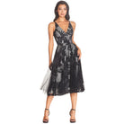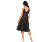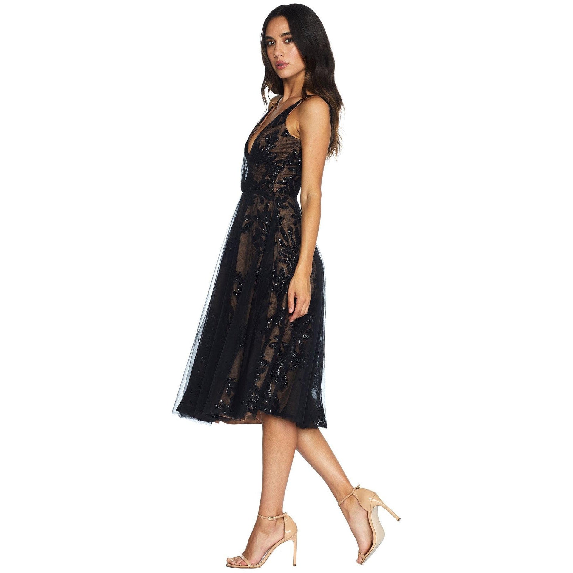 Slip into the Courtney Dress and layer yourself with luxurious lace, featuring romantic floral sequin detailing. This sleeveless black midi dress features a fitted bodice and V-neckline, with a flattering high waist. Courtney owns the night and catches the light with every move you make, delivering maximum sparkle.