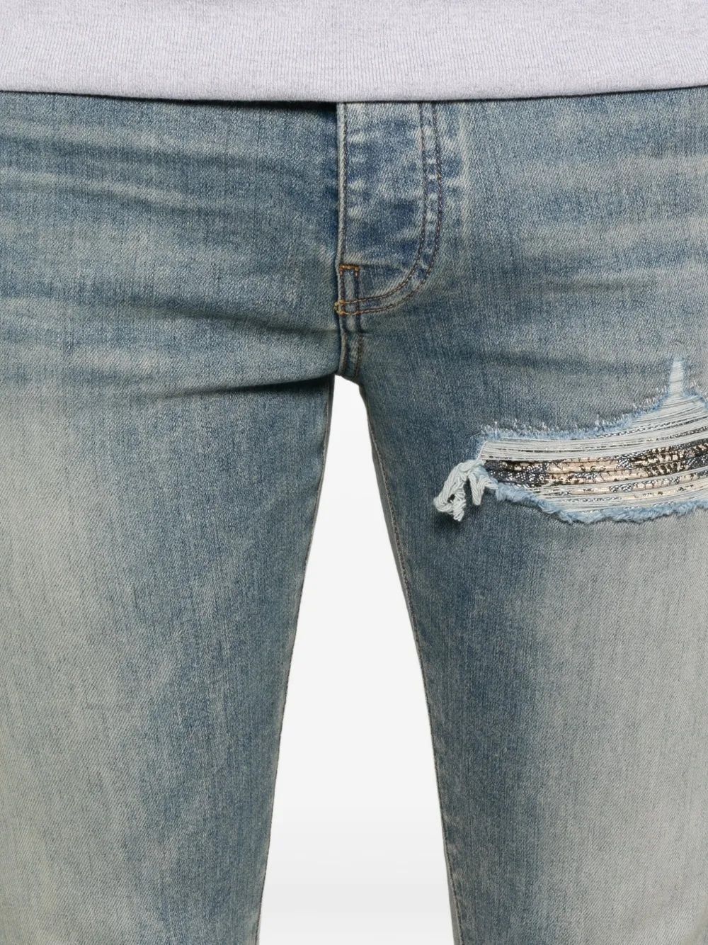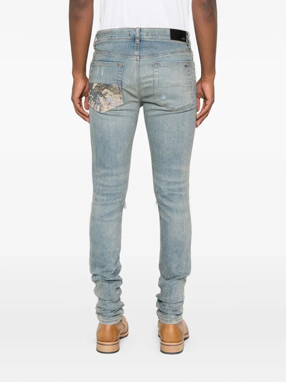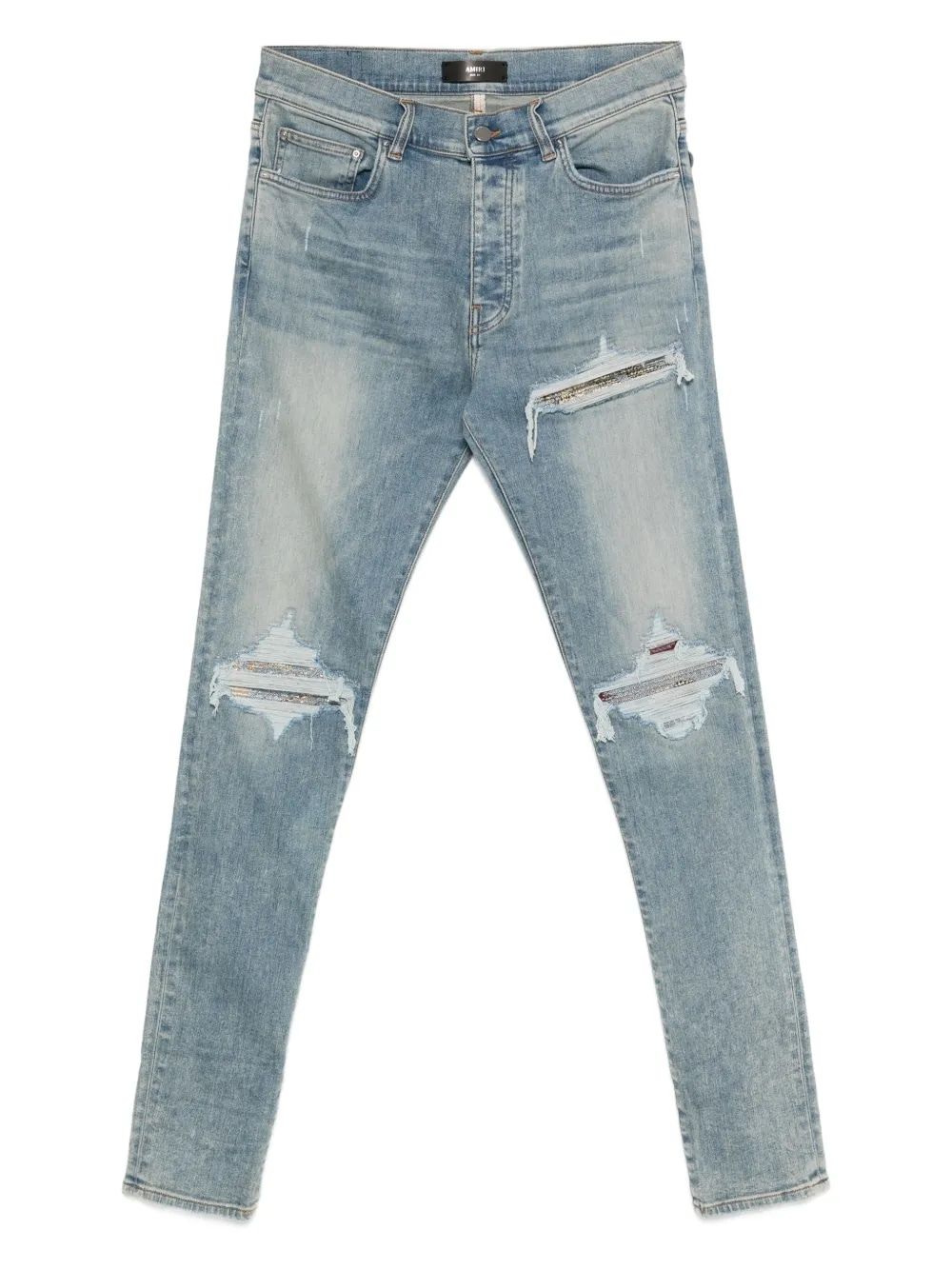 These slim-fit jeans feature a light blue wash with strategically placed distressing and rips throughout the thighs and knees, creating an authentically worn-in aesthetic that's synonymous with AMIRI's signature rock 'n' roll style.