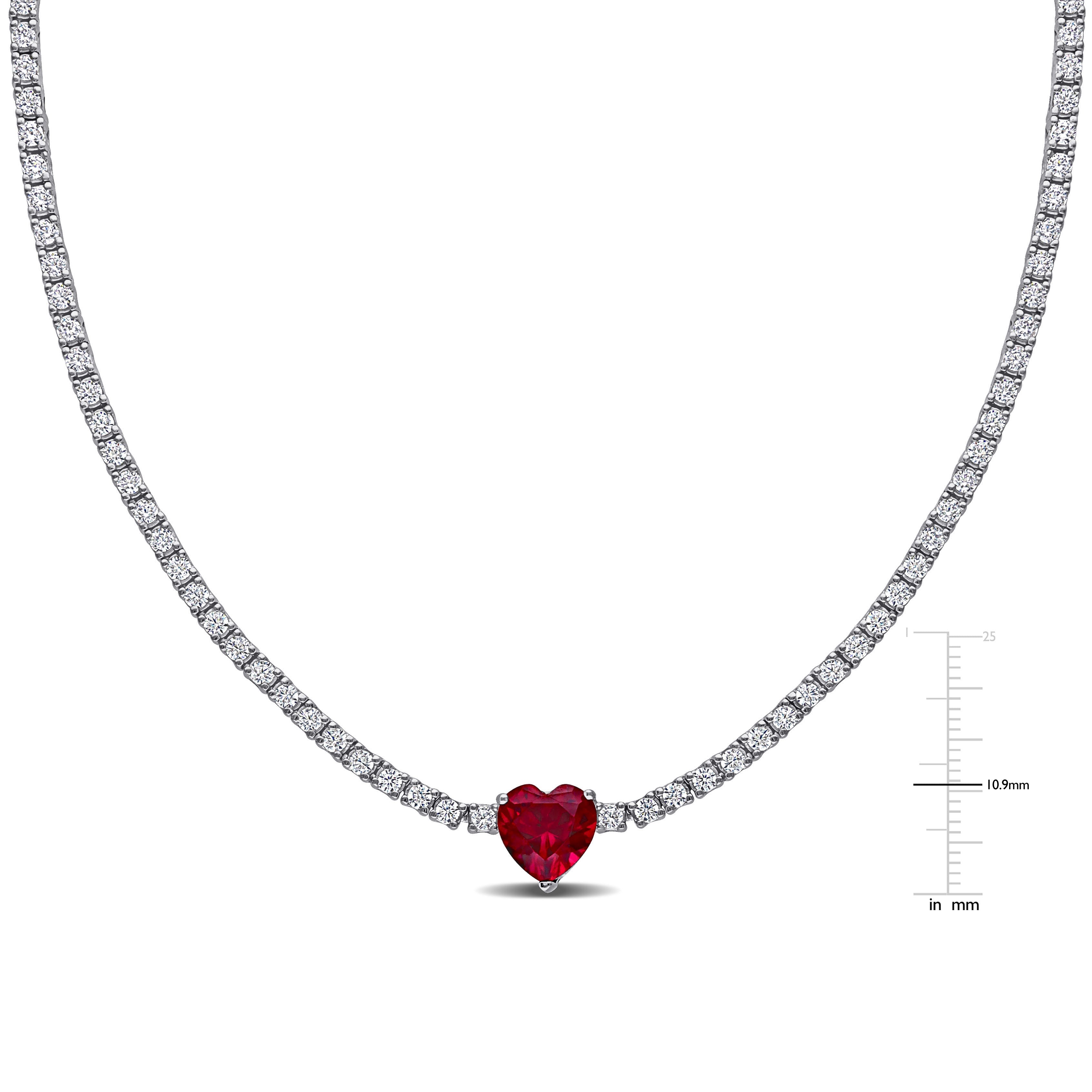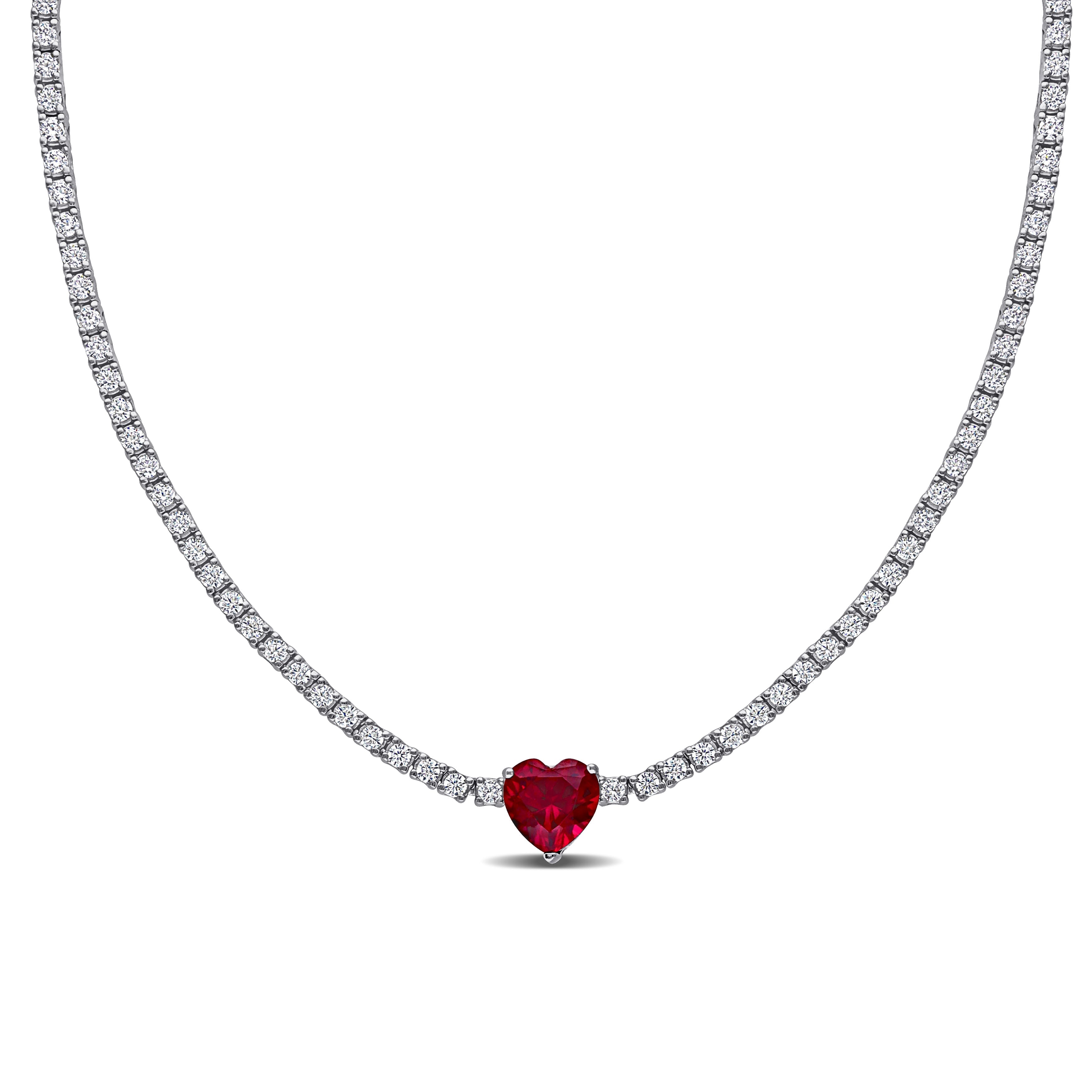 Crafted in shimmering sterling silver, this glamorous necklace features a heart-cut created ruby gemstones at the center and 165 round-cut created white sapphire gemstones. Enhanced with a high polished finish, this 18-inch necklace is comfortably secured with a box clasp. Coordinate this exquisite necklace with a pair of heart earrings for a royal look.