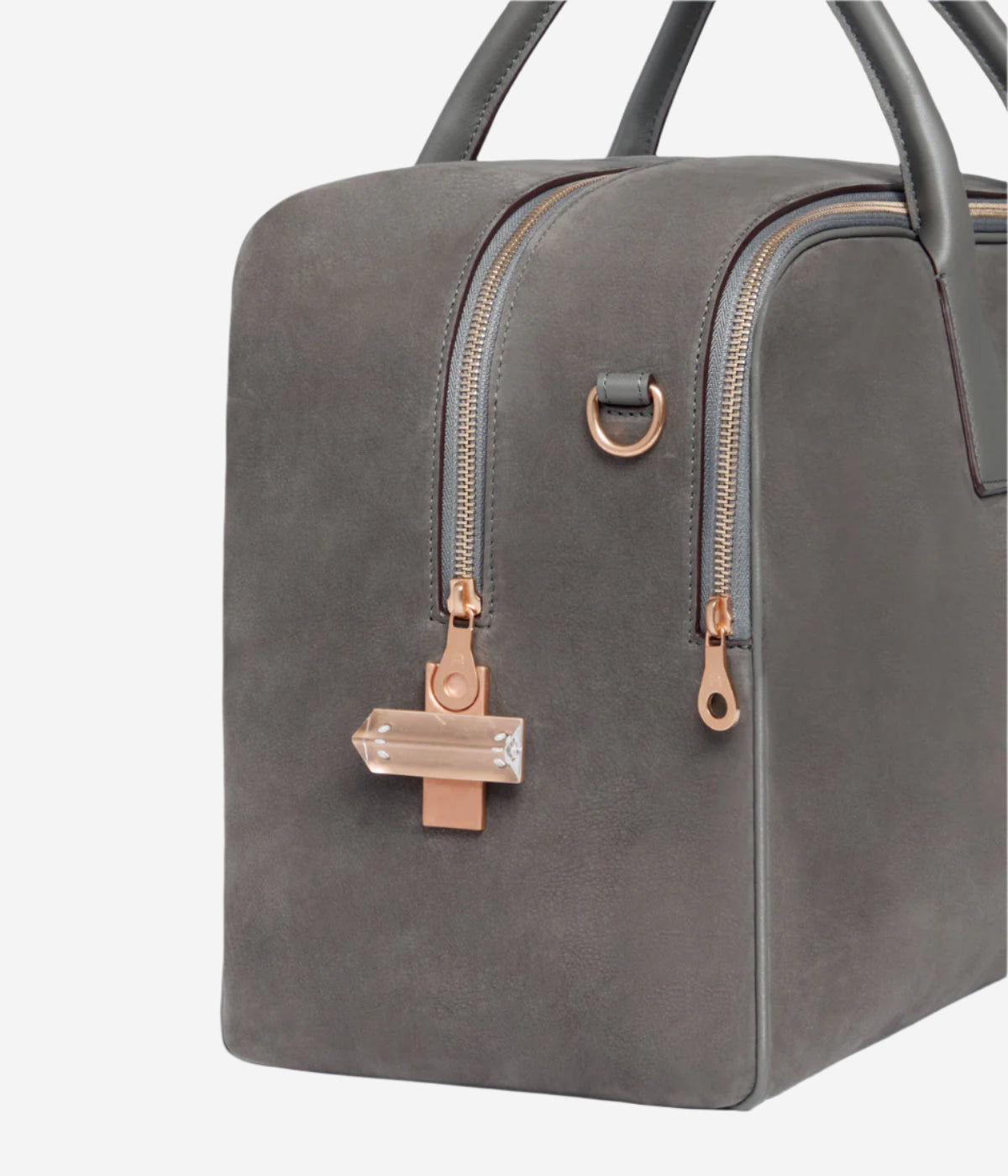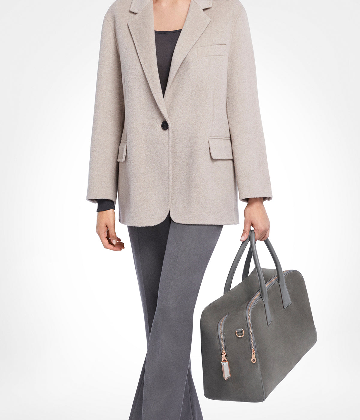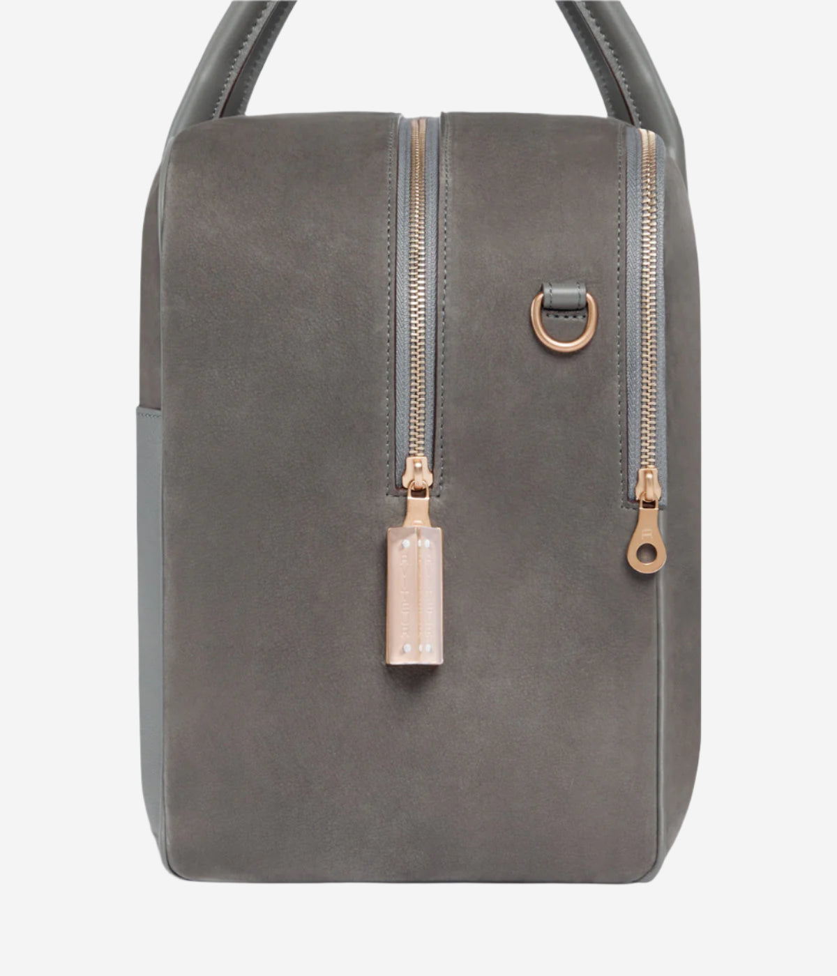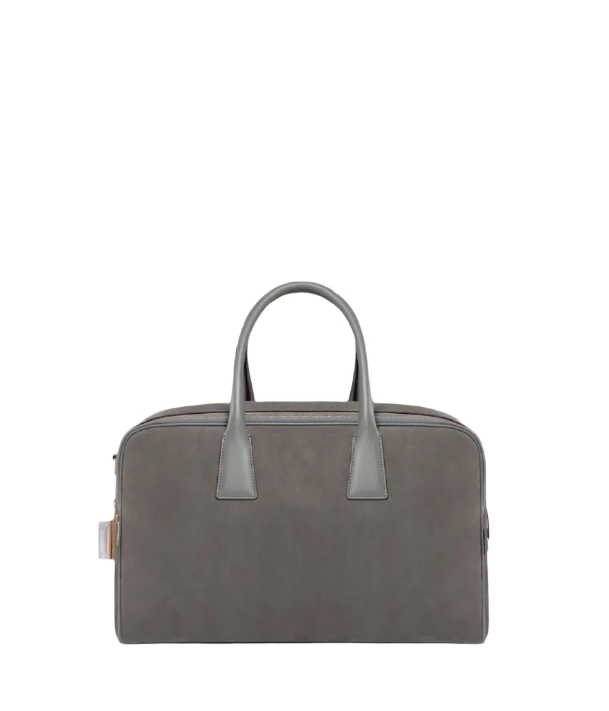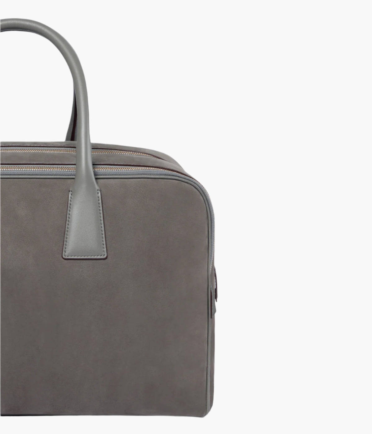Versatile Weekend Bag in nubuck lined in Alcantara. Double zipped compartments, interior and exterior pockets, trolley sleeve, shoulder strap, Aviteur prism clasp.