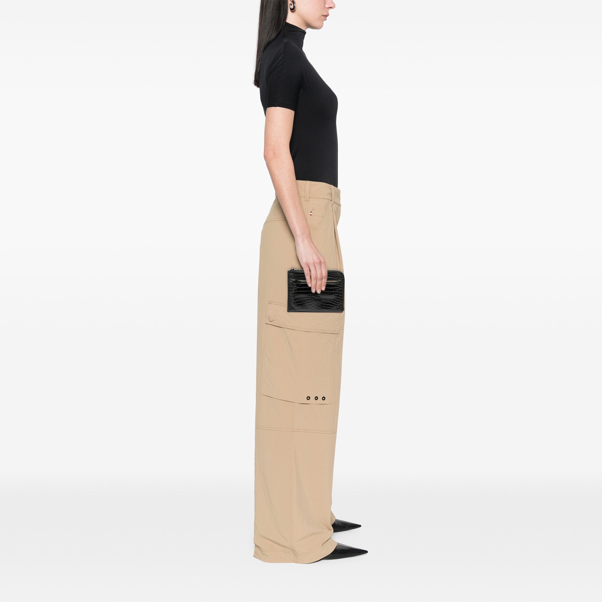 This clutch bag features a croc embossed leather body, a top zip closure, an exterior zip pocket, and interior slip pockets.