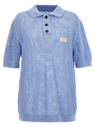 The structured collar and button placket offer timeless appeal, while the short sleeves and airy crochet construction keep you cool and comfortable all day long. A subtle rubberized logo at the front adds a modern designer touch.
