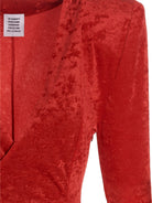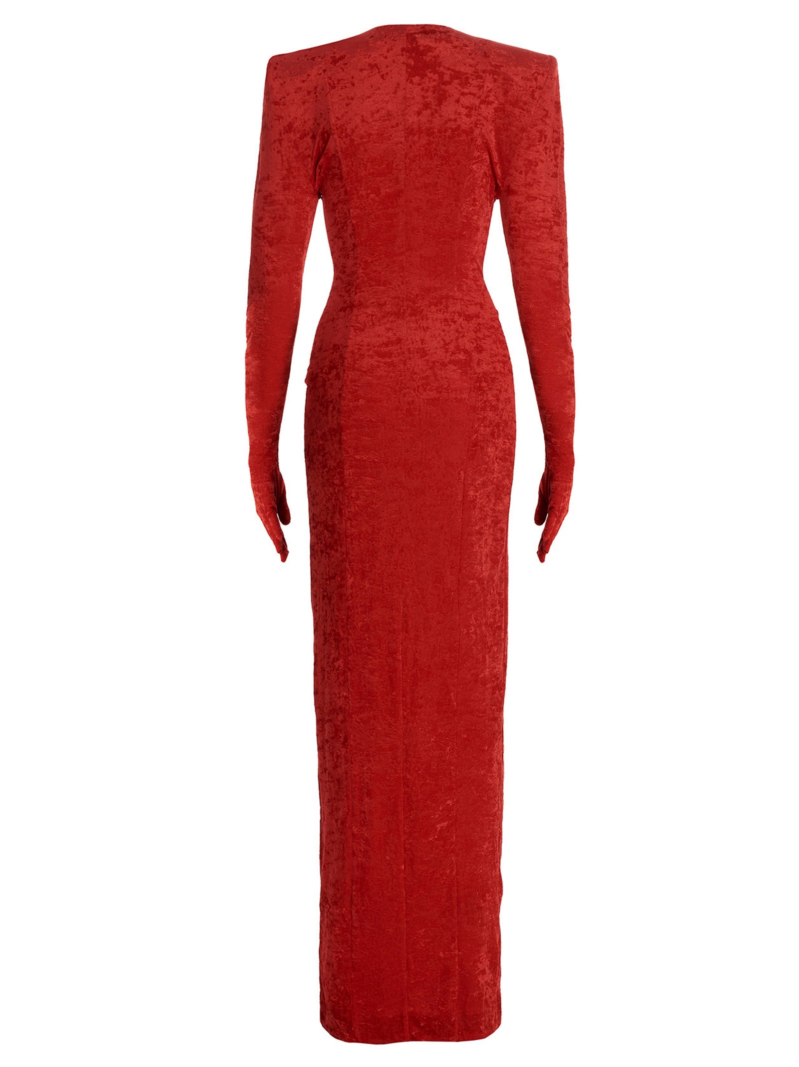 Elevate your evening wardrobe with the 'Crocy' long dress by Vetements. This stunning maxi dress is crafted from luxurious stretch chenille fabric with an alluring textured finish. The dramatic wide V-neckline and padded shoulders create a bold, contemporary silhouette, while the long sleeves with integrated gloves add an avant-garde touch.