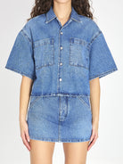 VINTAGE MARBLED LIGHT BLUE COTTON DENIM SHIRT. IT FEATURES A POINTED COLLAR, BUTTON-FRONT CLOSURE, SHORT SLEEVES, TWO FRONT PATCH POCKETS WITH AN EMBOSSED ALEXANDER WANG SIGNATURE, AND A STRAIGHT HEM. CROPPED CUT. REGULAR FIT.
