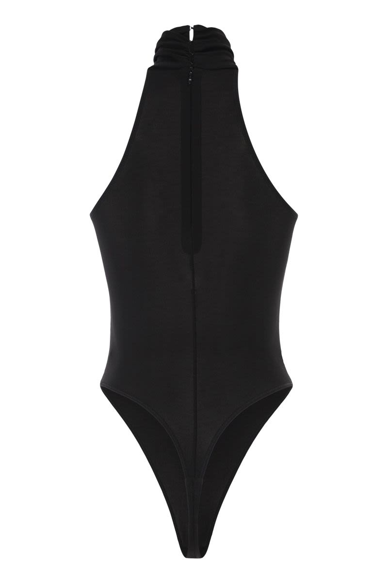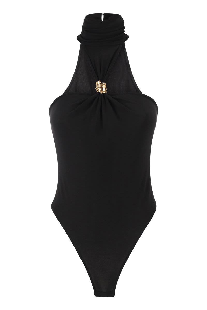 CRêPE JERSEY BODYSUIT WITH A HIGH NECK. THE GARMENT IS EMBELLISHED WITH A GOLD METAL JEWELLED ACCESSORY THAT HOLDS THE NECKLINE IN PLACE. - SLIM FIT - JERSEY LINING - GOLD METAL JEWELLED ACCESSORY - CONCEALED ZIP DESIGNER ID: BO01761E2 110