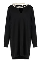 I LIVE IN A BLACK KNITTED SWEATER WITH A SIMPLE AND ELEGANT DESIGN. IT FEATURES LONG SLEEVES, A V-NECK, AND A PEARL NECKLACE THAT ADDS A TOUCH OF STYLE. MADE FROM A SOFT AND COMFORTABLE FABRIC, THIS SWEATER IS PERFECT FOR A CASUAL YET REFINED LOOK.