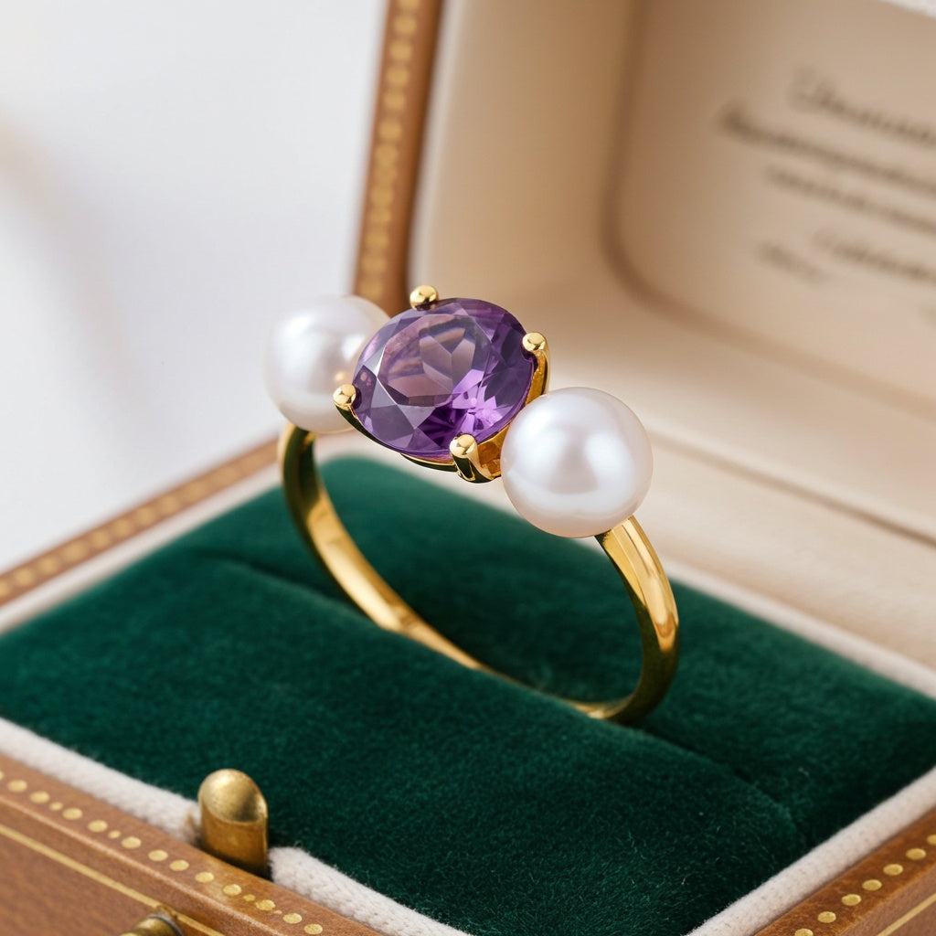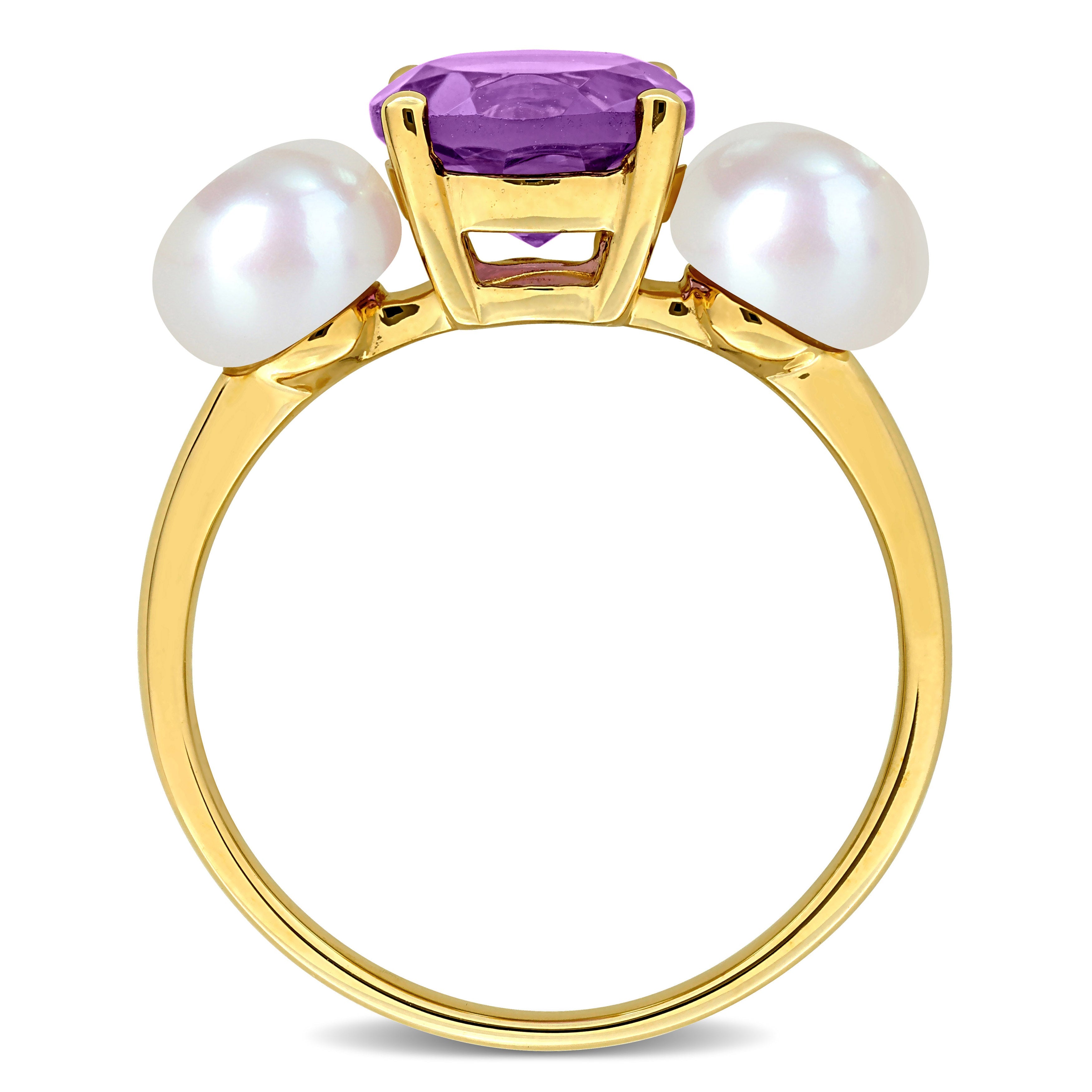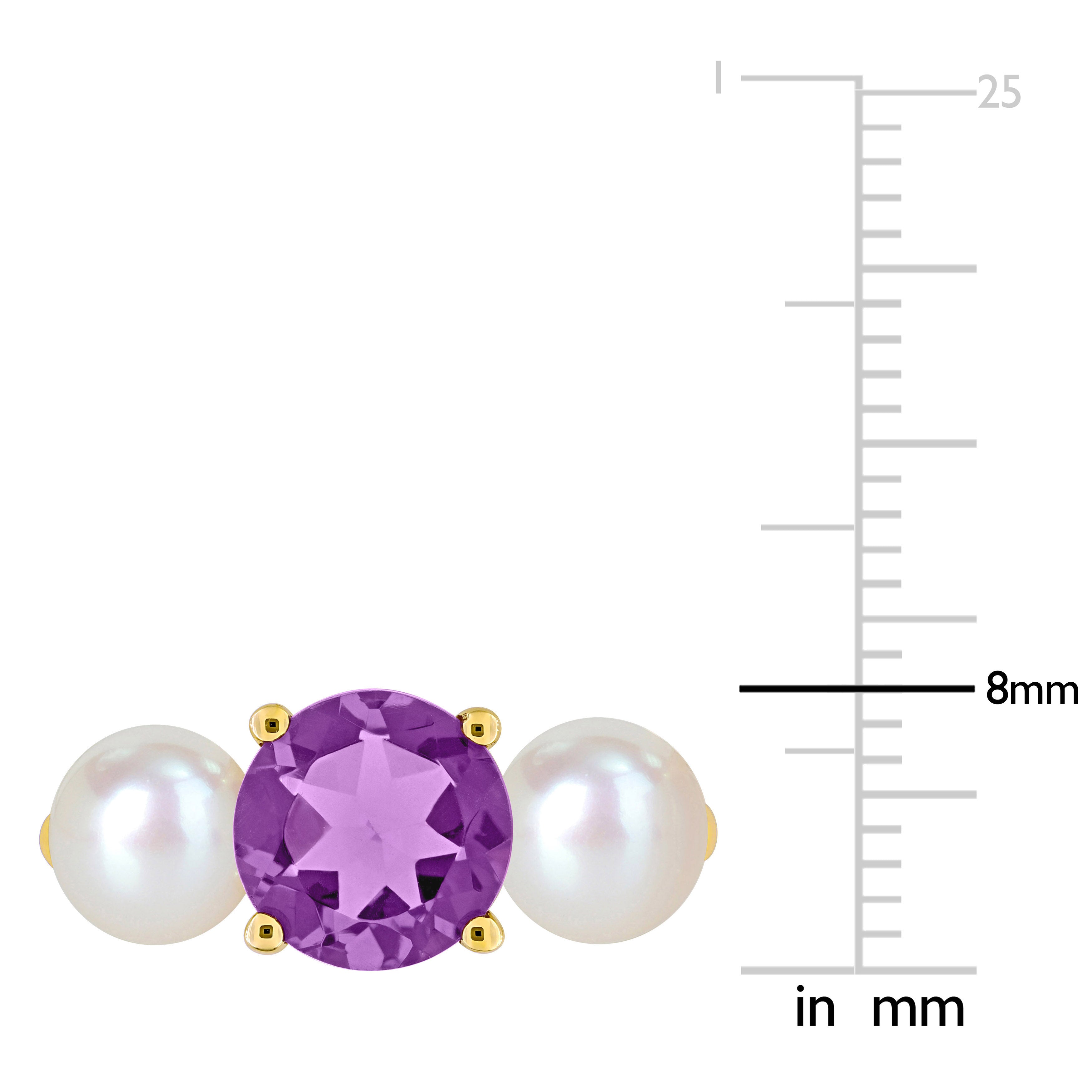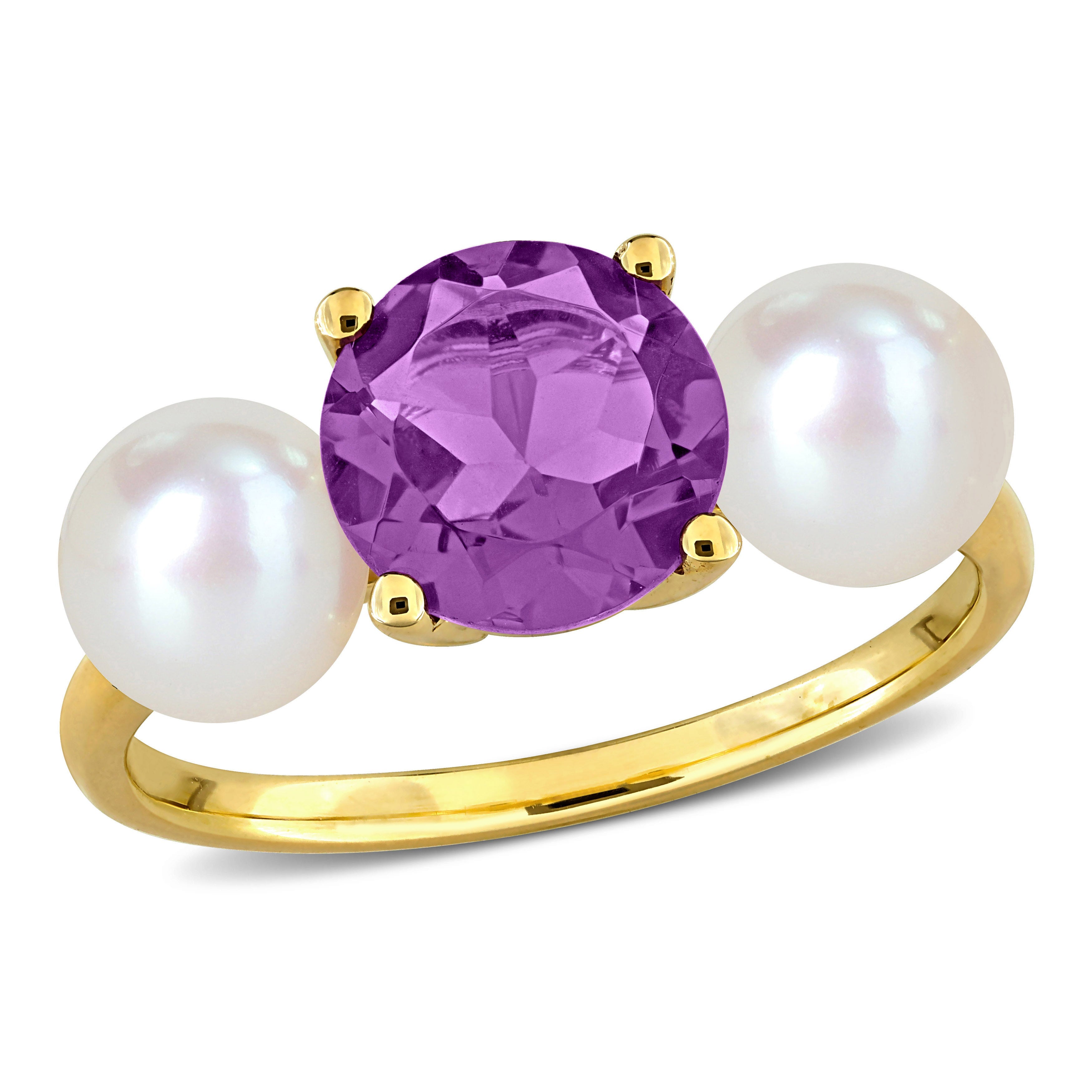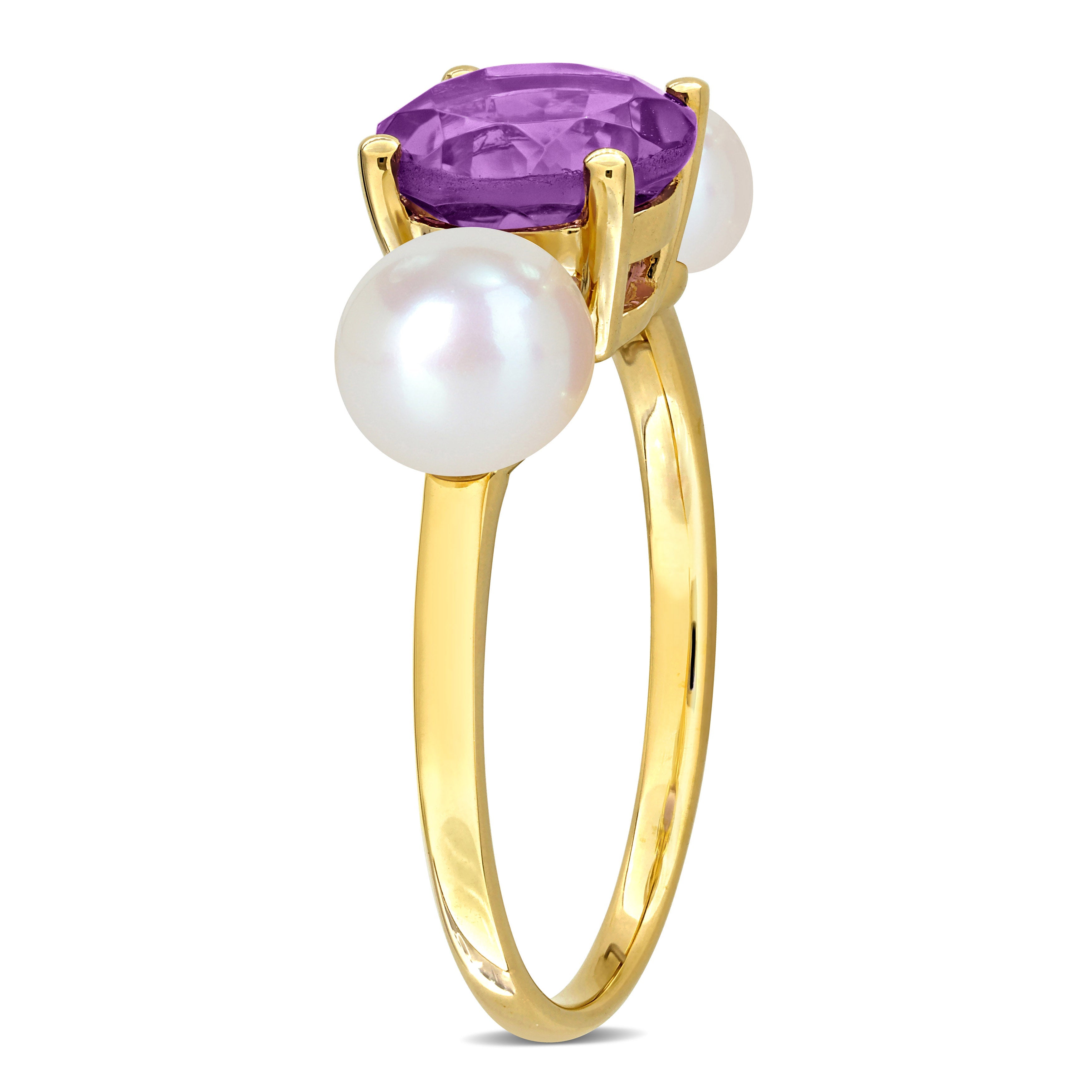 Cultured Freshwater Pearl & Amethyst 3-Stone Ring in 10k Yellow Gold