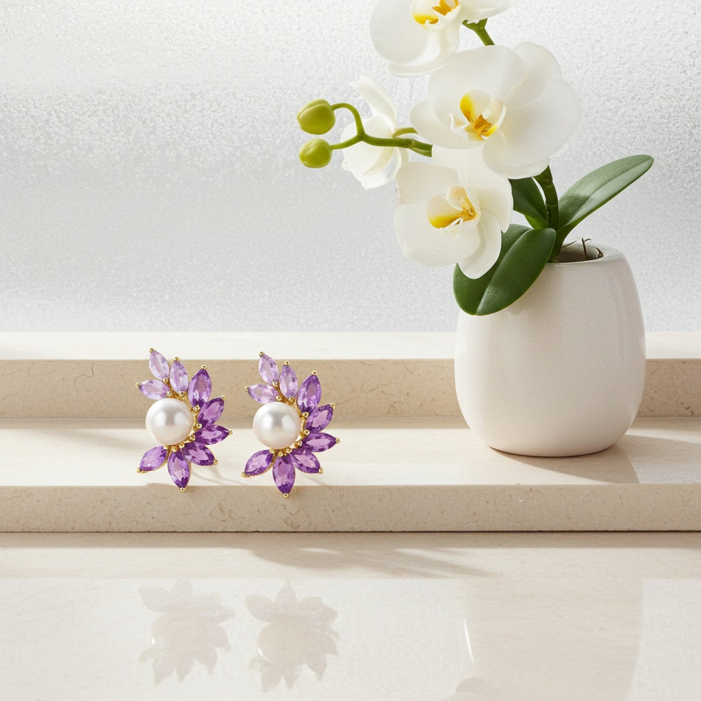 Rich in color and elegant in design, these earrings feature amethyst and Rose de France gemstones, paired with lustrous freshwater cultured pearls. Set in warm yellow silver, this striking combination brings regal purple tones and timeless beauty to any jewelry collection.
