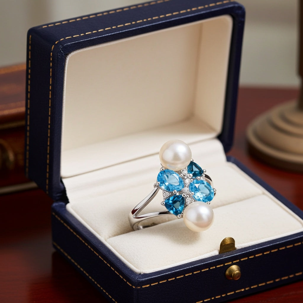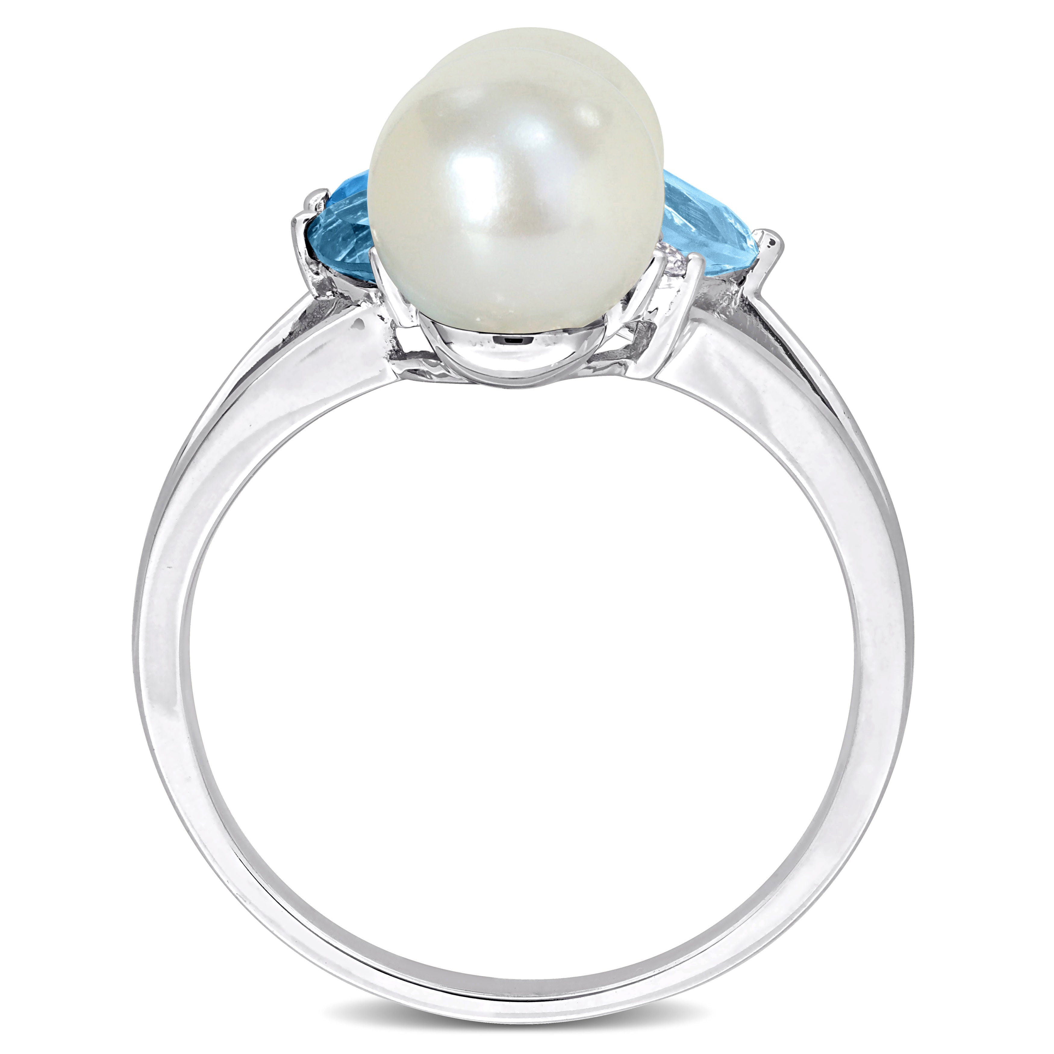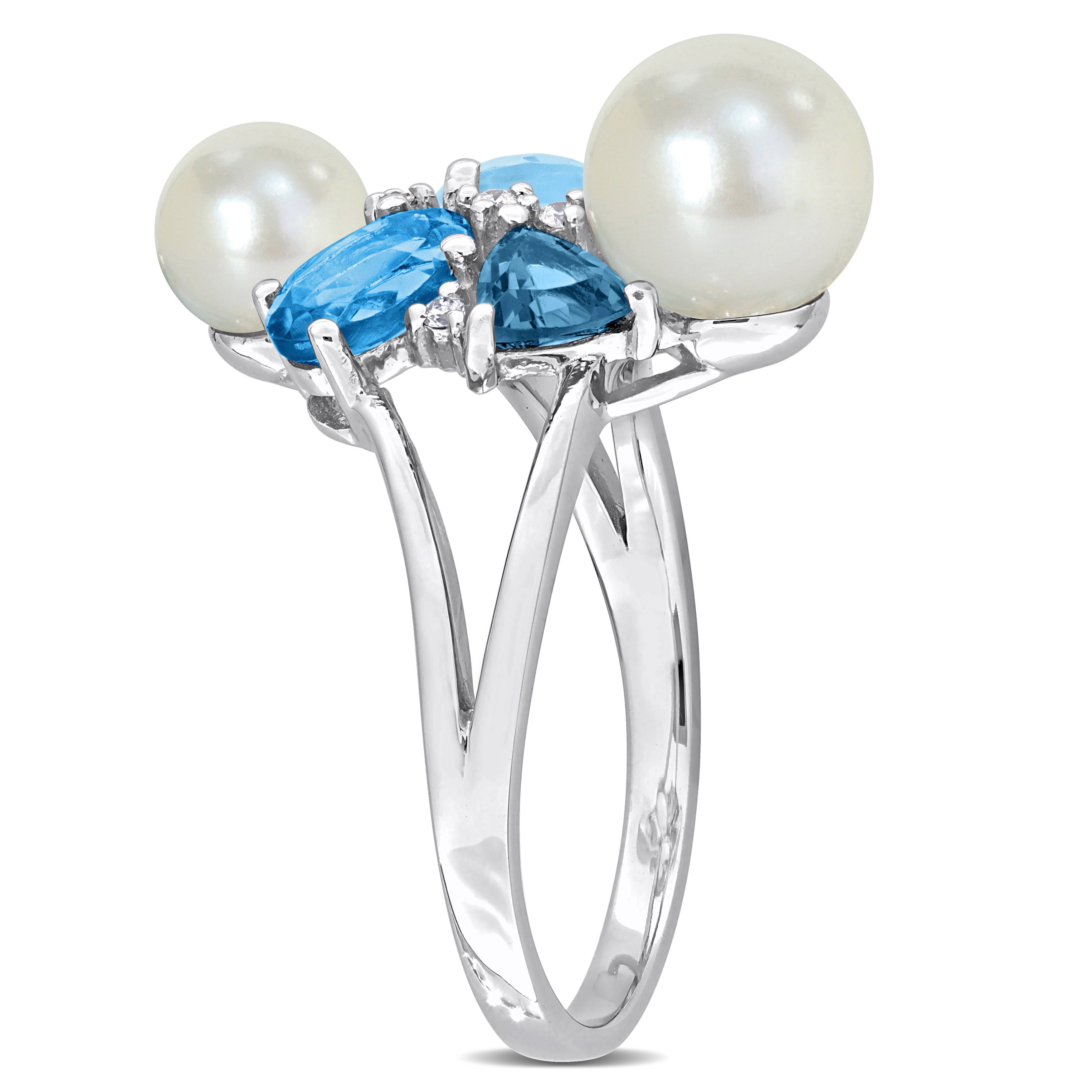 This ring showcases London, Swiss and sky-blue topaz gemstones accompanied with cultured freshwater pearls and diamond accents, all set in 14k white gold. The combination of sparkling topaz, lustrous pearls, and glittering diamonds creates a piece of unmatched beauty and sophistication. It's an ideal accessory for adding a touch of glamour to any outfit.