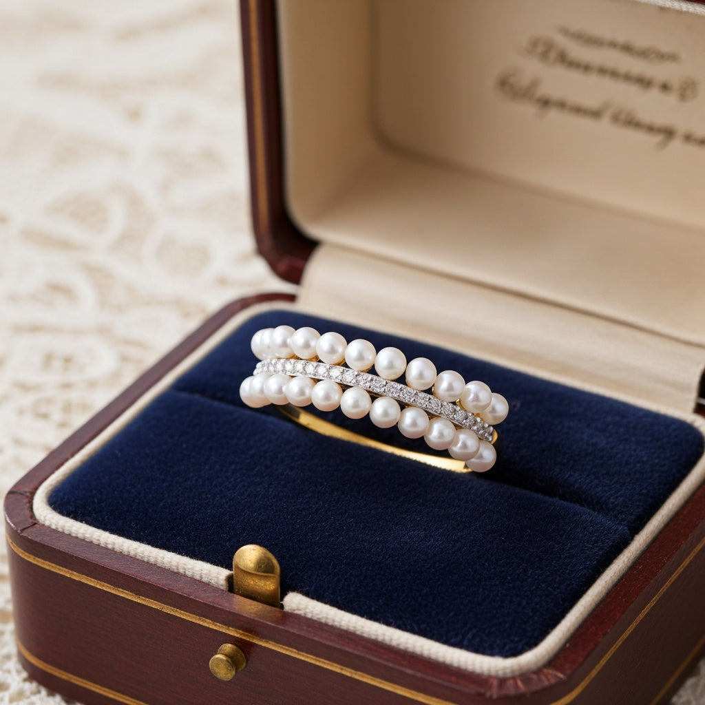 This exquisite ring in 14k yellow gold features two rows of 2-2.5mm cultured freshwater pearls, accented with diamonds, offering a luxurious twist on the classic pearl ring. The combination of lustrous pearls and sparkling diamonds creates an elegant harmony, perfect for special occasions. This sophisticated piece is a testament to timeless style and is sure to be a treasured part of any jewelry collection.
