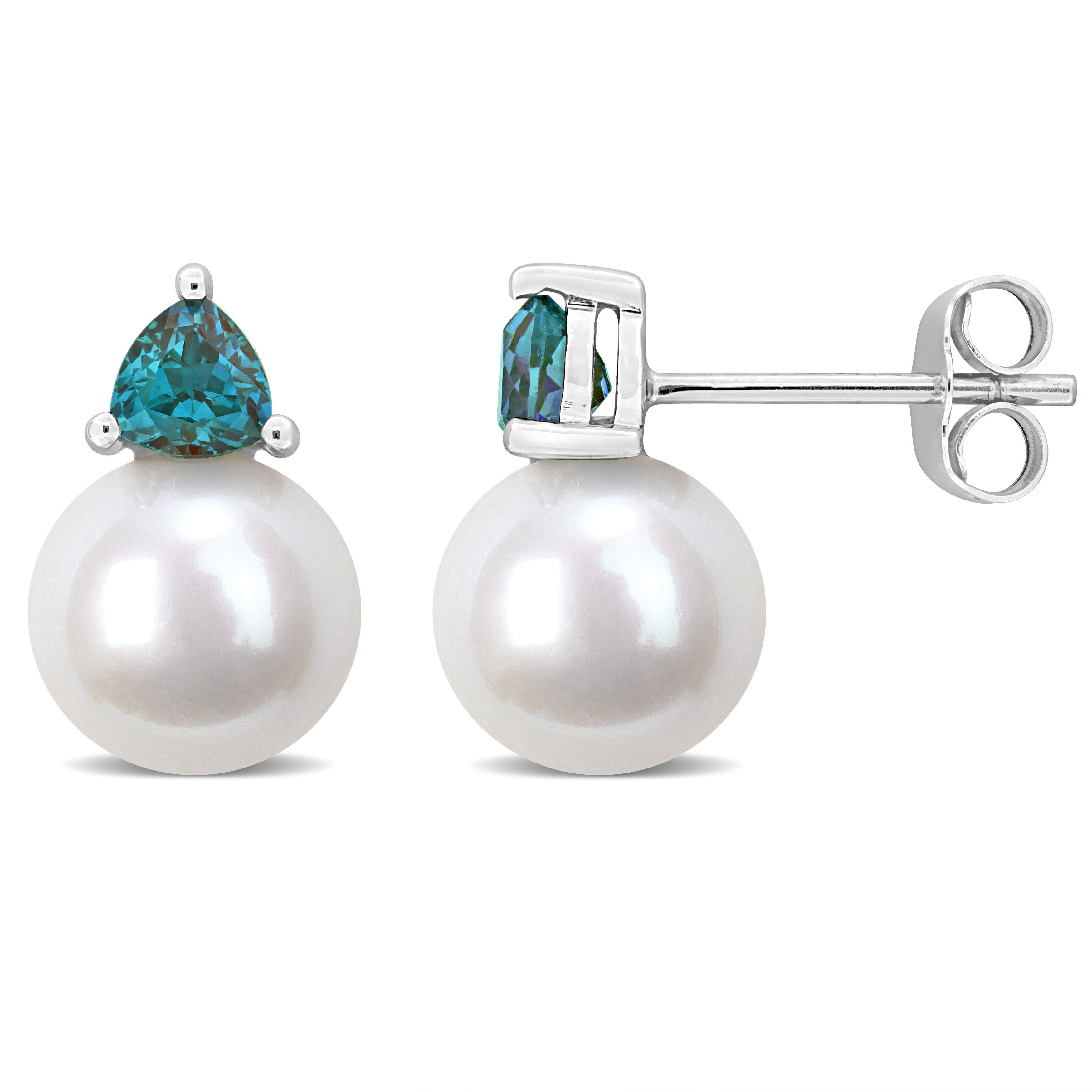 If you adore classic accessories, then these Solitaire Stud Earrings are for you. Crafted in luminous sterling silver, these elegant earrings feature round-shaped cultured freshwater pearls and trilliant-cut 4mm prong-set gemstones. Polished to brilliance, these splendid earrings are comfortably secured with post butterfly closures.