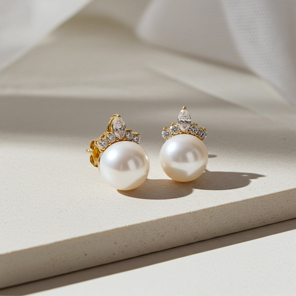 Add a touch of elegance to your collection with these exquisite stud earrings, featuring Cultured Freshwater Pearls. Set in 14k Yellow Gold, the earrings are adorned with dazzling marquise and round cut diamonds, creating a timeless and sophisticated design. Perfect for any occasion, these earrings effortlessly blend luxury and style.