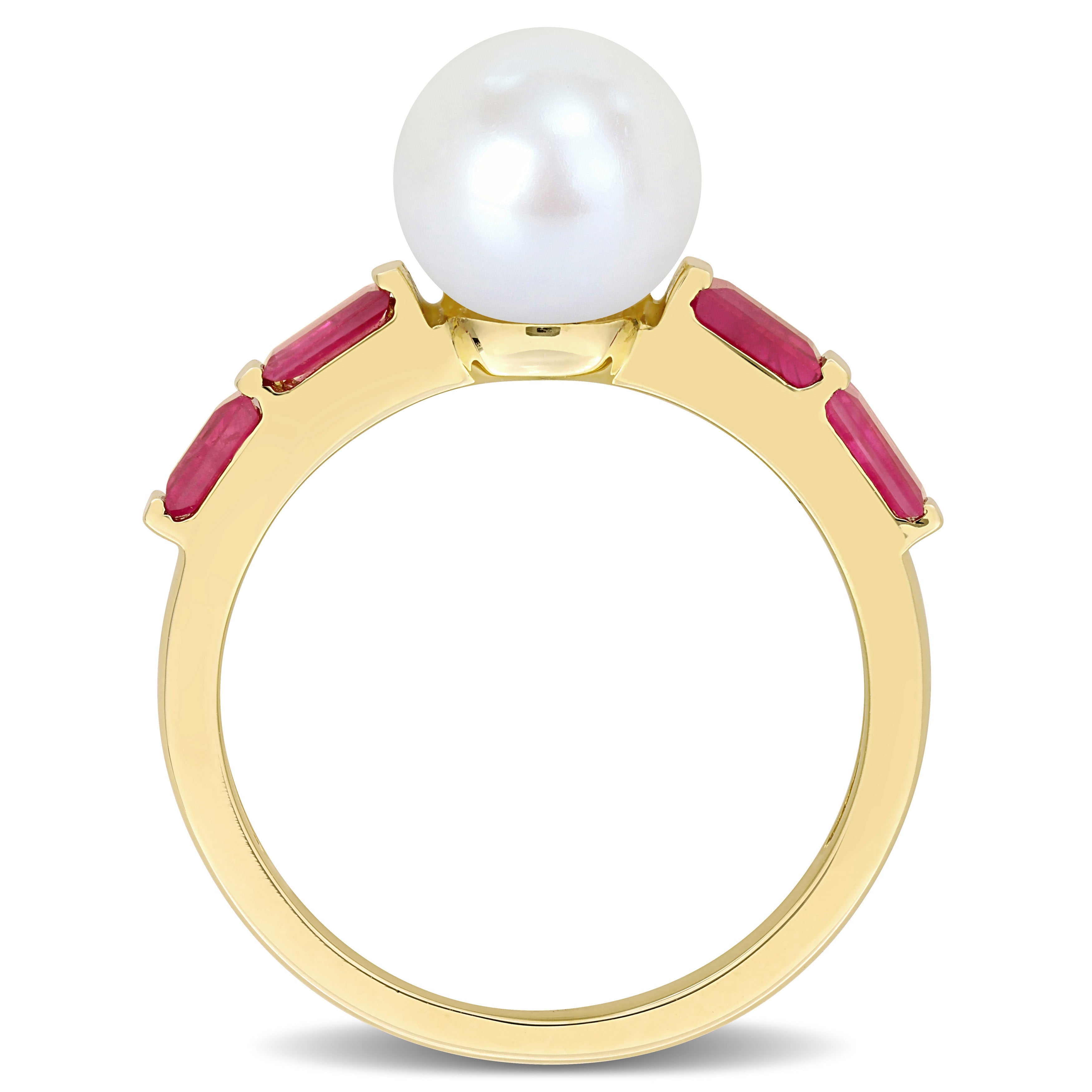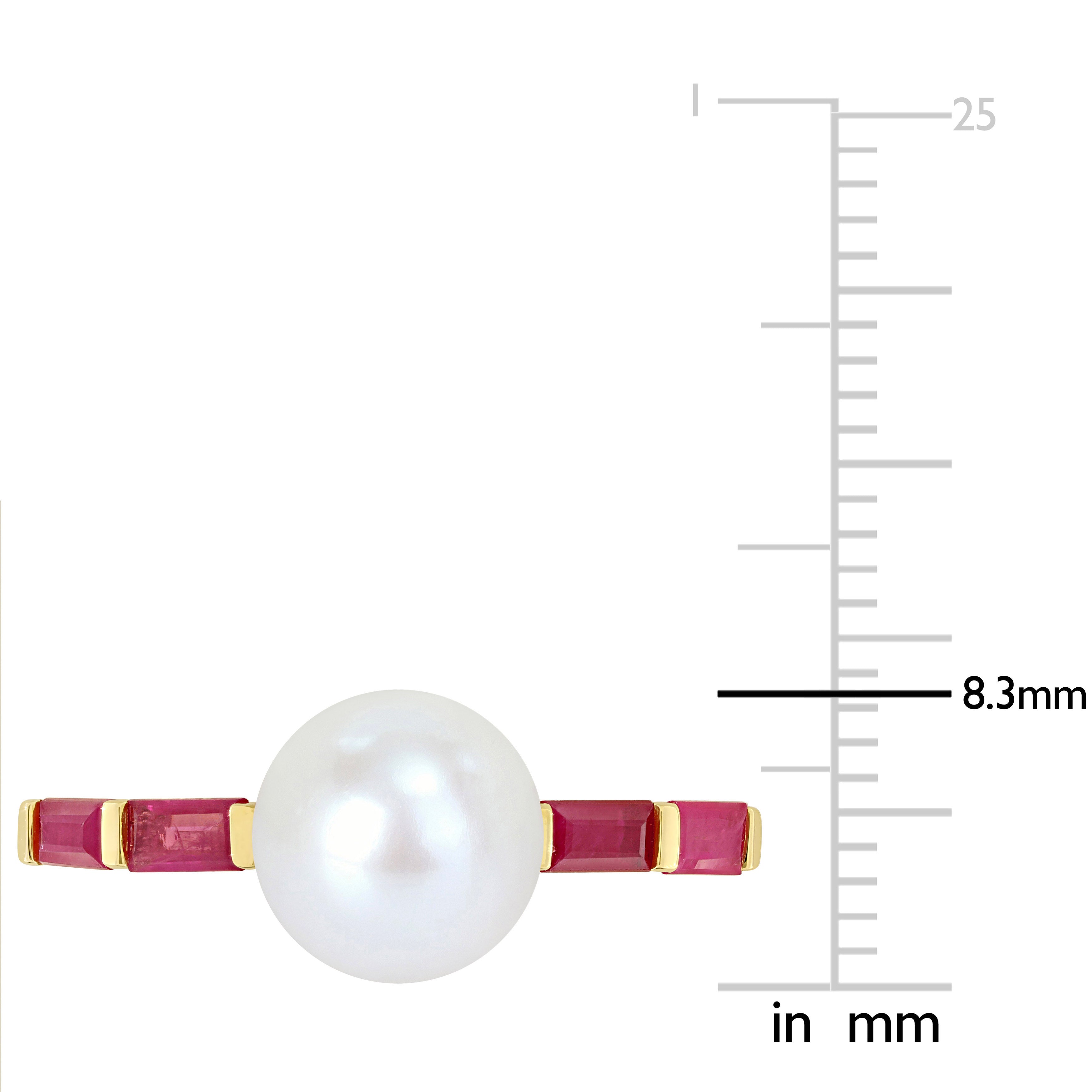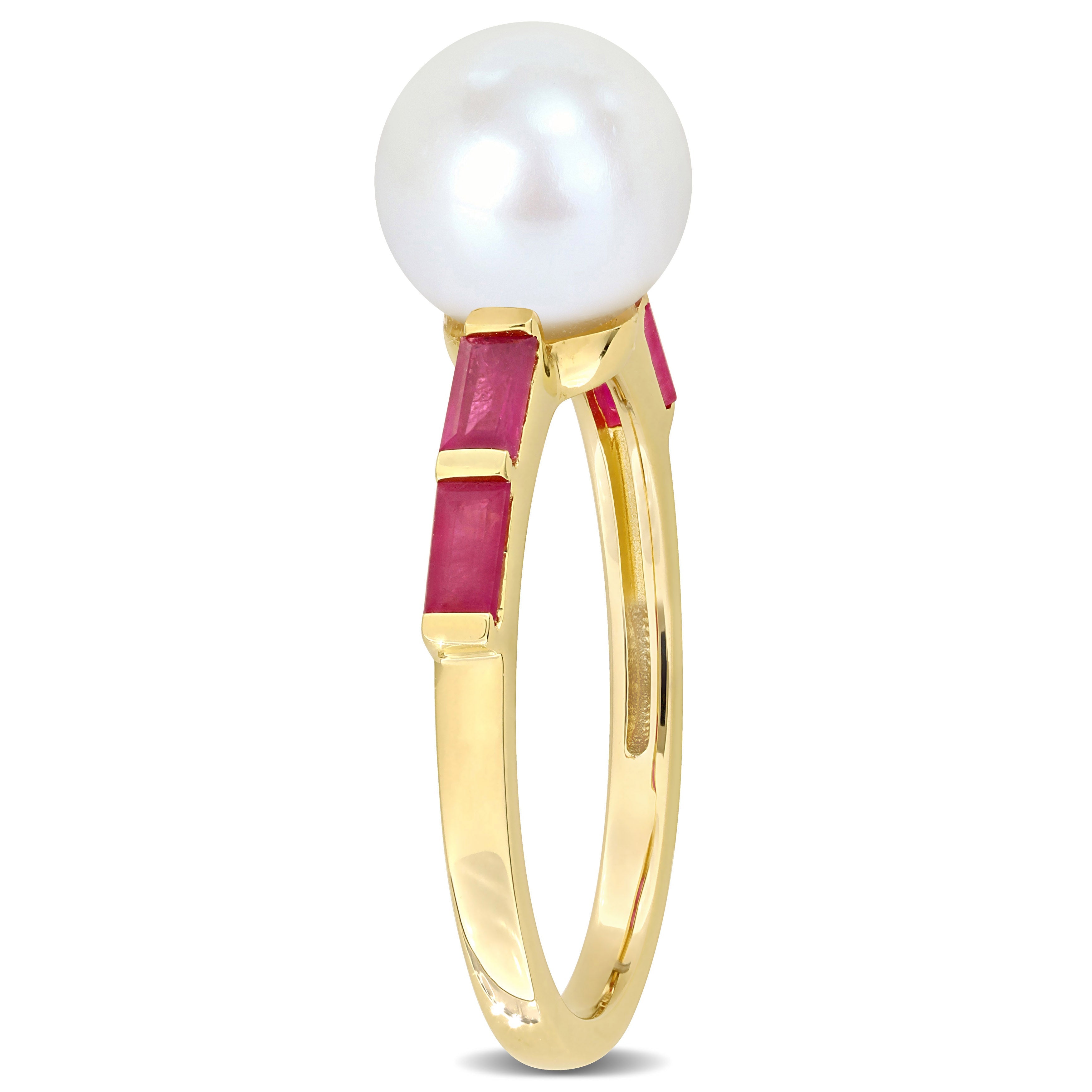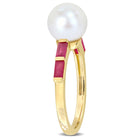Indulge in the captivating beauty of this Pearl and Gemstone Ring. Crafted in 10k gold, this ring combines the timeless elegance of a white freshwater cultured pearl with the fiery allure of gemstones. At the center of attention is an exquisite white freshwater cultured pearl, renowned for its radiant luster and natural grace. Flanking the pearl are mesmerizing baguette-shaped gemstones, adding a burst of rich color and enhancing the ring's overall sophistication. The design of this ring is minimalist and stackable, allowing you to express your unique sense of style and create your own personalized look.
