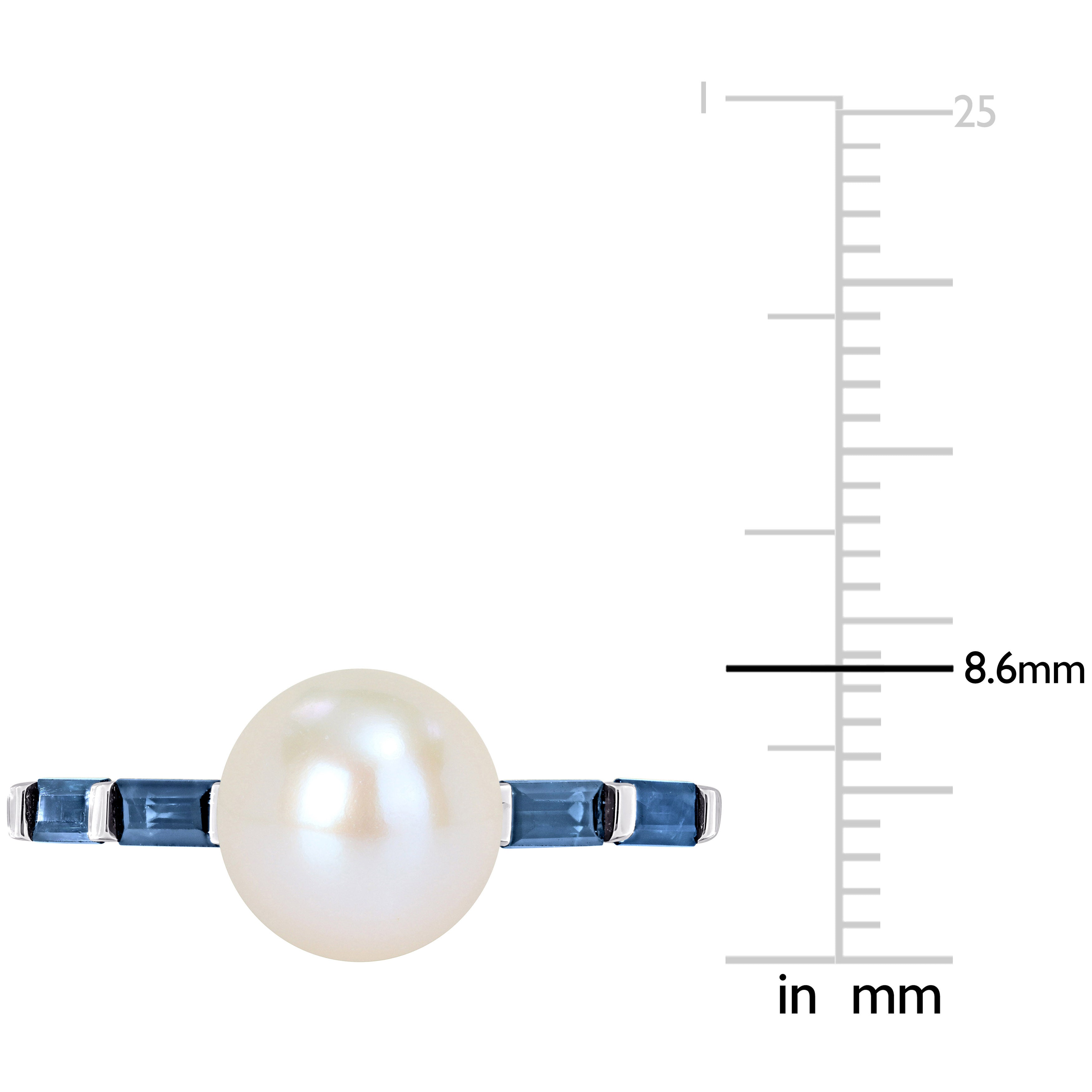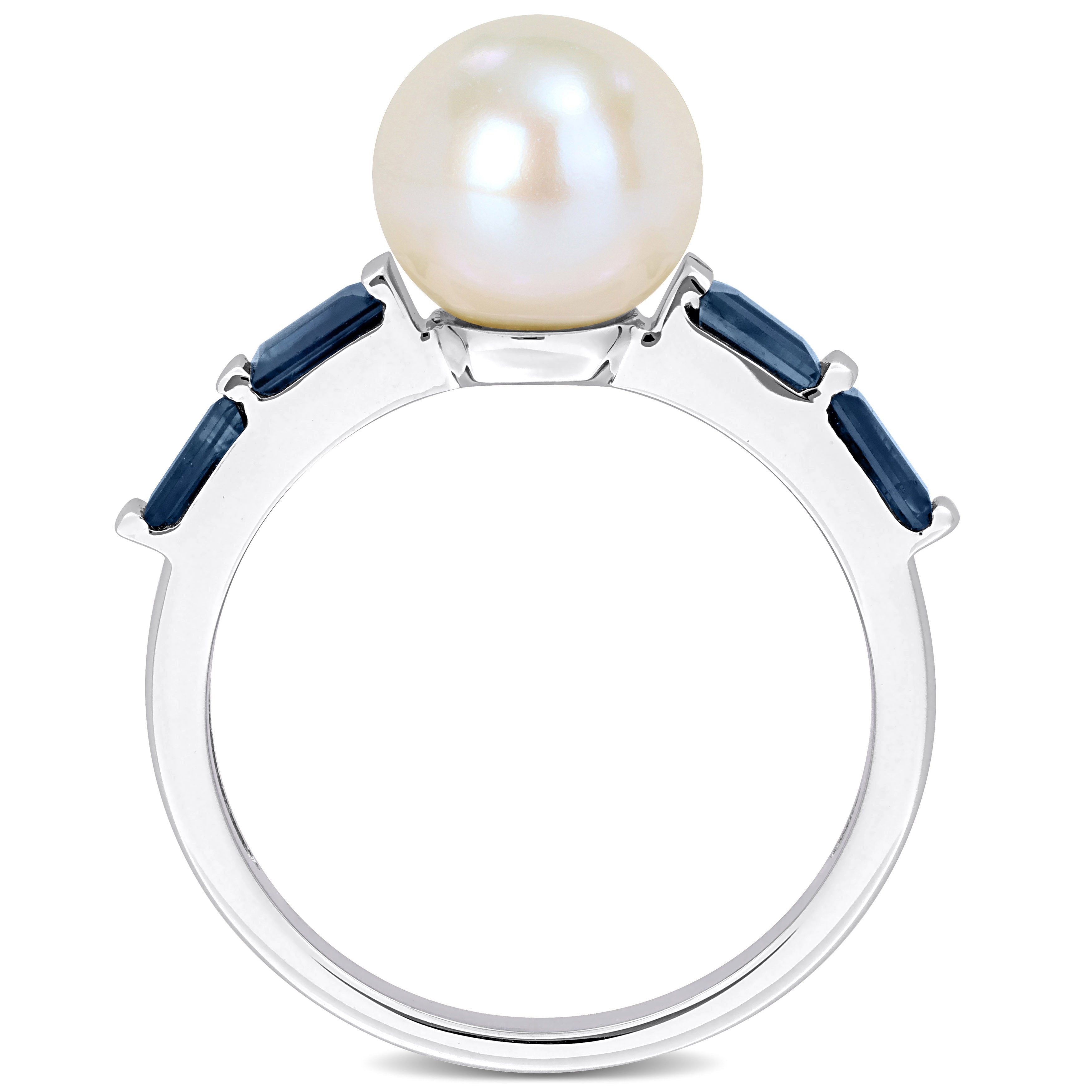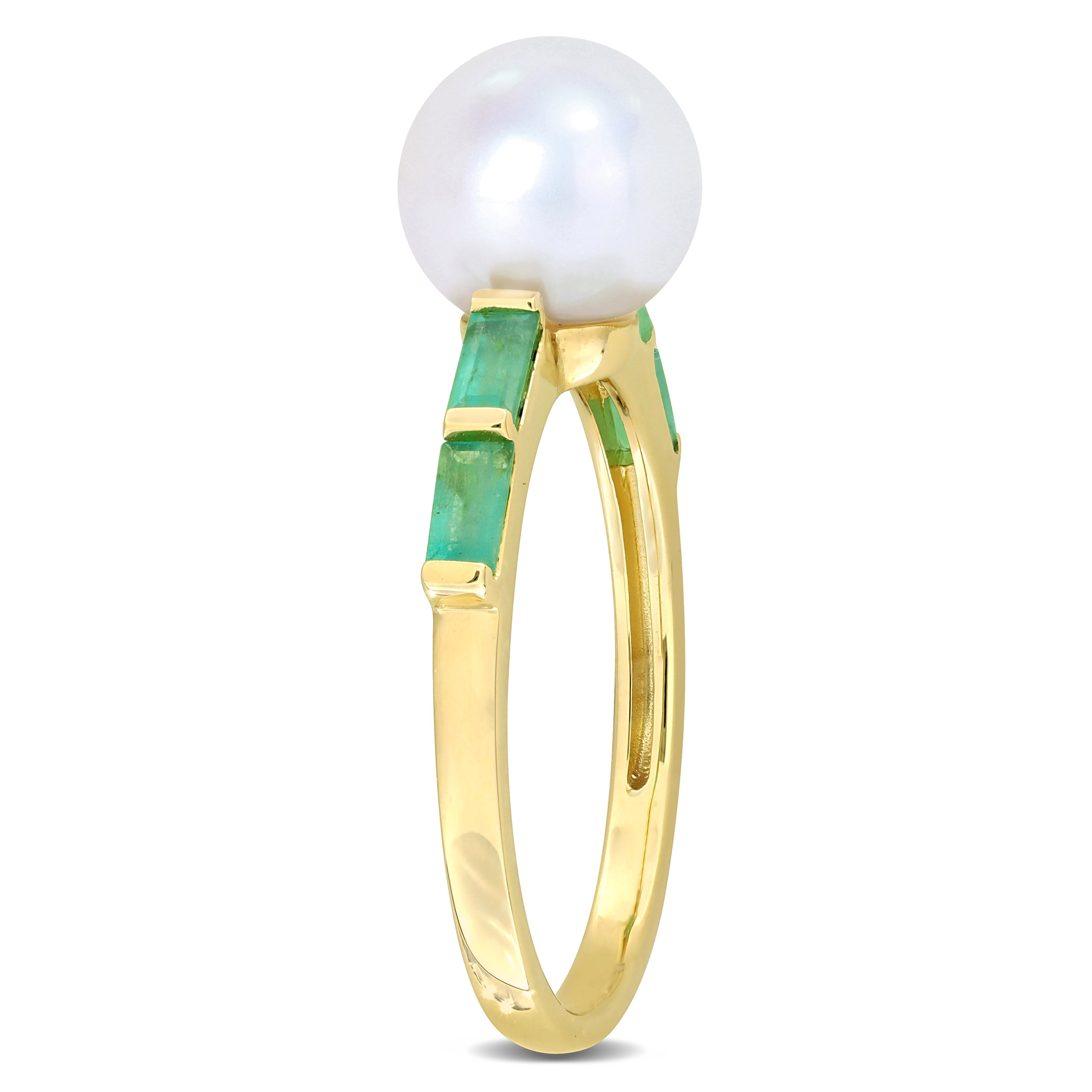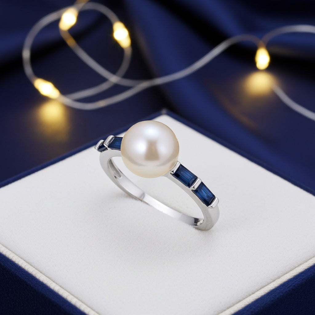 Indulge in the captivating beauty of this Pearl and Gemstone Ring. Crafted in 10k gold, this ring combines the timeless elegance of a white freshwater cultured pearl with the fiery allure of gemstones. At the center of attention is an exquisite white freshwater cultured pearl, renowned for its radiant luster and natural grace. Flanking the pearl are mesmerizing baguette-shaped gemstones, adding a burst of rich color and enhancing the ring's overall sophistication. The design of this ring is minimalist and stackable, allowing you to express your unique sense of style and create your own personalized look.