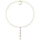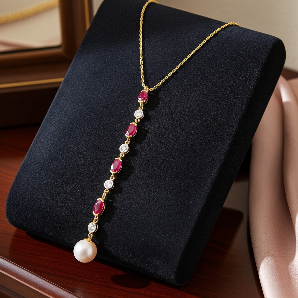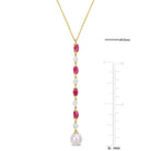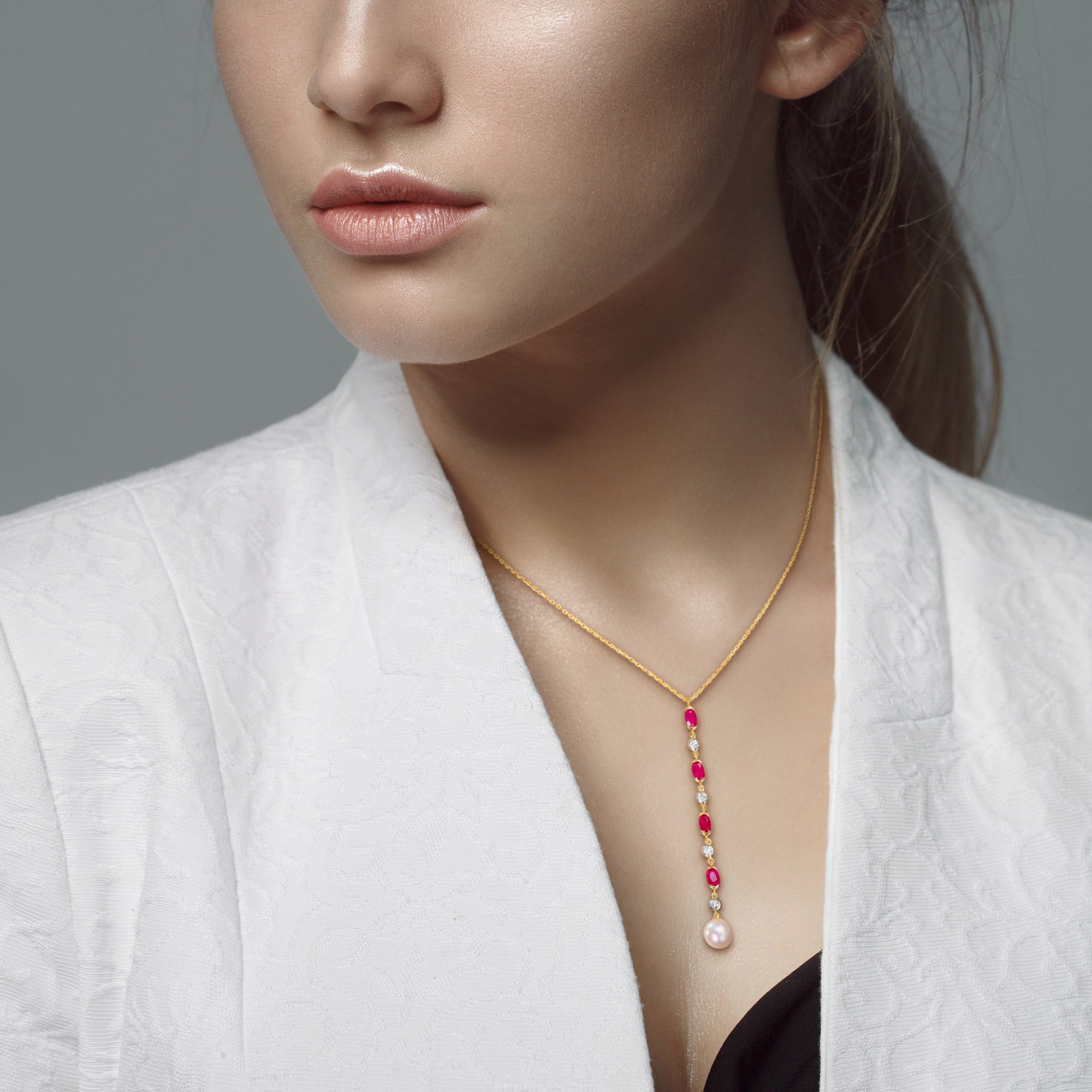 Presenting the exquisite Ruby and Freshwater Pearl with Diamond Necklace. This captivating piece seamlessly combines the elegance of diamonds, the allure of rubies, and the timeless beauty of freshwater cultured pearls. Crafted in lustrous yellow gold, it features oval-cut, bezel-set rubies and freshwater cultured pearls with 4 round-cut, bezel-set diamonds in a lariat designed. Whether given as a gift or acquired as a personal treasure, this necklace promises to leave a lasting impression and become a cherished heirloom for generations to come.
