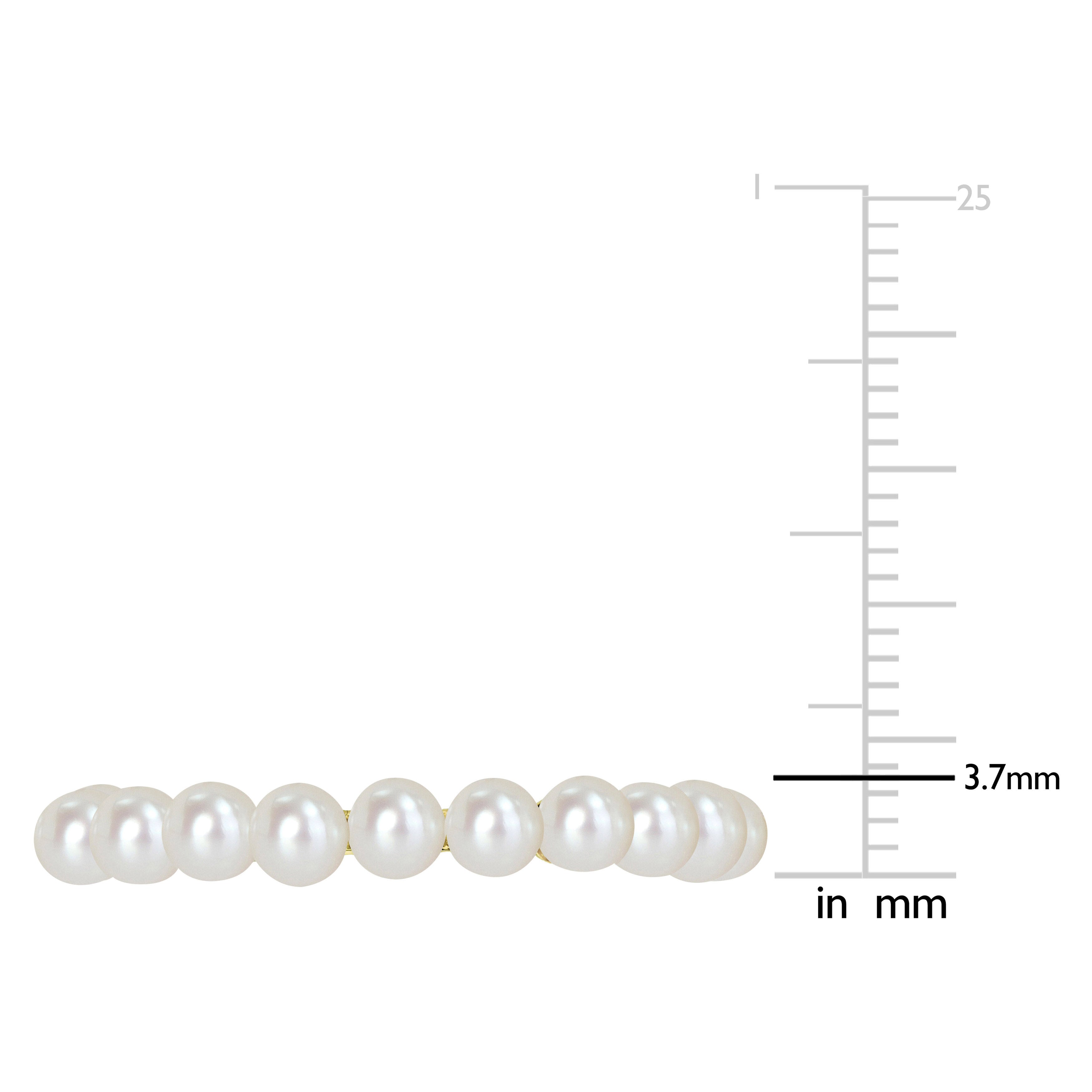 This pretty single row ring is crafted in 14k yellow gold and features round-shaped, freshwater cultured white pearls mounted on the delicate band. Enhanced with a polished finish, this eye-catching ring is perfect to wear on dressy occasions. Add a feminine touch to your look with this ring.